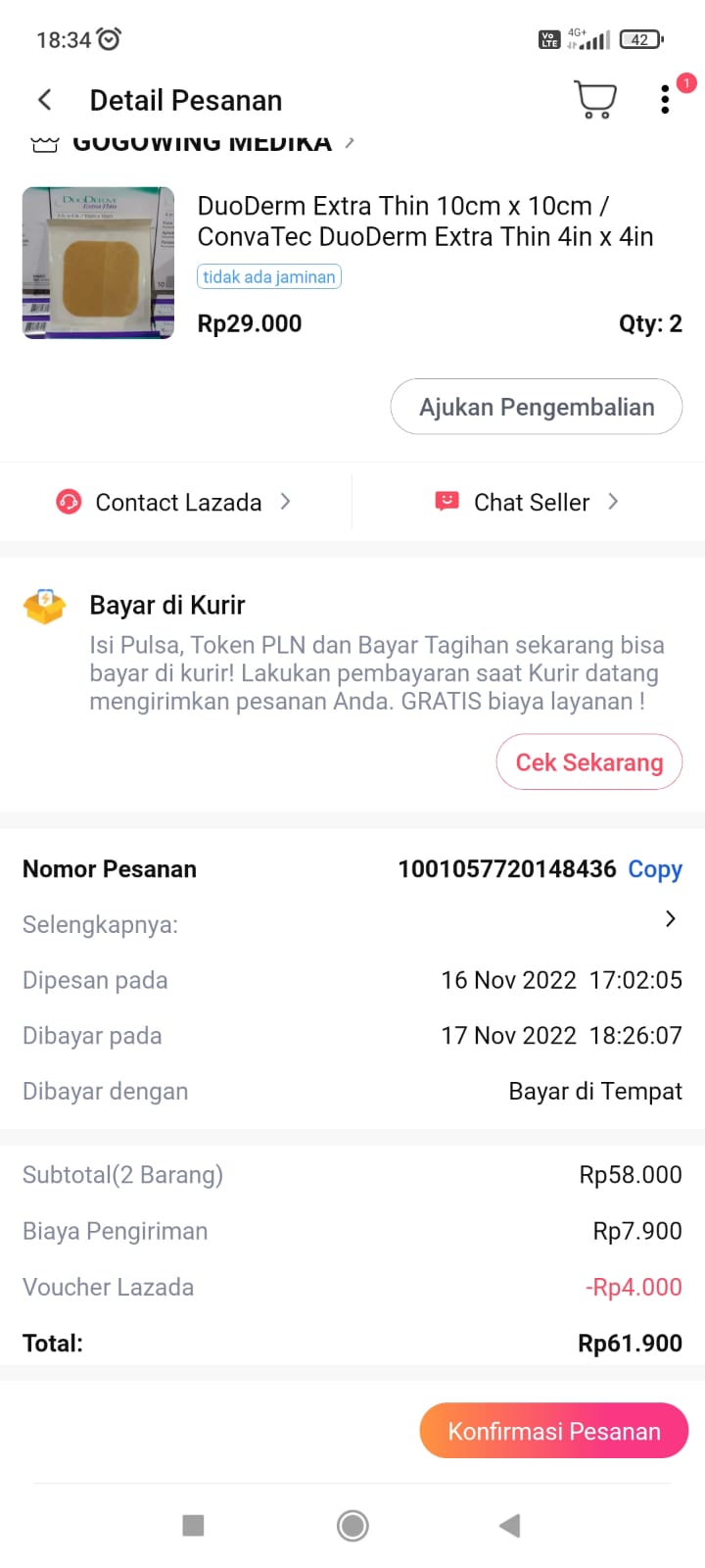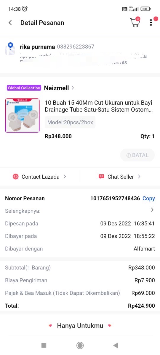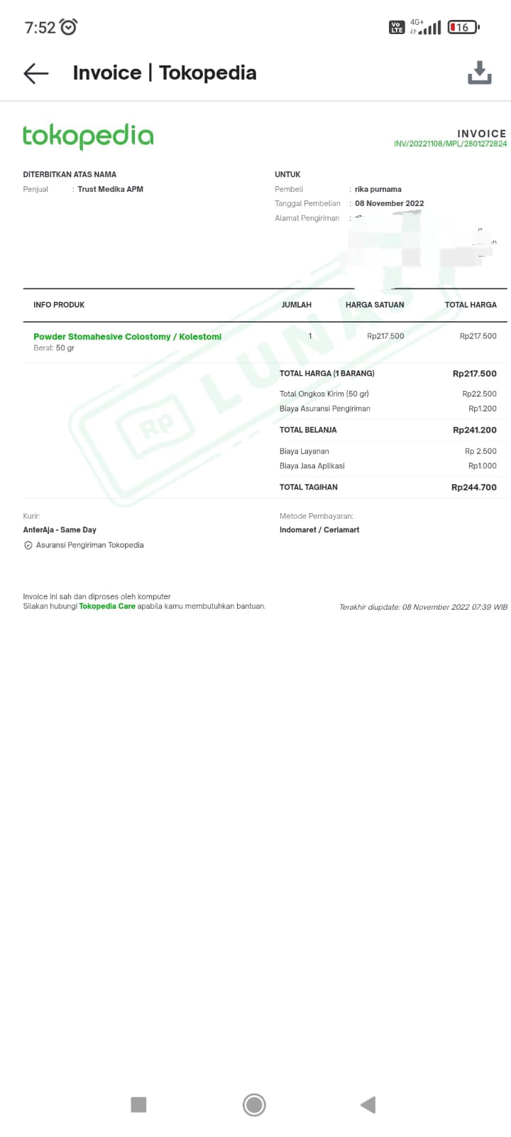 Dana digunakan untuk 1. Kantong colostomi 20 pcs Rp424.900 2. Pampers 3 ball Rp153.000 3. Plester hypafix 2 kotak Rp154.500 4. Pasta colostomi 1 pcs Rp346.000 5. Pembayaran iuran BPJS Rp142.500 6. Tisu kering 4 pack Rp38.000 7. Tisu basah 4 pack Rp60.000 8. Micropore 2,5 cm x 9,1 m 4 pcs ukuran sedang Rp80.000 9. Cathejell 2 kotak Rp105.600 10. Sarung tangan steril 2 kotak Rp165.800 11. Lacto B 10 pcs Rp80.000 12. Biaya transportasi bensin motor 30.000 x 8= Rp240.0002022-12-07 18:06:21