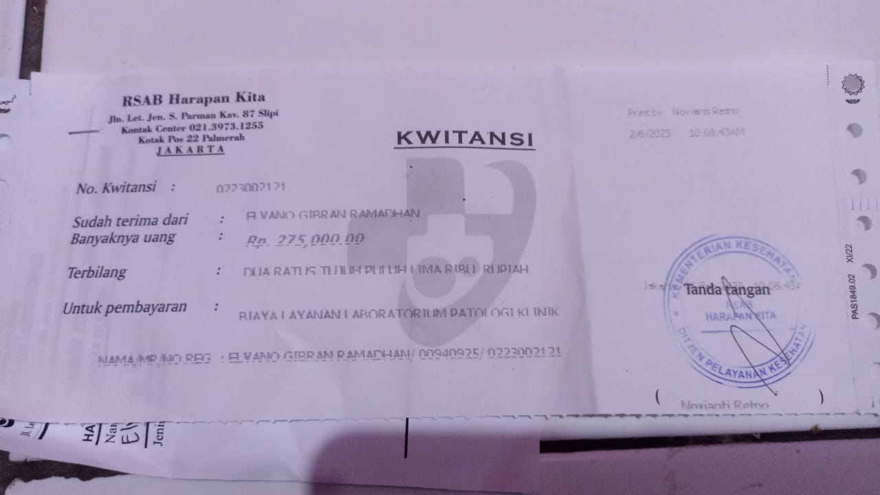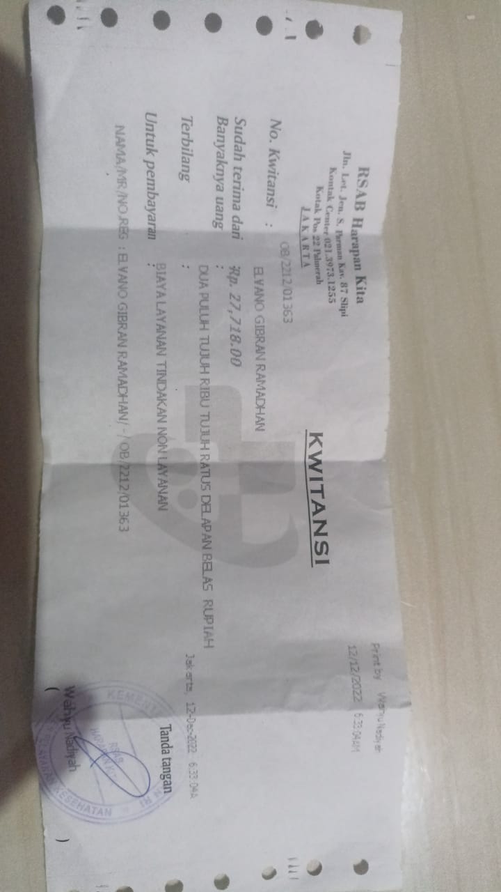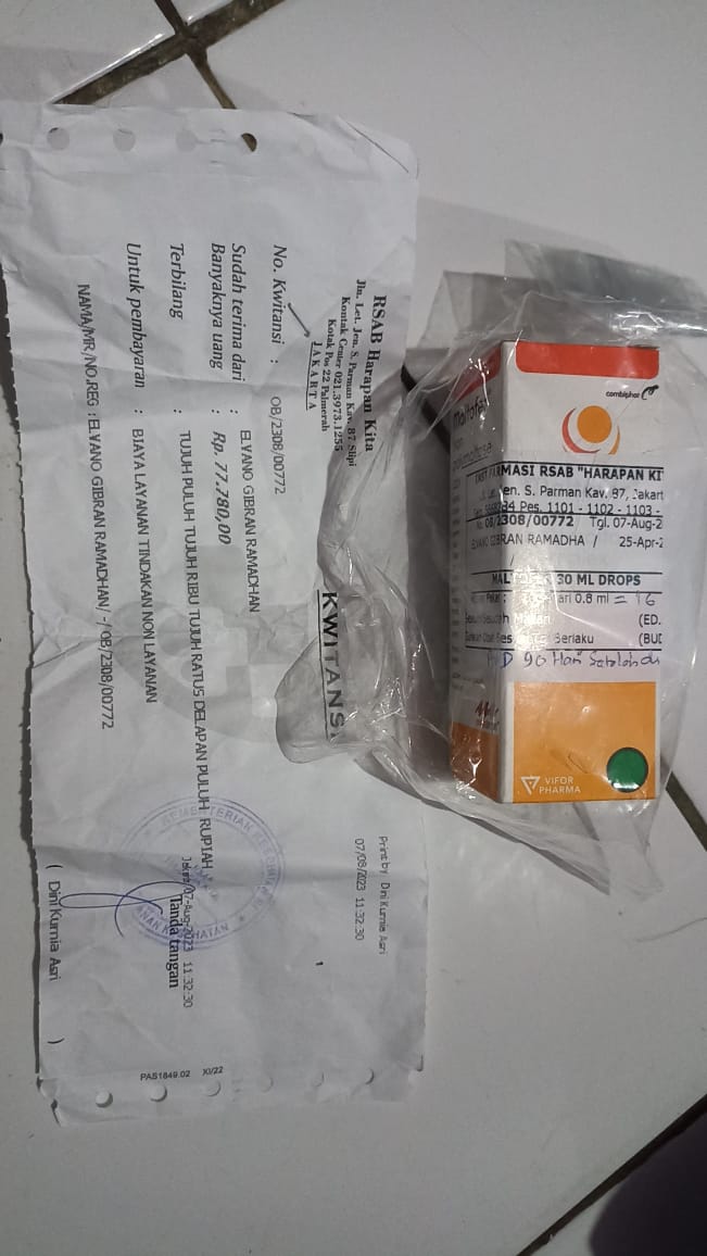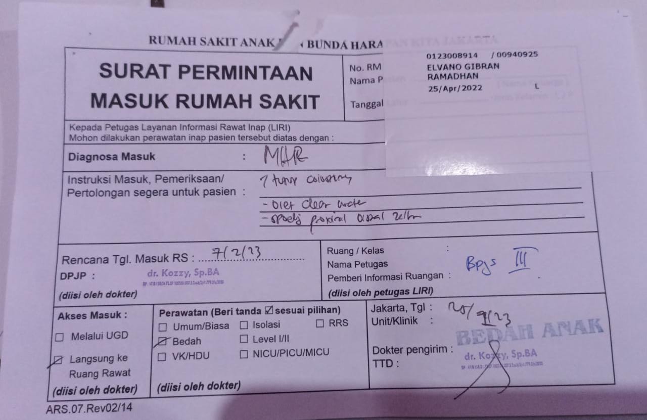 Alhamdulillah Alvino menjalani pemeriksaan dan pengobatan di RSAB Harapan Kita. Dokter mengatakan kalau kondisinya harus secepatnya dibuatkan kolostomi.
