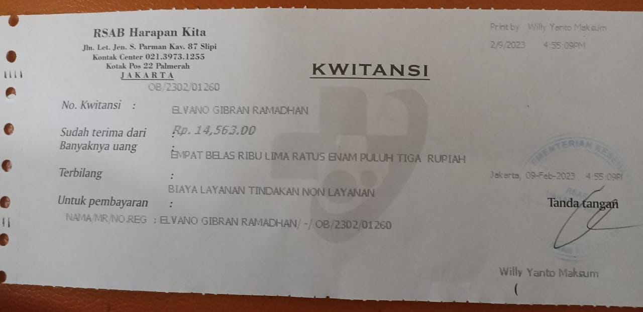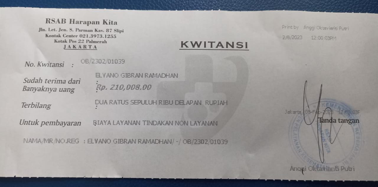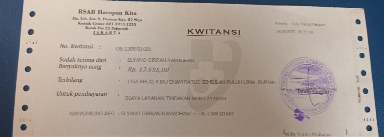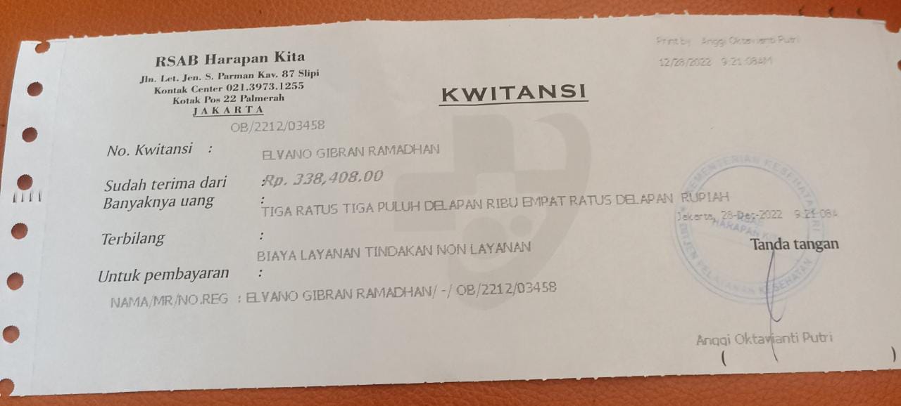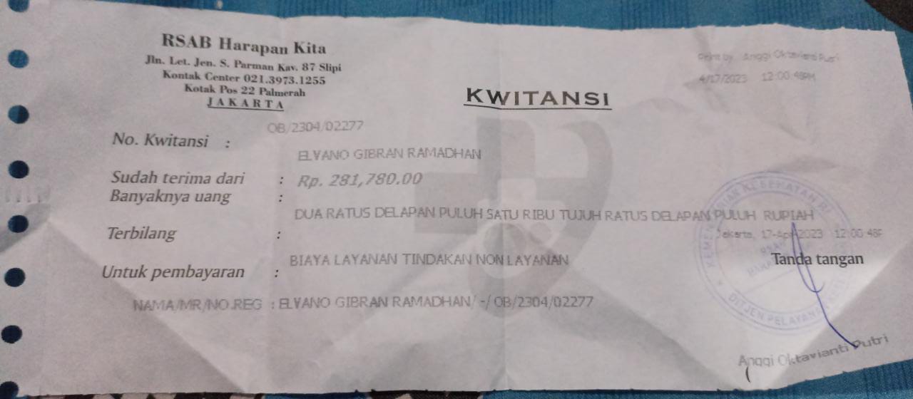 Elvano masih tetap harus kontrol rutin di RSAB Harapan Kita untuk memastikan lubang anusnya sempurna dan harus dibusi ke rumah sakit seminggu sekali.