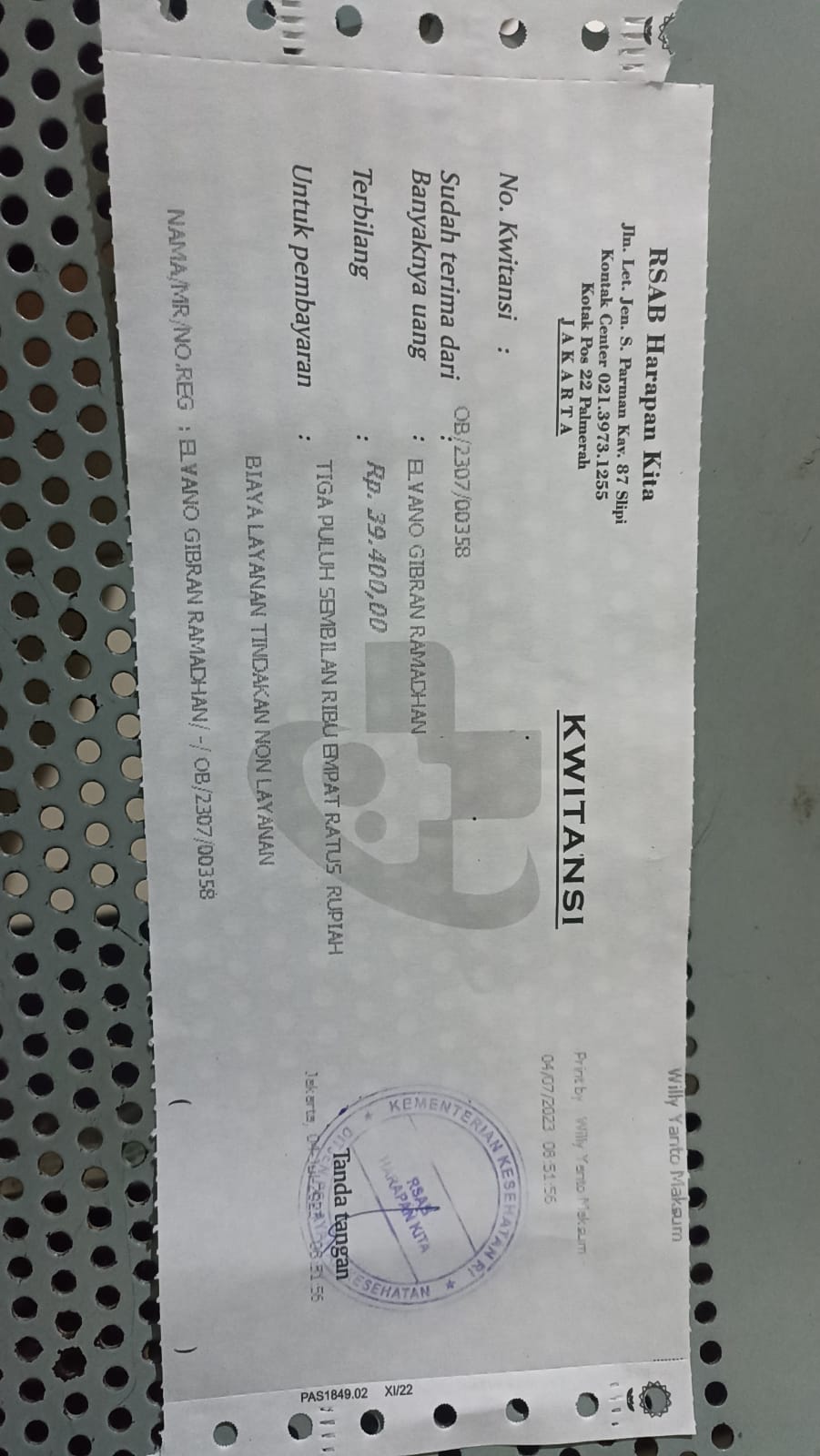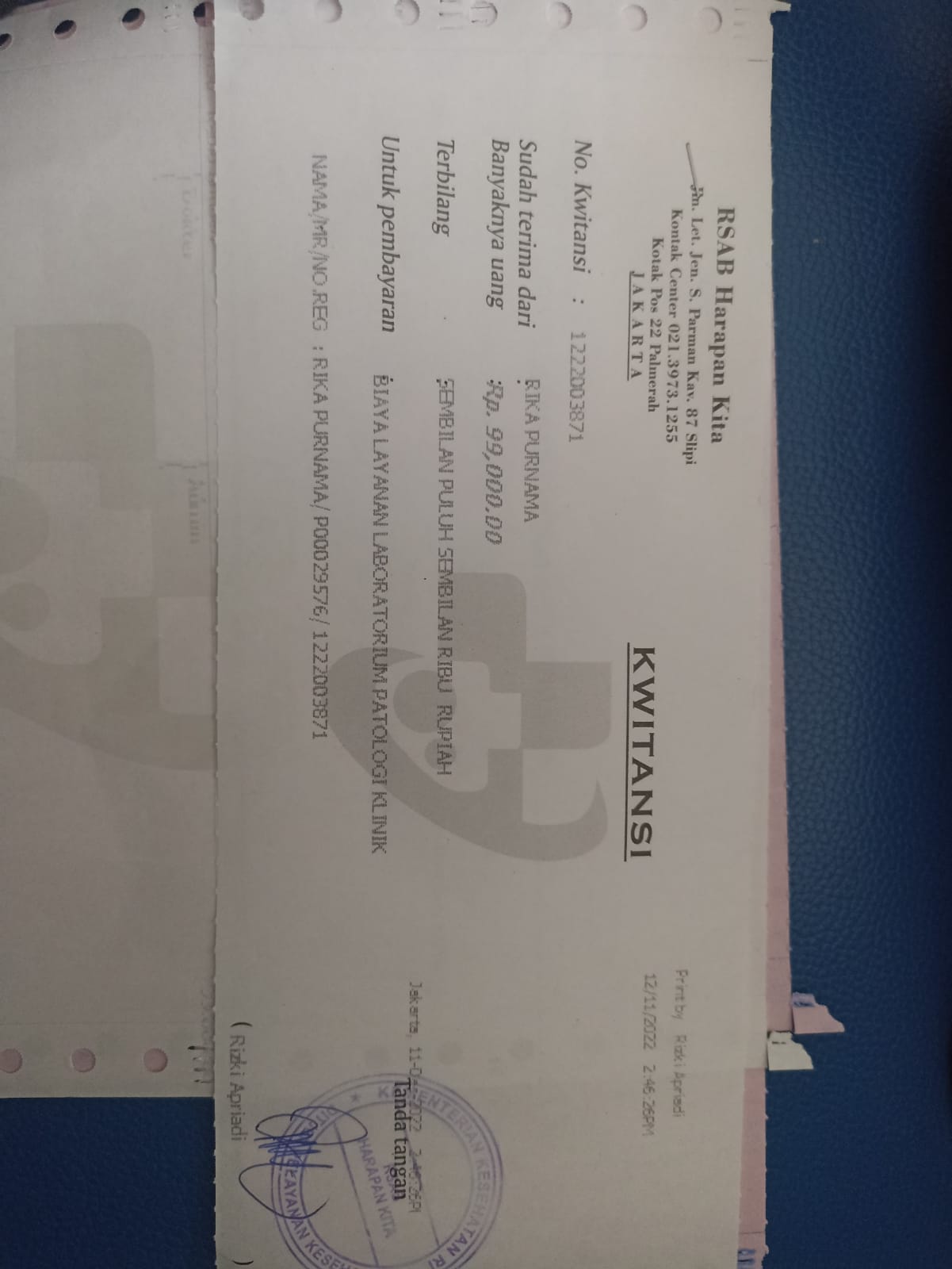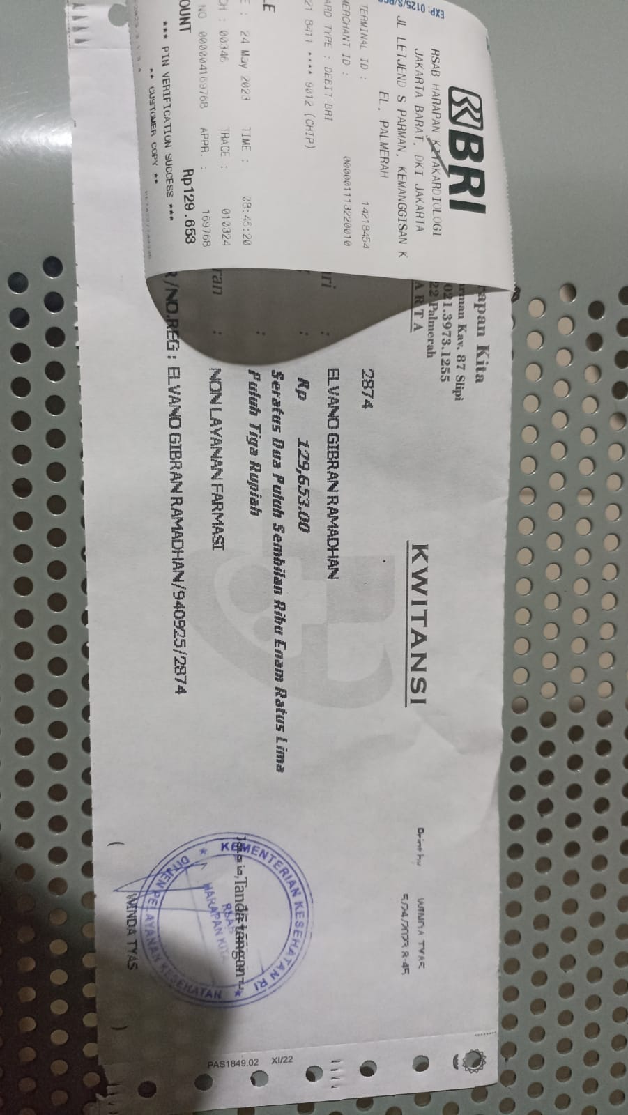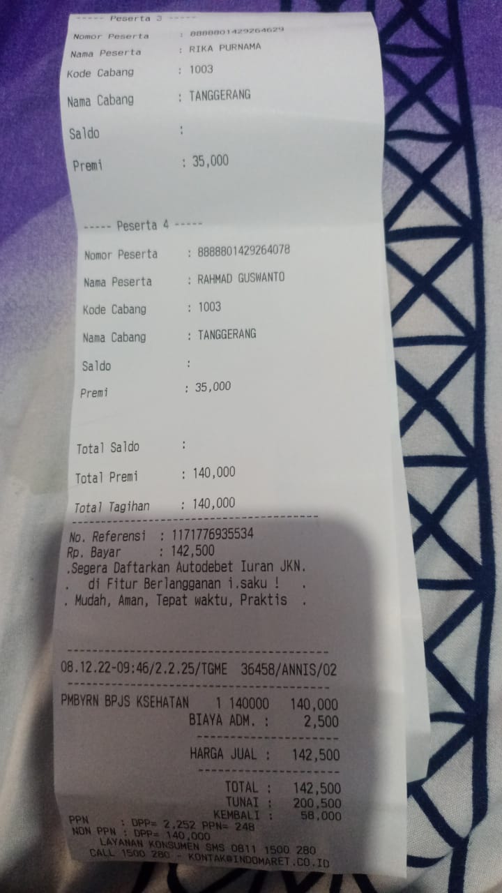 Dana digunakan untuk 1. Pampers perekat 107.000 x 6= Rp642.000 2. Pampers celana 89.000 x 6= Rp534.000 3. Kapas bola 16.000 x 15 ball= Rp240.000 4. Bepathen 68.000 x 3 pcs= Rp240.000 5. Tisu kering 9.000 x 6 pcs= Rp54.000 6. Tisu basah 17.000 x 6 pcs= Rp102.000 7. Pembelian obat-obatan yang tidak dicover BPJS Rp800.000 8. Biaya makan pendamping Rp300.000 9. Biaya transportasi2023-08-24 17:38:55