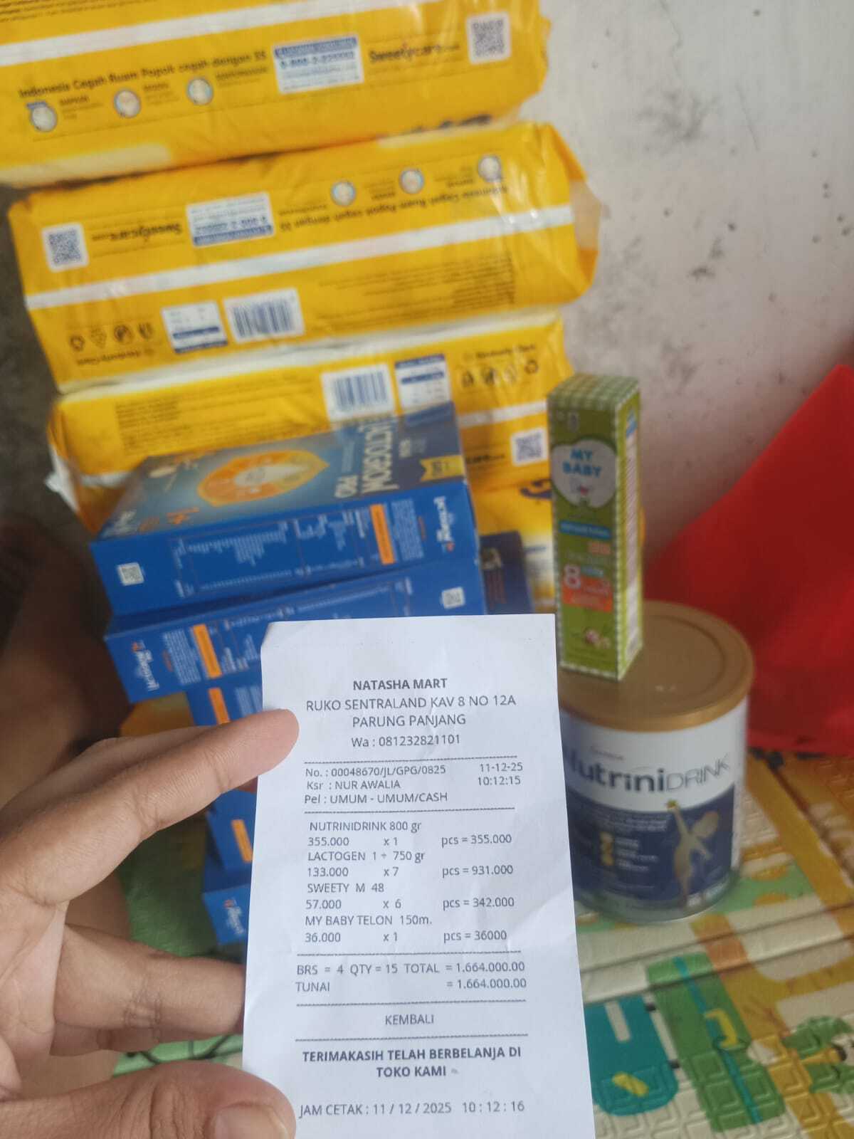 Dana digunakan untuk 1. Susu lactogen Rp175.000 × 5dus = Rp875.000 2. Pampers babyhappy UK m Rp52.000 × 5ball = Rp260.000 3 .Tisu basah Rp15.000 × 5pack = Rp75.000 4. Tisu kering Rp17.000 × 5pack = Rp85.000 5. Selang NGT silicon Rp56.000 × 2pcs = Rp112.000 6. Transportasi sewa mobili rumah ke RS untuk fisioterapi Rp200.000 × 8kali =Rp1.600.0002025-09-26 10:11:34