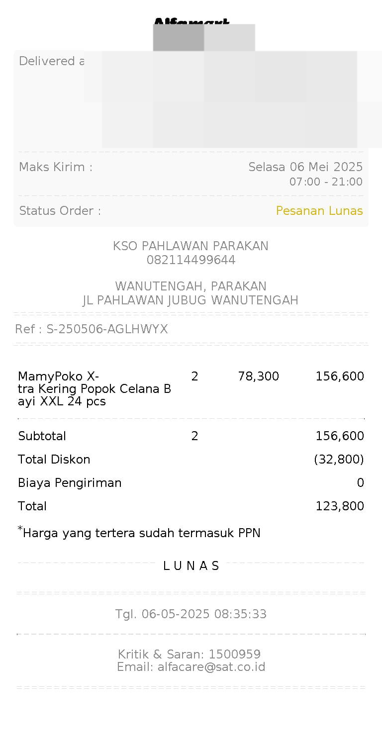 Dana digunakan untuk 1. Pembelian pempers ukuran xxl Rp62.000x4 = Rp248.000 2. Selang NGT Rp50.000.2025-04-25 09:45:24