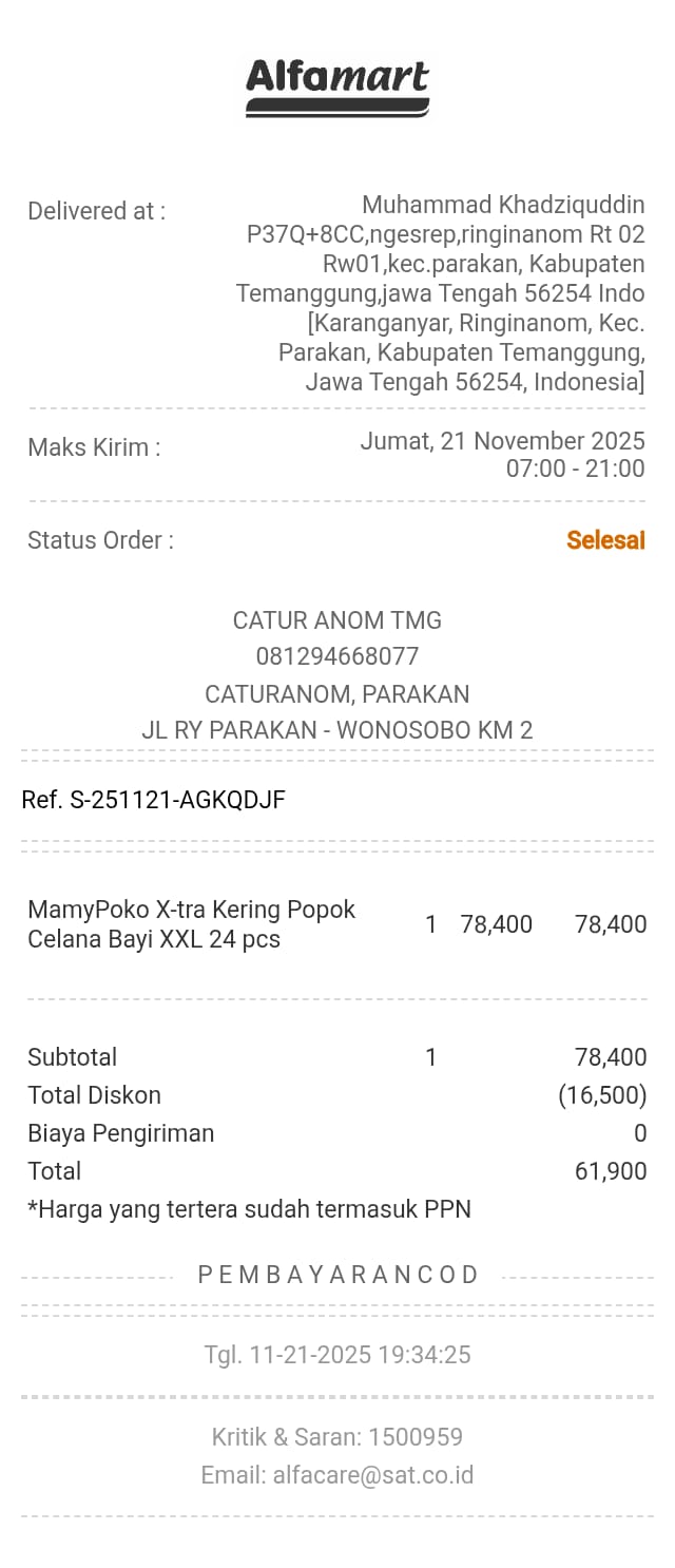 Dana digunakan untuk pembelian pampers mamypoko ukuran XXXL Rp61.900 x 4 ball = Rp247.600.2025-01-14 09:33:26