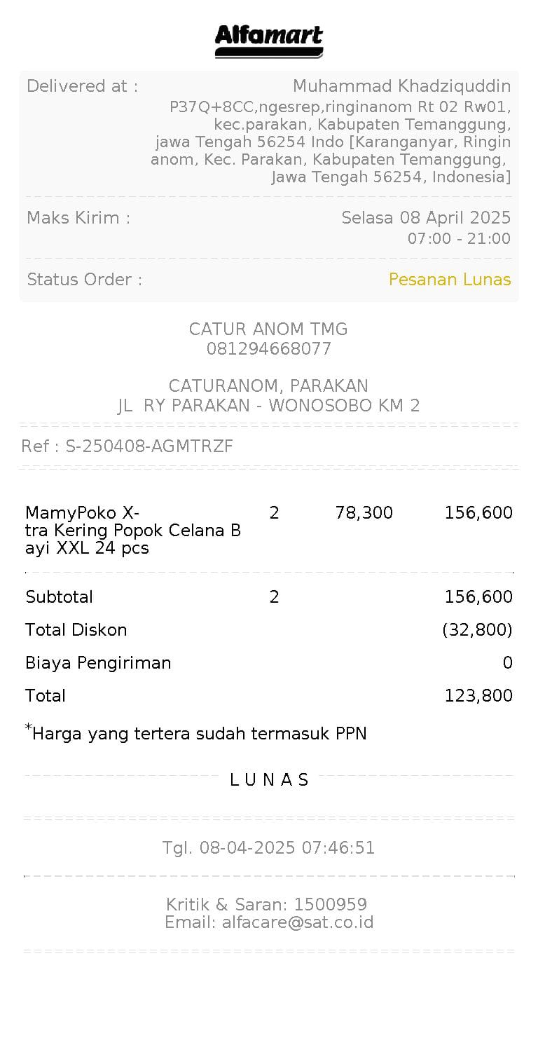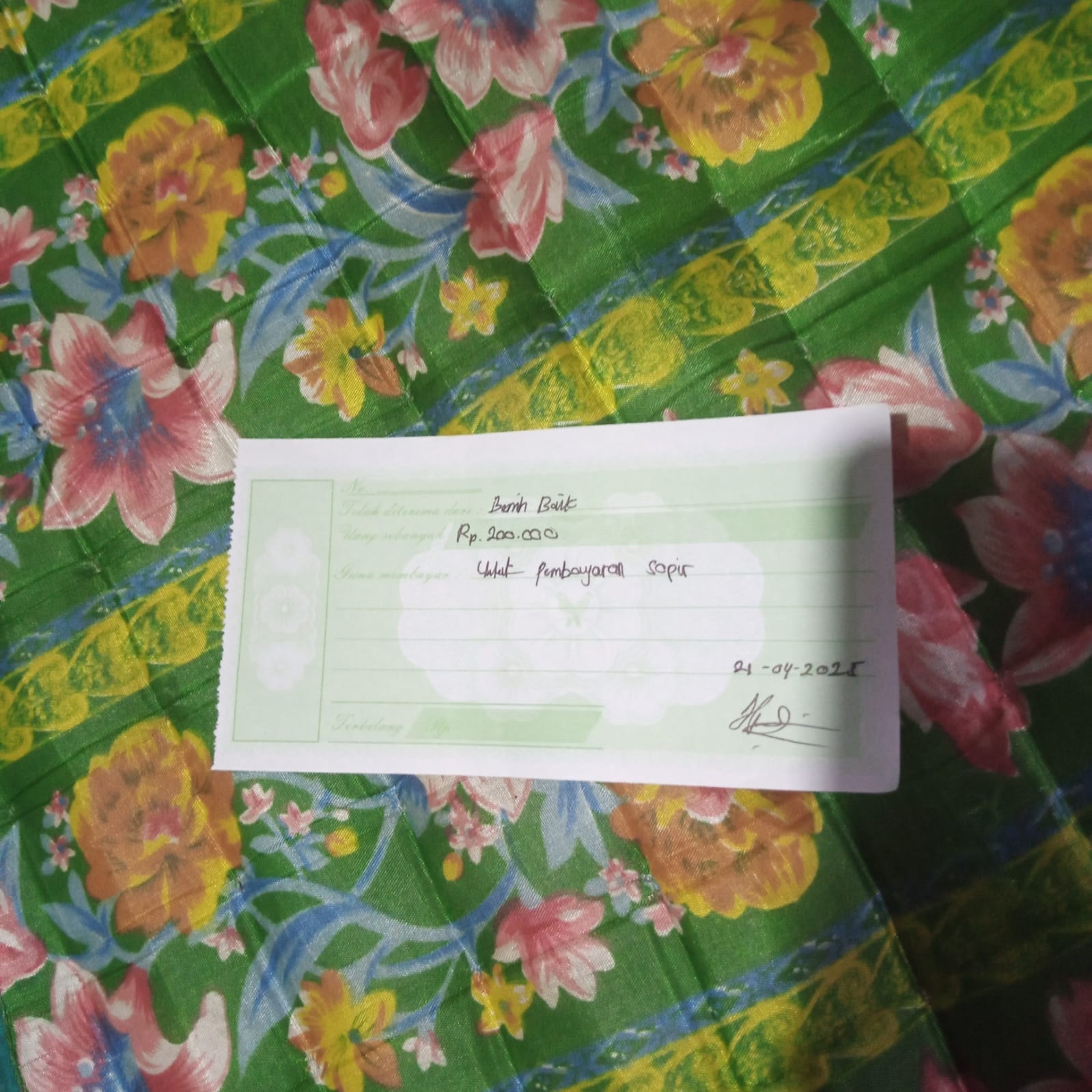 1.pembelian pempers ukuran xxl Rp.62.000x4=Rp248.000 2.kontrol sardjito pembelian BBM parakan jogja Rp.150.000 3.Pembelian NGT Rp.50.000 4.sopir dan mobil Rp.200.000 5.Konsumsi Rp.150.0002025-04-08 09:36:30