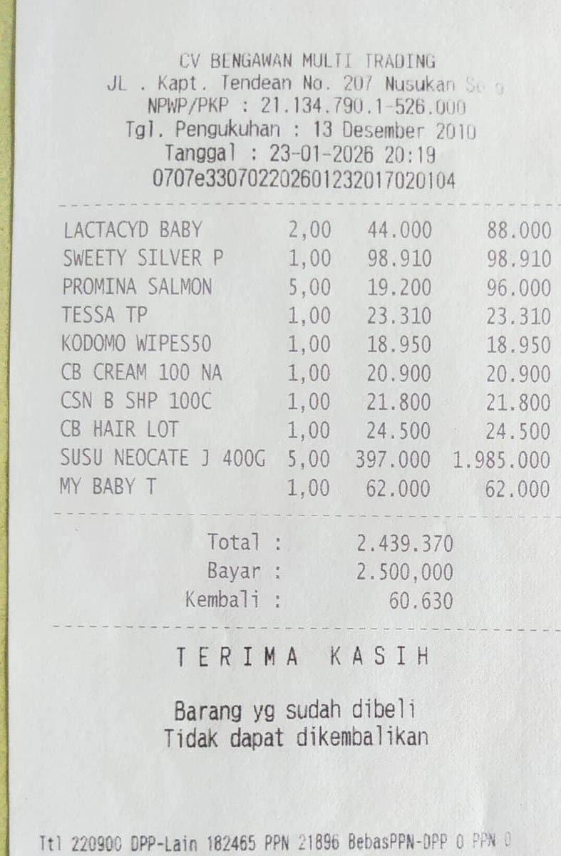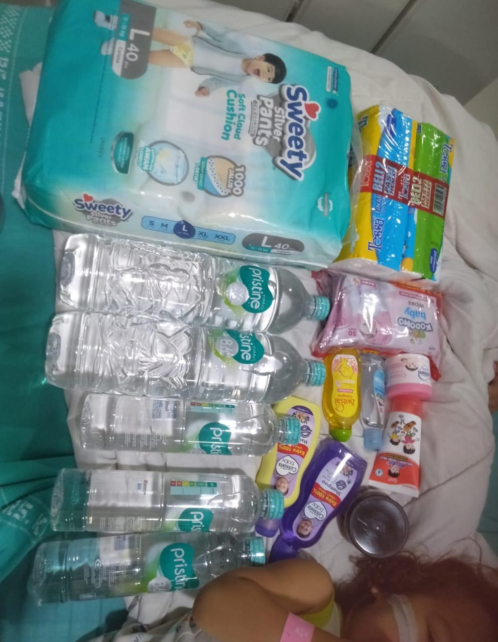 Dana dari #TemanBaik sudah digunakan untuk membeli susu, pampers, tisu kering, tisu basah, minyak telon, selang NGT, feeding buret, bubur, obat Nexium, serta konsumsi selama rawat inap.