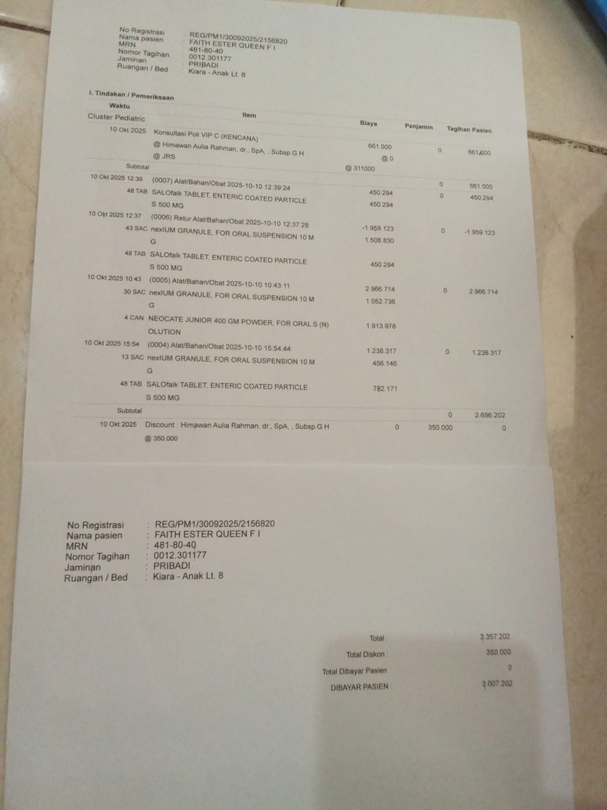 Dana digunakan untuk 1. Tindakan Kolonoskopi ulang dan Patologi anatomi Rp17.700.000 2. Tindakan pengecekan Kultur Feces ulang, Fecel Capltectin, PCR Panel dan Obat terapi nexIUM injeksi Rp6.500.000 3. Ngt 4 dan buret Rp800.0002025-09-25 09:18:08