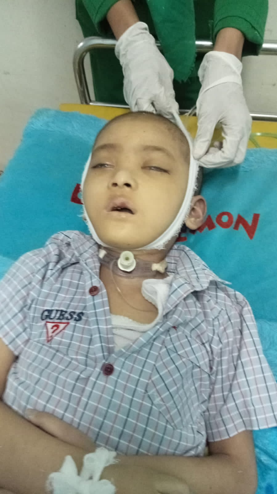 Fauzan bernapas dengan trakeostomi. Dan kegiatan buang air kecil juga melalui selang. Saat ini Fauzan di rumah, baru pulang dari RS Adam Malik. Kami mohon doanya untuk Fauzan supaya kondisinya terus membaik.