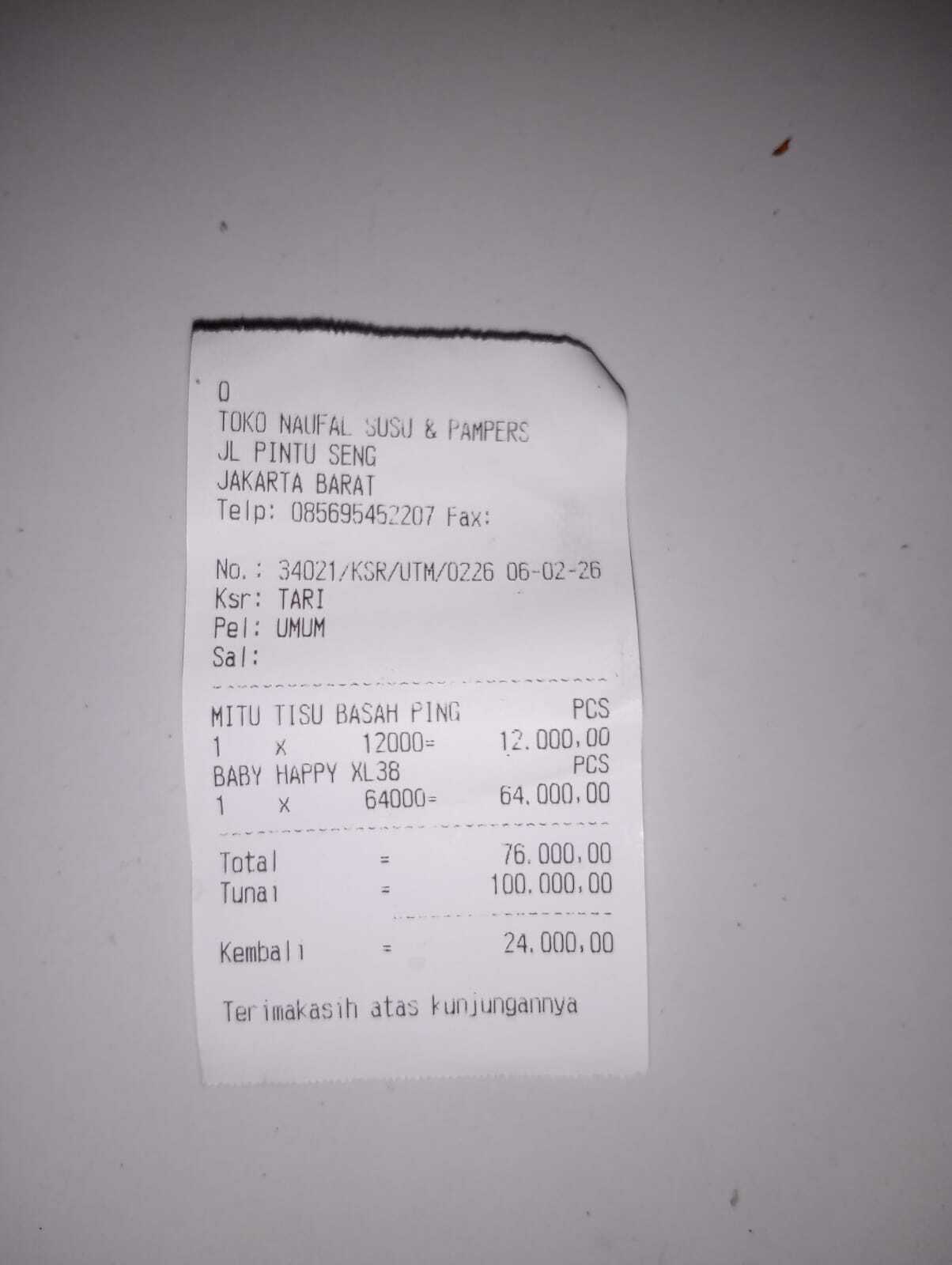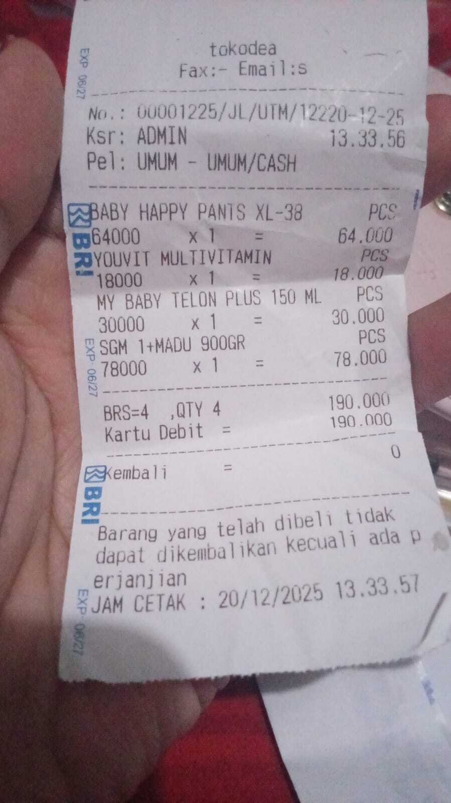 Dana digunakan untuk 1. Reimburse Pampers Rp64.000 2. Reimburse Susu SGM Rp44.000 3. Minyak telon Rp39.0002025-06-30 14:59:04
