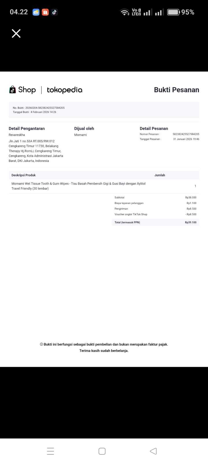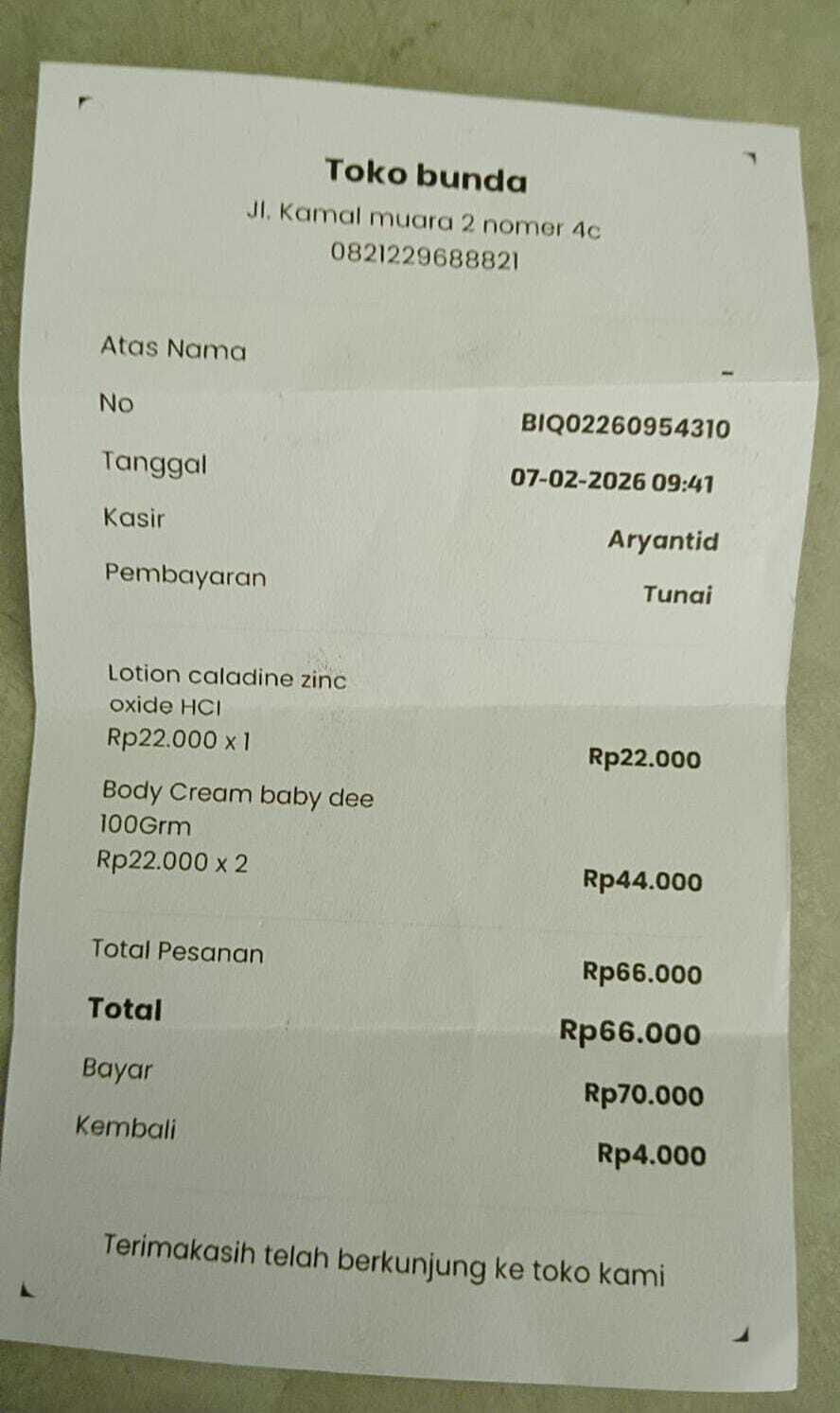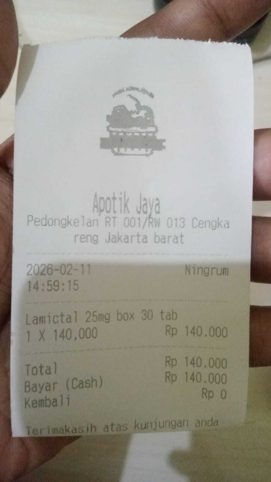 Dana digunakan untuk 1. Reimburse C baby happy XL Rp64.000 2. Reimburse Tissu basah Rp12.000 3. Reimburse Cream baby dee 2x Rp22.000 = Rp44.000 4. Reimburse Termometer digital Rp59.500 5. Reimburse Oximeter Rp48.500 6. Reimburse Bedak caladin Rp22.000 7 Reimburse Oral cleansing wifes Rp30.000 8. Lamicital 25mg 30tablet 1Rp30.0002026-02-10 17:11:30