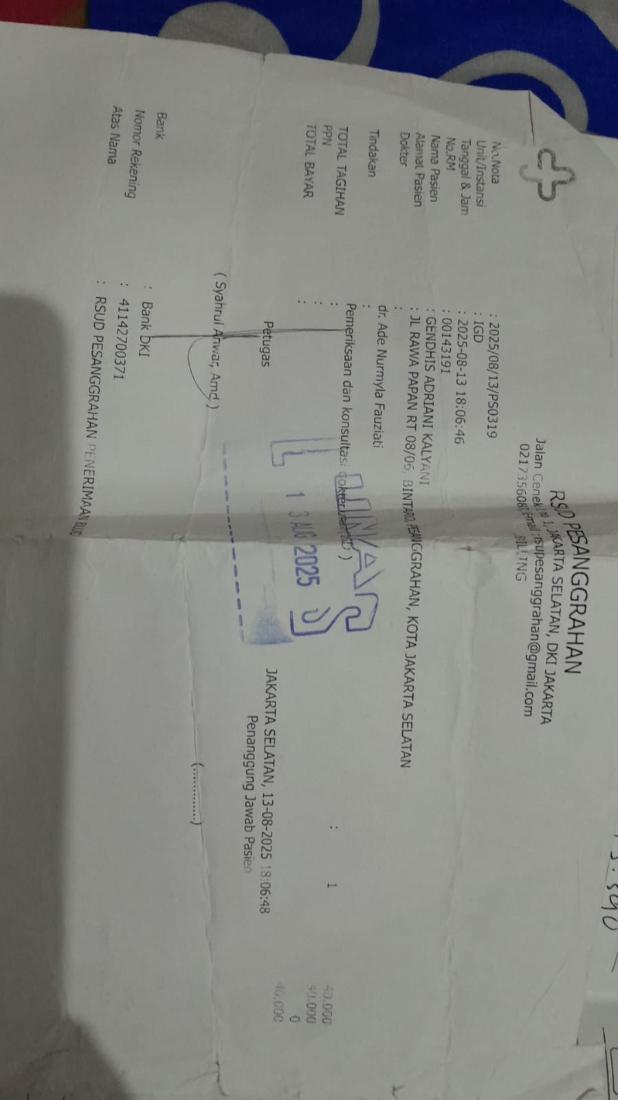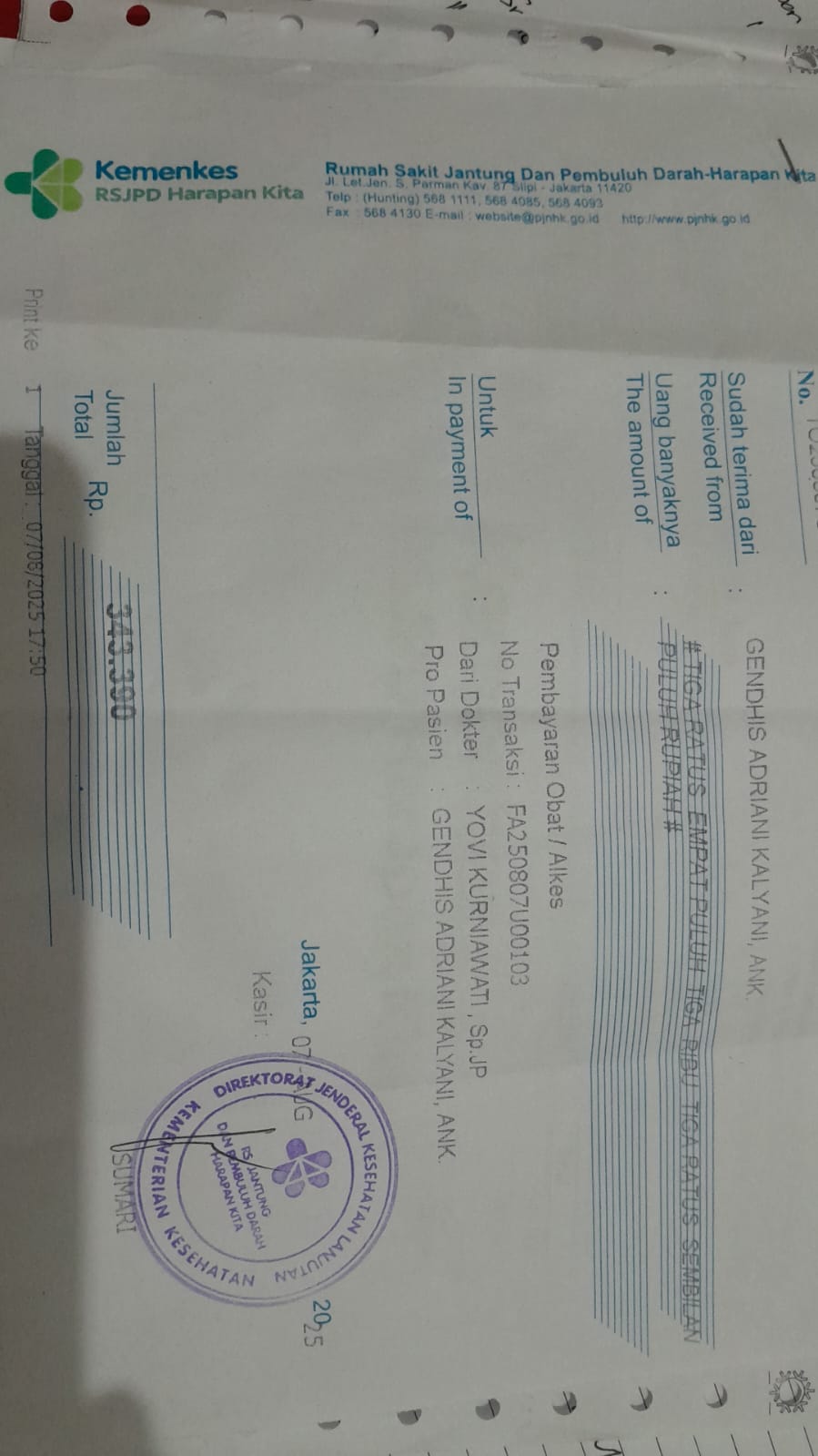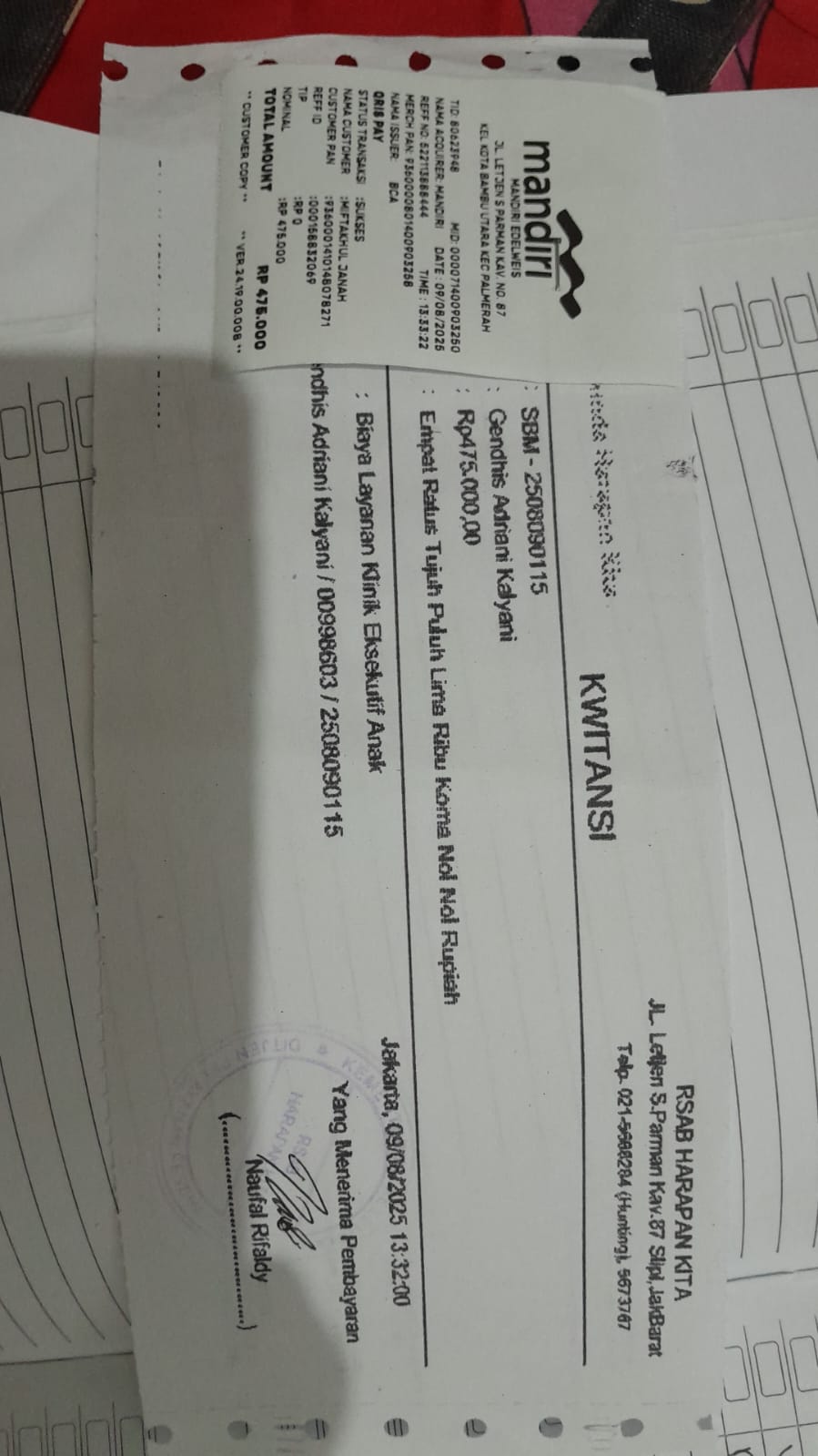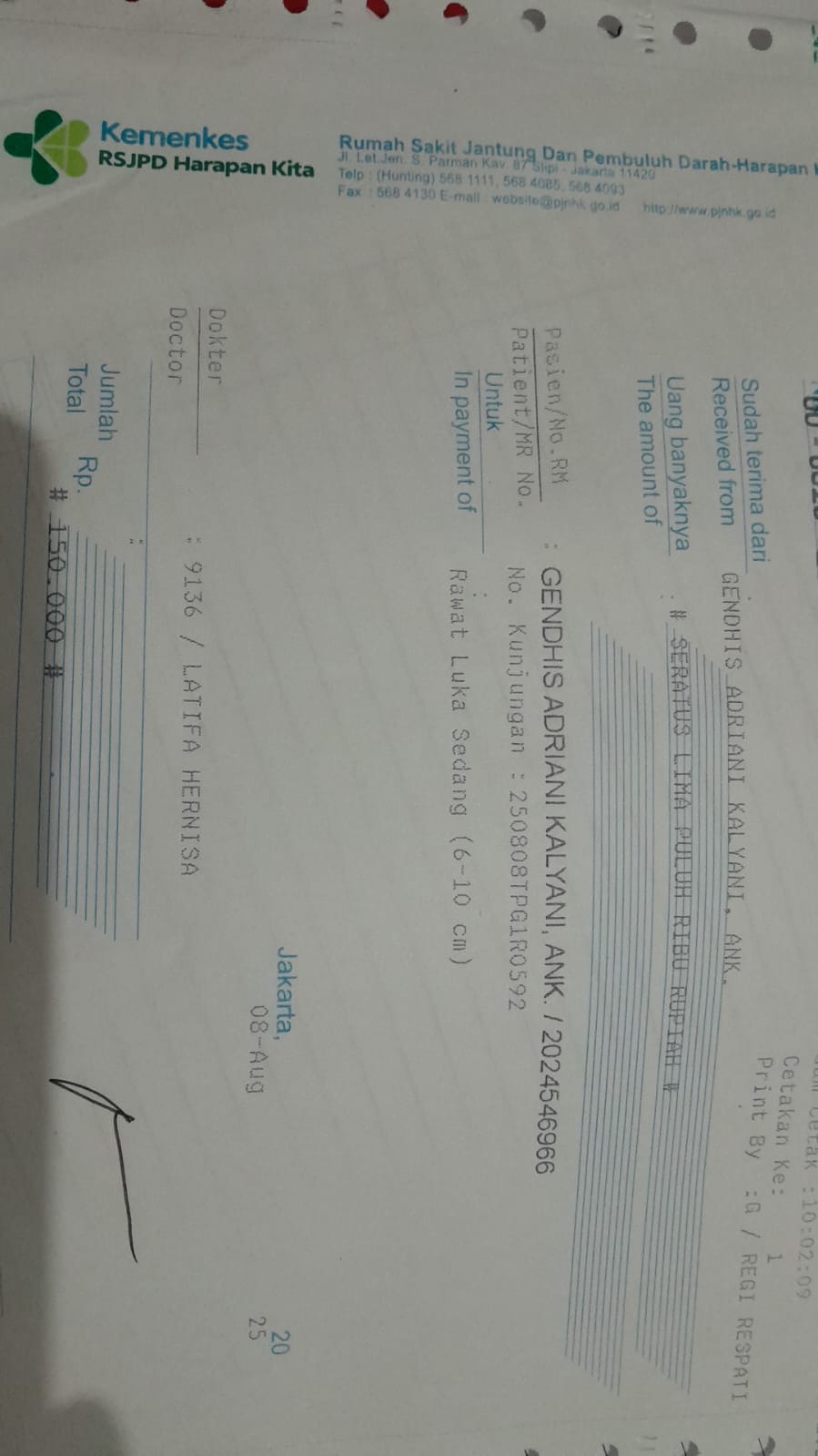 Dana digunakan untuk 1. Reimburse Natureline multivitamin Rp159.500 2. Reimburse Natureline Bumin Rp317.500 3. Reimburse Susu dan pampers Rp633.900 4. Reimburse Alat kesehatan Rp83.500 5. Reimburse Pampers dan obat alpara Rp72.000 6. Reimburse pampers Rp63.000 7. Reimburse ke dokter Gastro Rp475.000 8. Reimburse Tindakan dokter Rp150.000 9. Reimburse kontrol ke dokter bedah Rp250.000 10. Reimburse Obat non BPJS Rp343.390 11. Reimburse Kost 5 hari Rp650.0002025-08-14 15:12:32