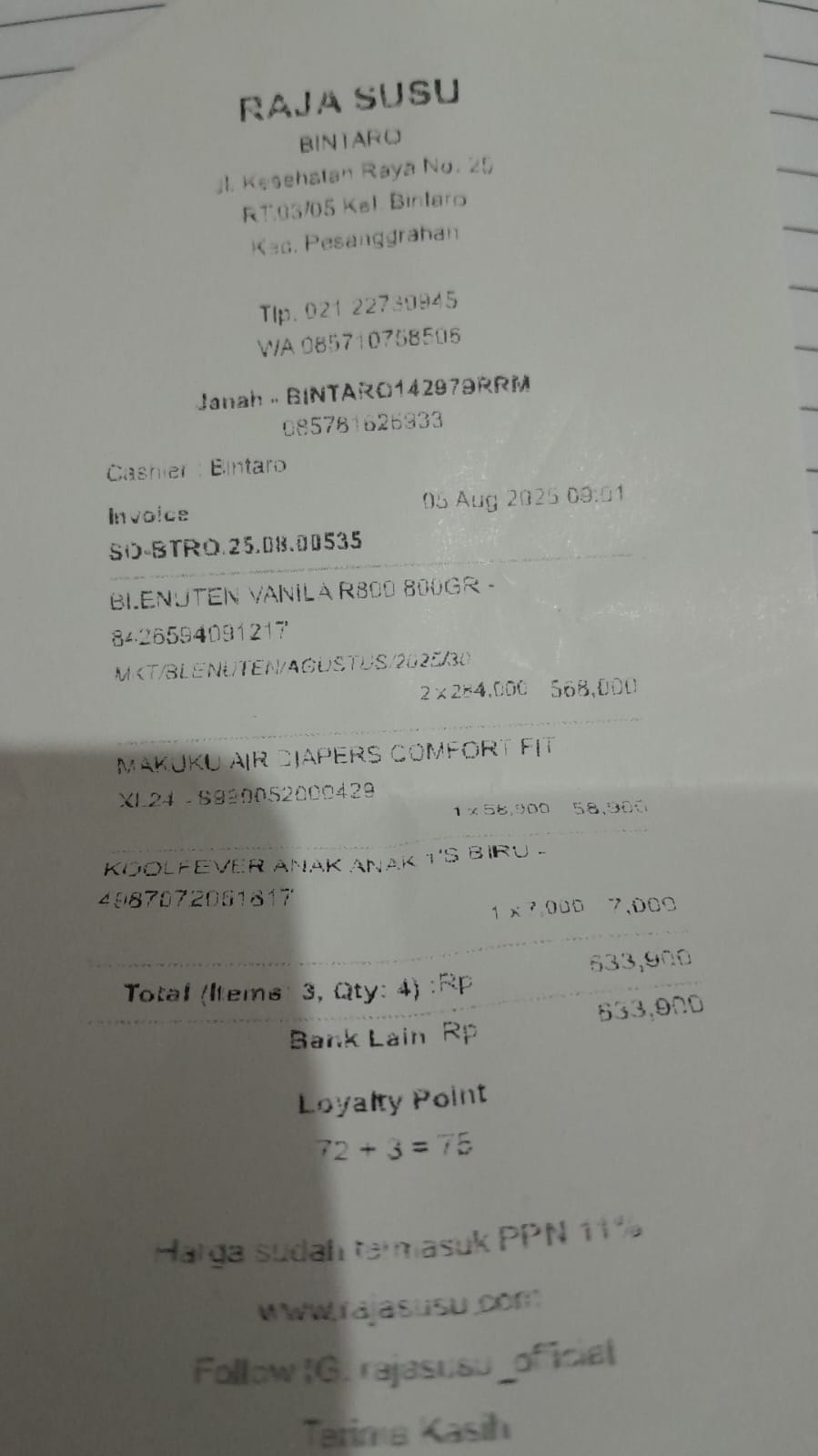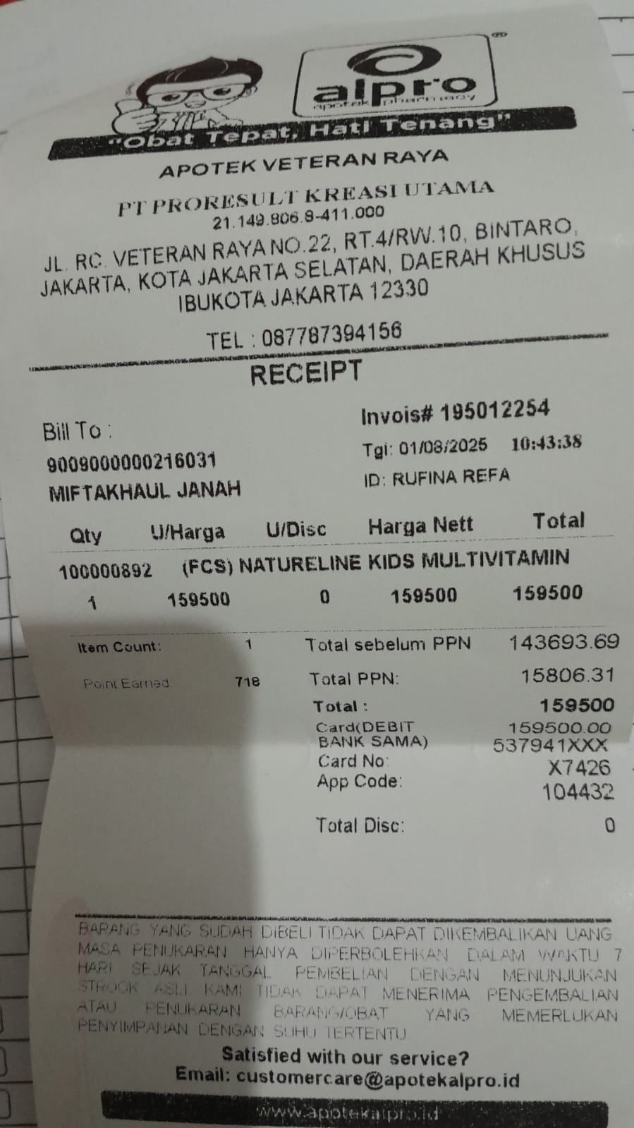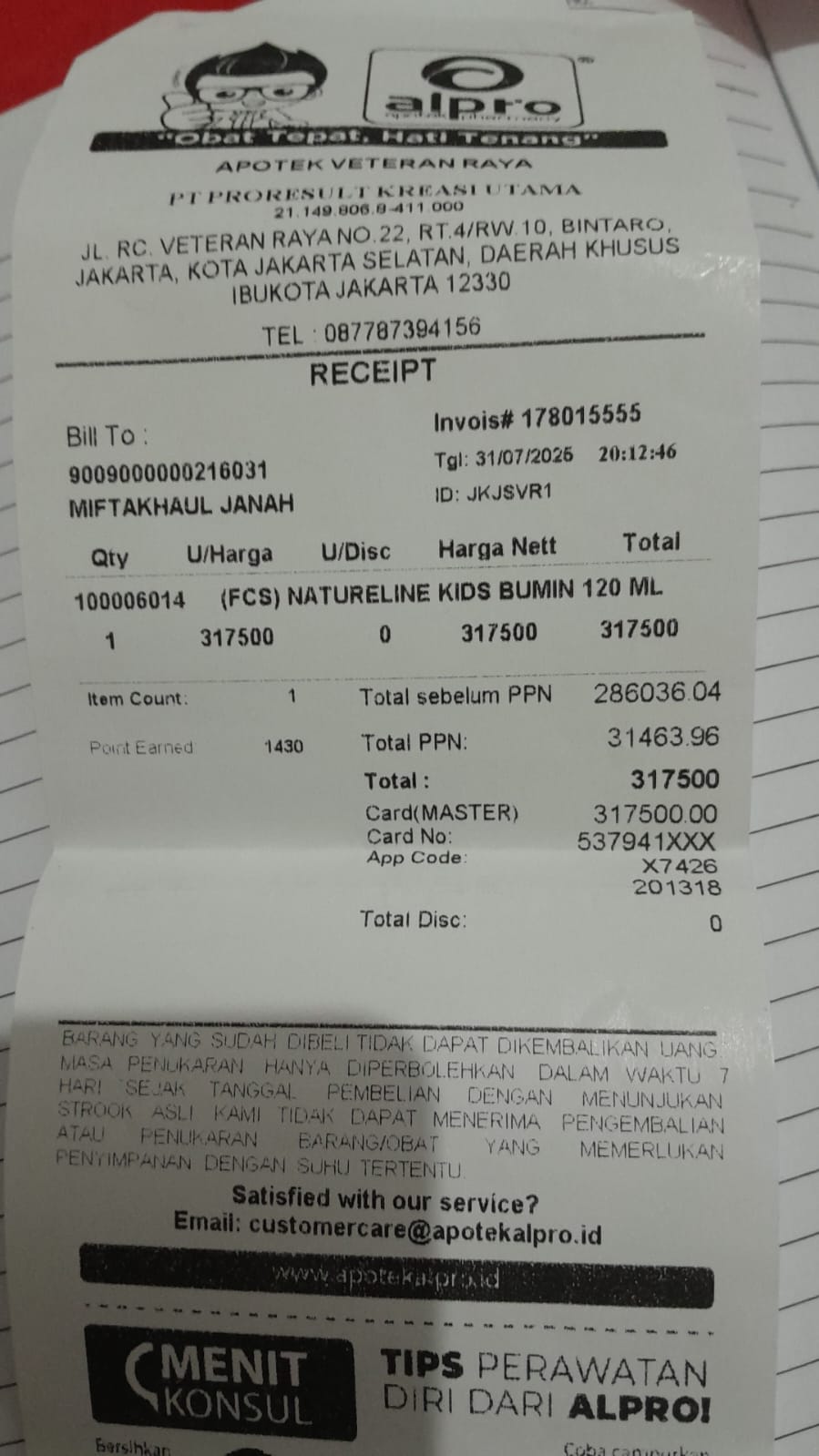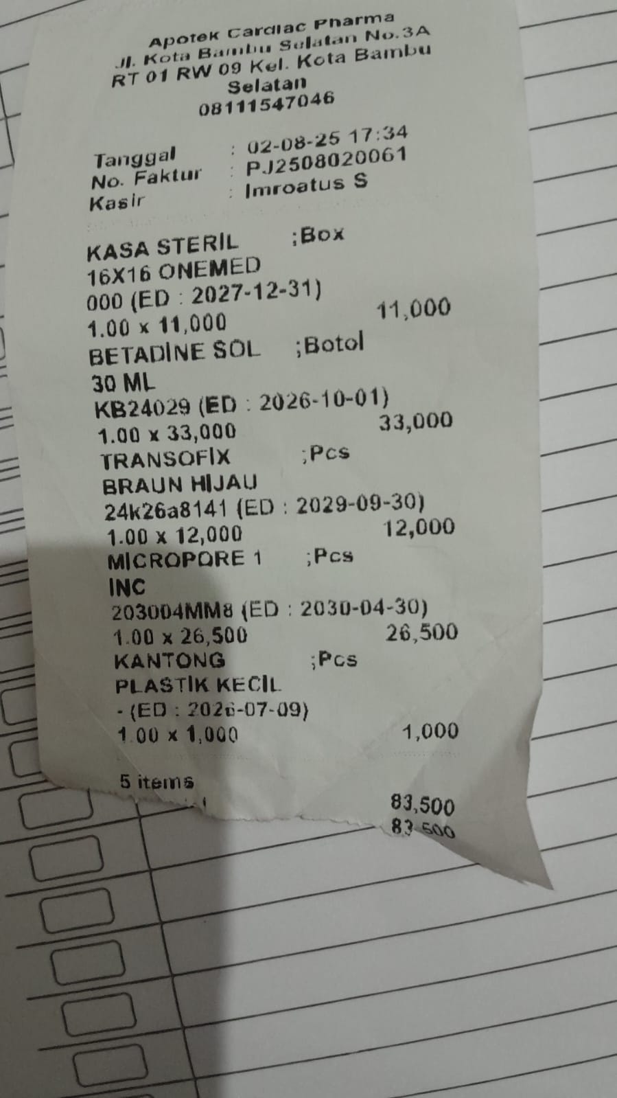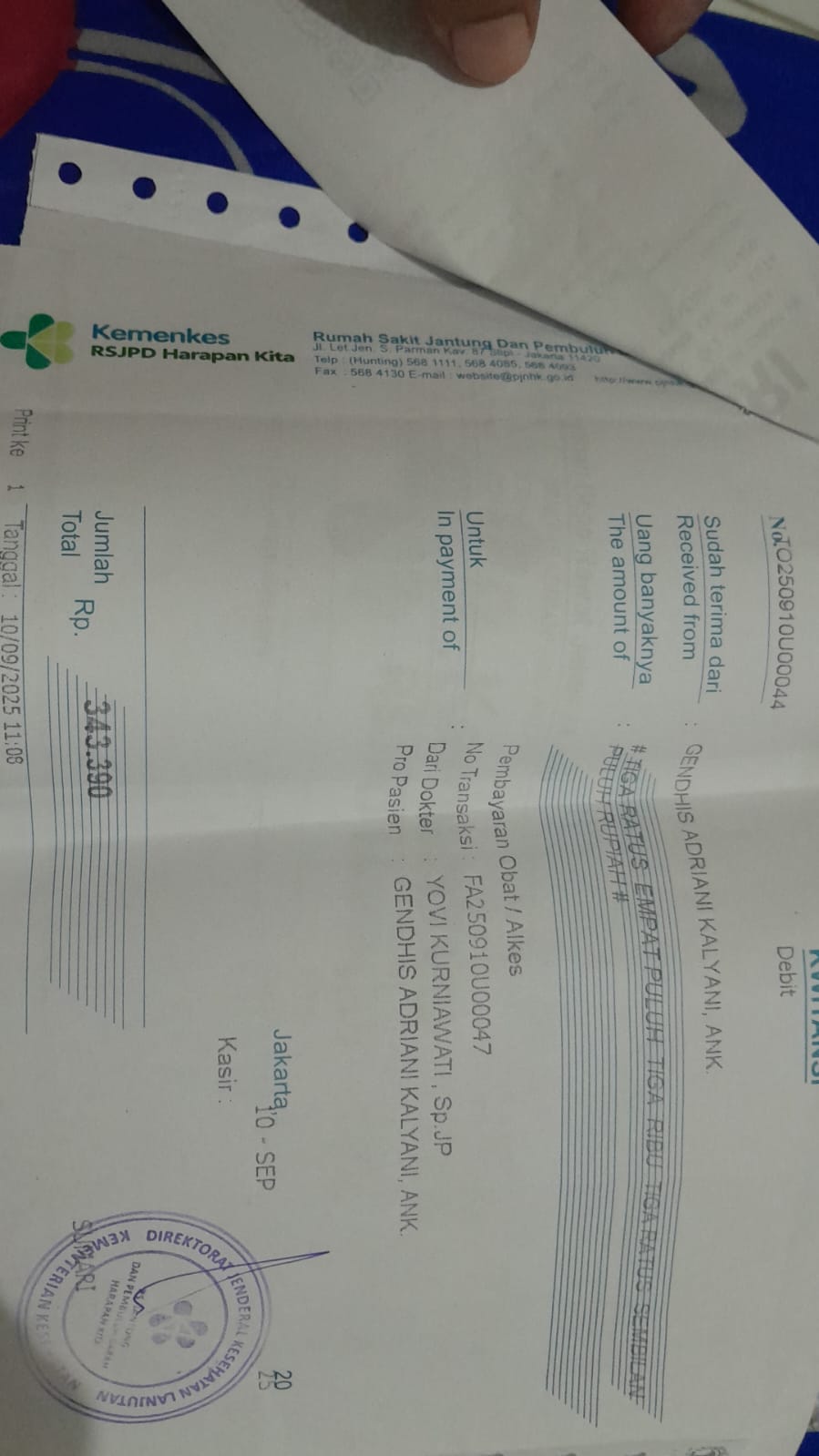 Dana digunakan untuk 1. Reimburse Natureline multivitamin Rp159.500 2. Reimburse Natureline Bumin Rp317.500 3. Reimburse Susu dan pampers Rp633.900 4. Reimburse Alat kesehatan Rp83.500 5. Reimburse Pampers dan obat alpara Rp72.000 6. Reimburse pampers Rp63.000 7. Reimburse ke dokter Gastro Rp475.000 8. Reimburse Tindakan dokter Rp150.000 9. Reimburse kontrol ke dokter bedah Rp250.000 10. Reimburse Obat non BPJS Rp343.390 11. Reimburse Kost 5 hari Rp650.0002025-08-14 15:12:32