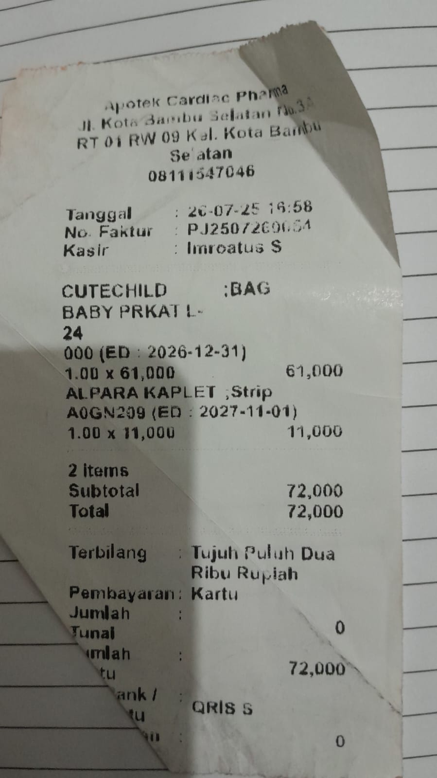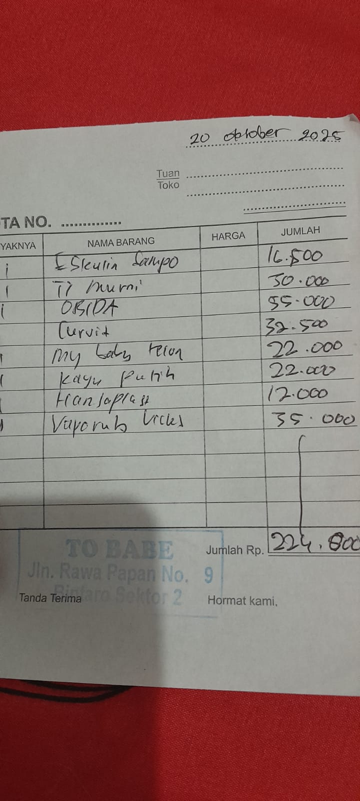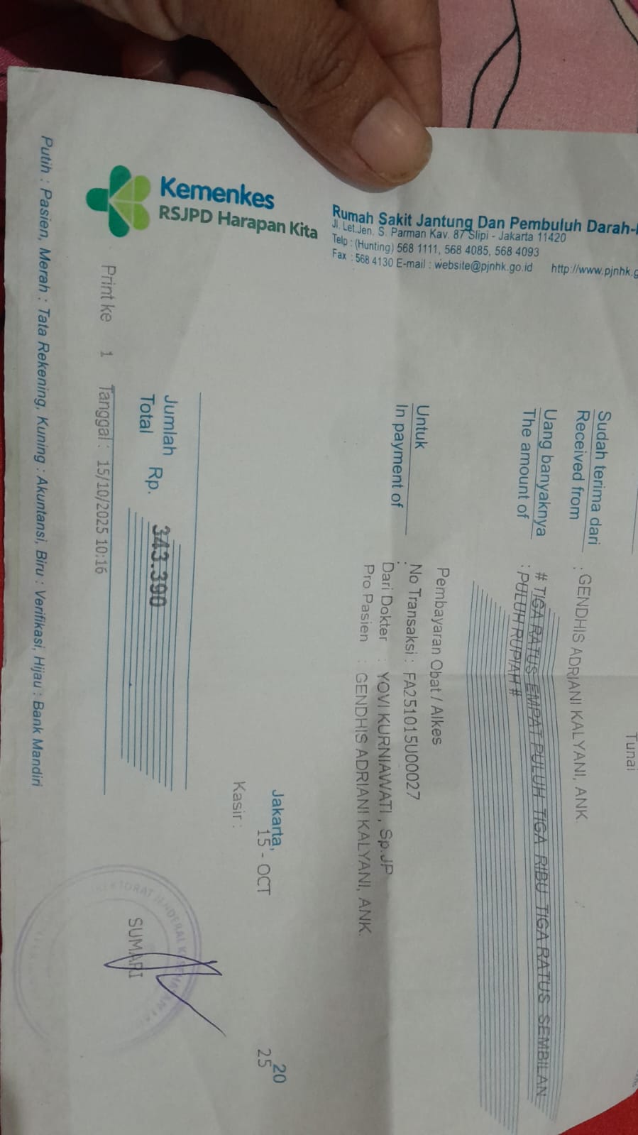 Dana digunakan untuk 1. Reimburse Susu sgm 2 box Rp140.000 2. Reimburse Obat jantung Rp343.390 3. Reimburse Minyak telon Rp211.000 4. Reimburse Vit dan obat batuk Rp138.0002025-11-25 09:14:41