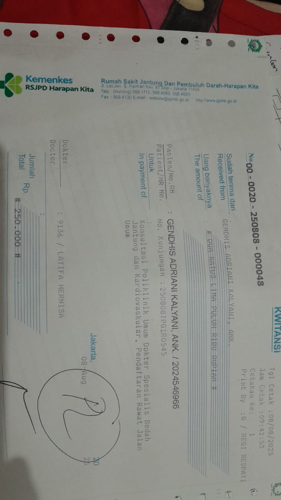 Bulan ini Gendhis harus kontrol dan menjalani pengambilan darah karena hasil INR-nya tinggi, sehingga setiap bulan perlu cek laboratorium. Pagi itu, kami datang ke rumah sakit untuk ambil darah di tangan kiri. Setelah itu, kami menunggu giliran bertemu dokter jantung.