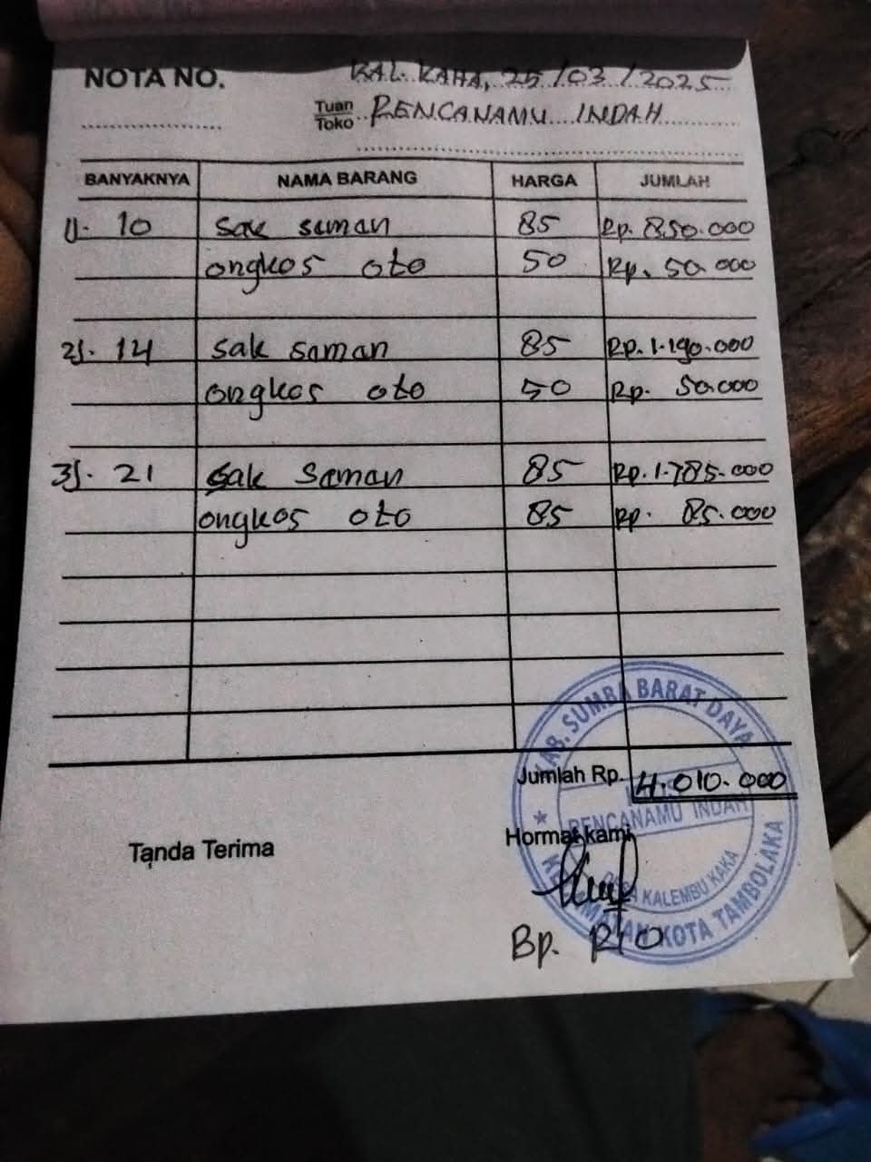 Dana digunakan untuk Semen Rp75.000x 22sak = Rp1.650.0002025-05-28 09:39:18