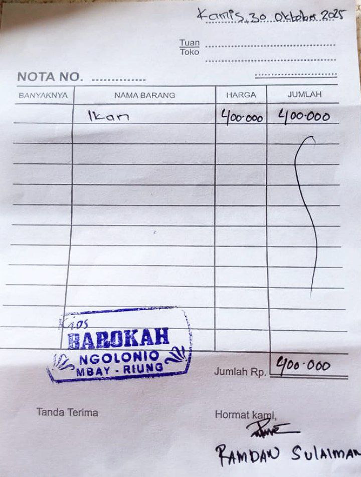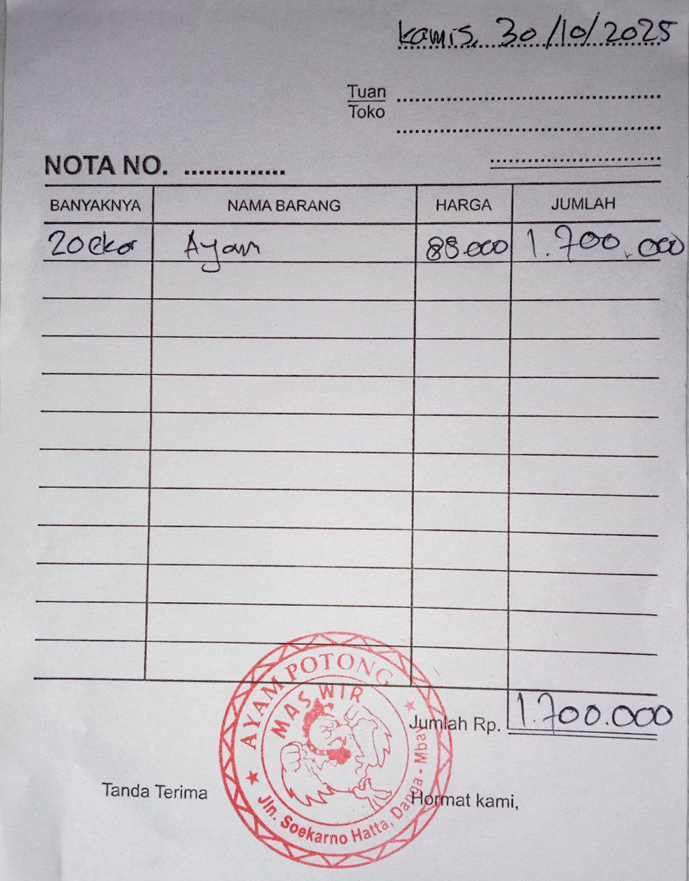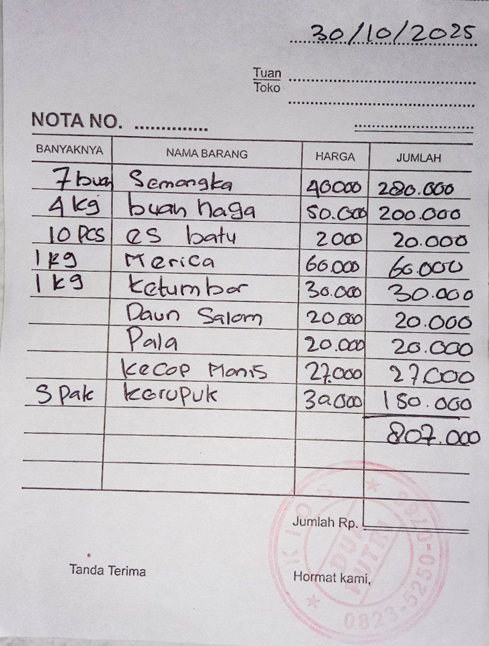 Dana digunakan untuk 1. Beras Rp20.500 x 30kg = Rp 615.000 2.Telur Rp85.000 x 6rak = Rp 510.000 3. Daging sapi Rp140.000 x 3kg = Rp420.000 4. Daging ayam Rp35.000 x 7kg = Rp 245.000 5. Minyak goreng Rp20.000 x 6liter = Rp120.000 6. Gula pasir 1kg = Rp 20.000 7 Tepung terigu Rp15.000 x 2kg = Rp30.000 8. Penyedap dan Bumbu Dapur 1paket Rp120.000 9. Sayuran Rp150.000 x 2paket = Rp300.000 10. Buah-buah 1paket Rp200.000 11. Gas 1Tabung Rp 30.000 12. Air Galon/Minuman 1Paket Rp150.000 13. Akomodasi P2024-11-07 09:29:22