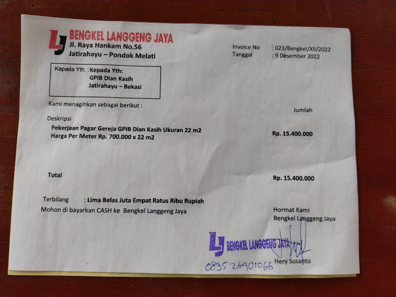 Dana digunakan untuk 1. Jasa pemasangan batu alam P 100 meter (100 meter x @100.000) Rp10.000.000 2. Pasir 1 truck (6 kubig) Rp2.000.000 3. Semen 40 sak @50 kg x 65.000 per sak Rp2.600.000 4. Jasa untuk pengacian dinding pagar Rp1.580.792.2022-11-22 17:59:42