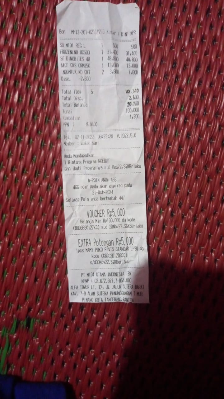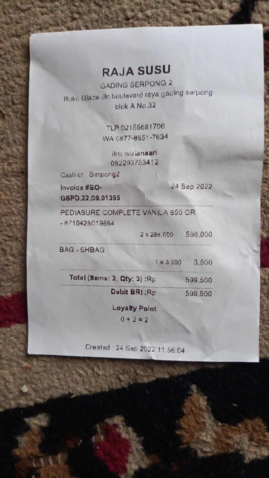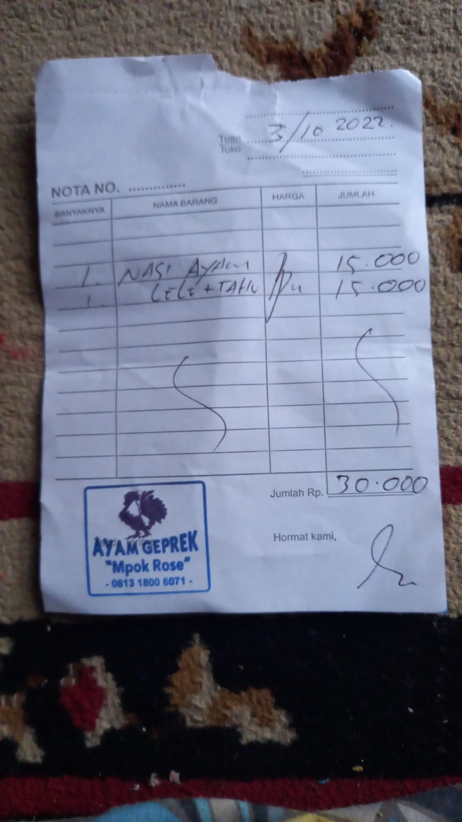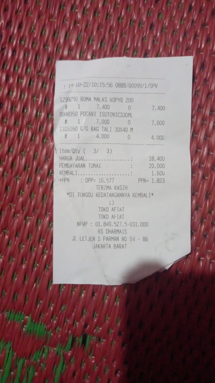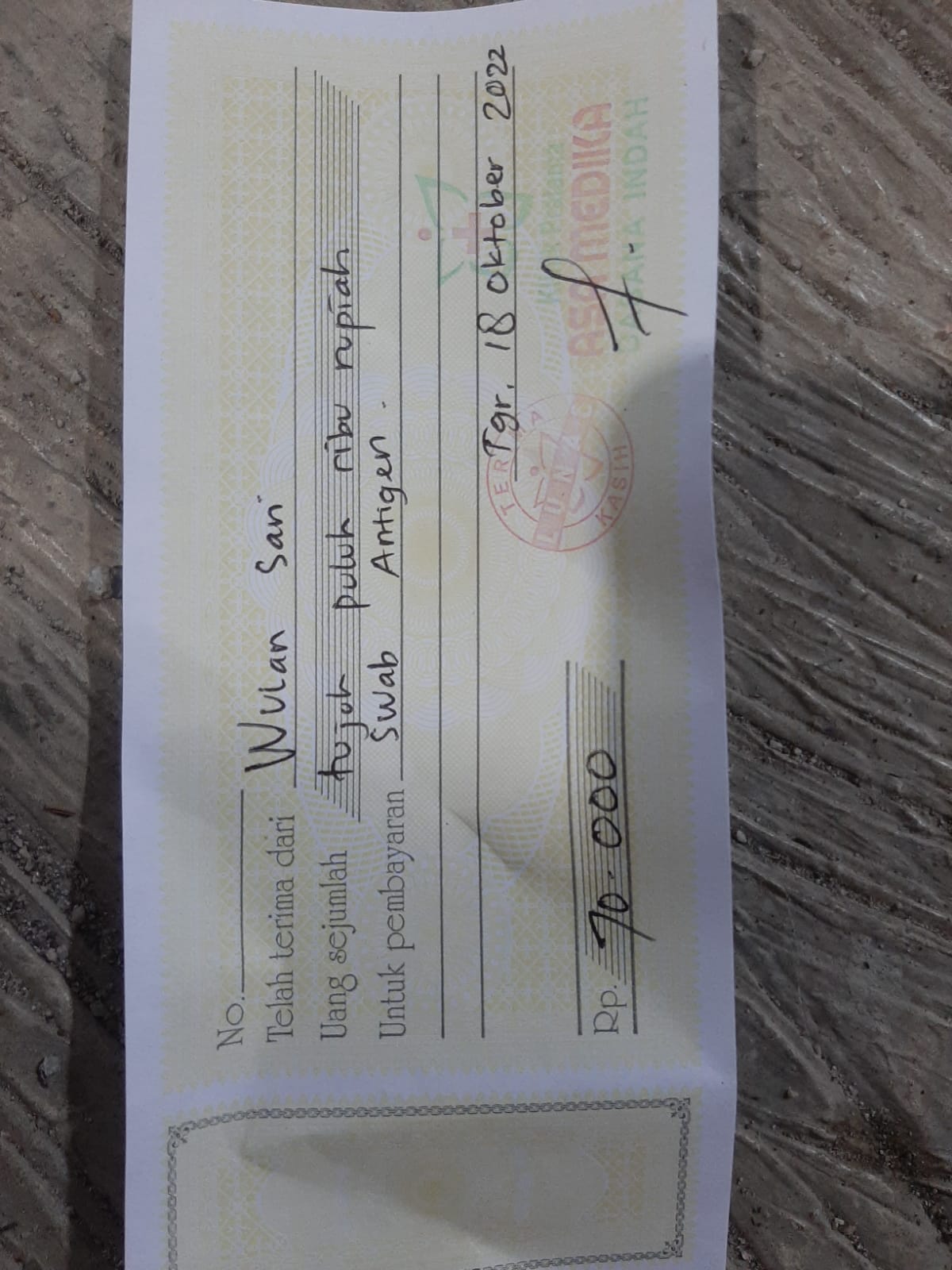 Dana digunakan untuk: 1. Untuk pembelian susu pediasure complete 850 gr @298.000×3 kaleng= Rp894.000 2. Mamy poko pants xl 26 @57.000× 2= Rp114.000 3. Tisu kering alfamidi @25.000×2= Rp50.000 4. Swab antigen @99.000×1= Rp99.000 5. Transportasi dari Tangerang ke RS kurang lebih 2 jam untuk 2× kontrol (pergi 154.000, pulang 194.500, pergi 166.000, pulang 229.000, total= Rp743.500 6. Untuk membeli buah mangga 2 kg×39.500= Rp79.000 7. Untuk biaya pendamping 4 hari2022-10-11 17:05:44