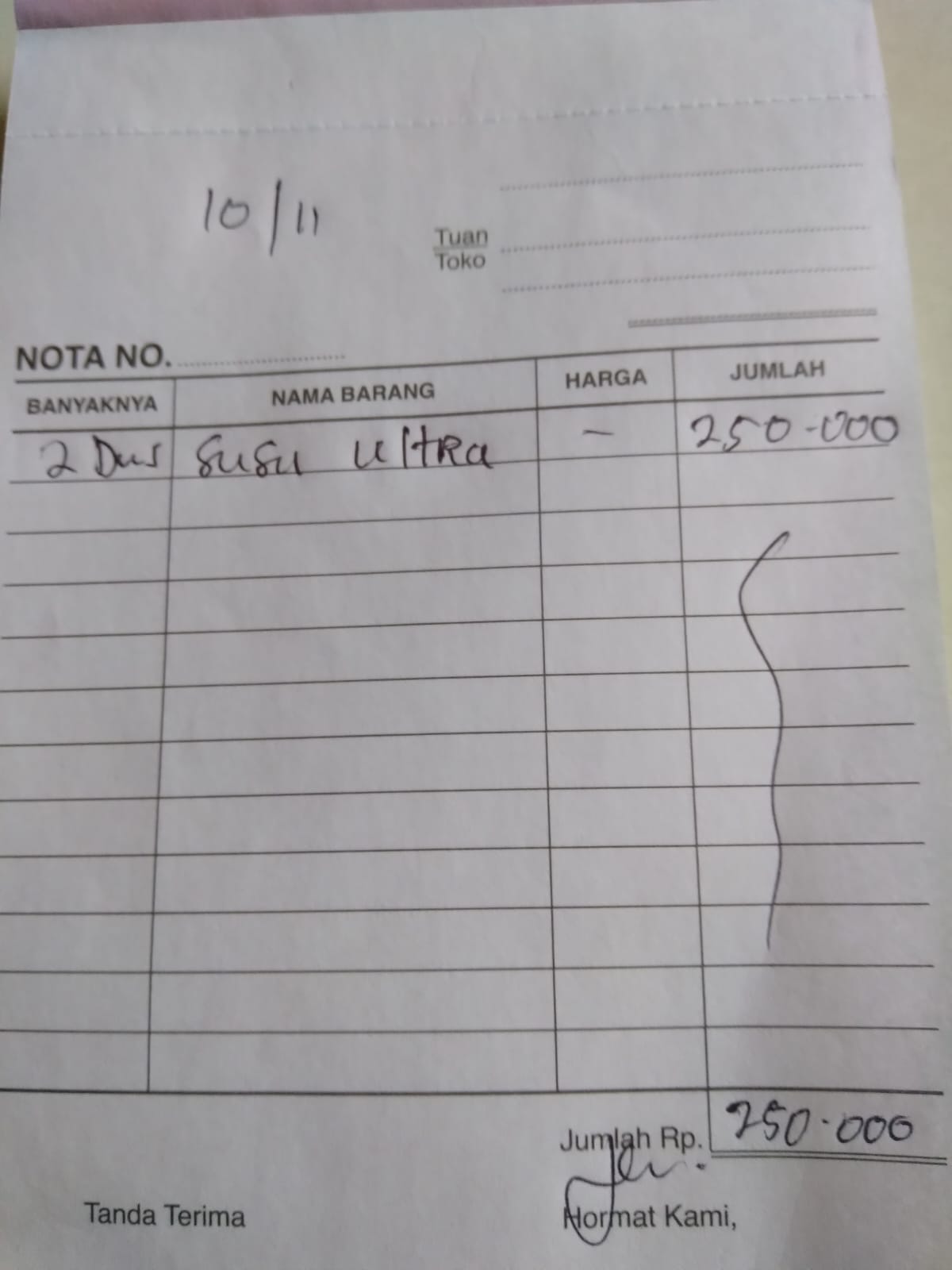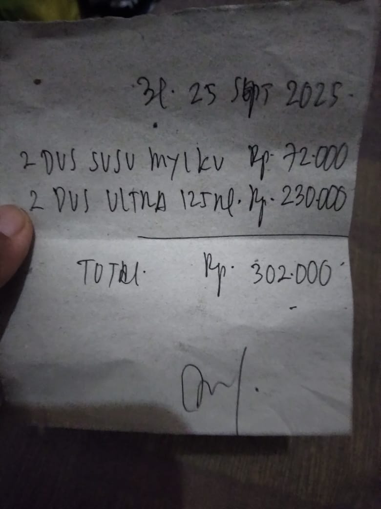 Dana digunakan untuk 1. Paracetamol Rp10.000 x 3 = Rp30.000 2. Susu Ultra Rp125.000 x 2 dus = Rp250.0002025-09-17 13:49:19