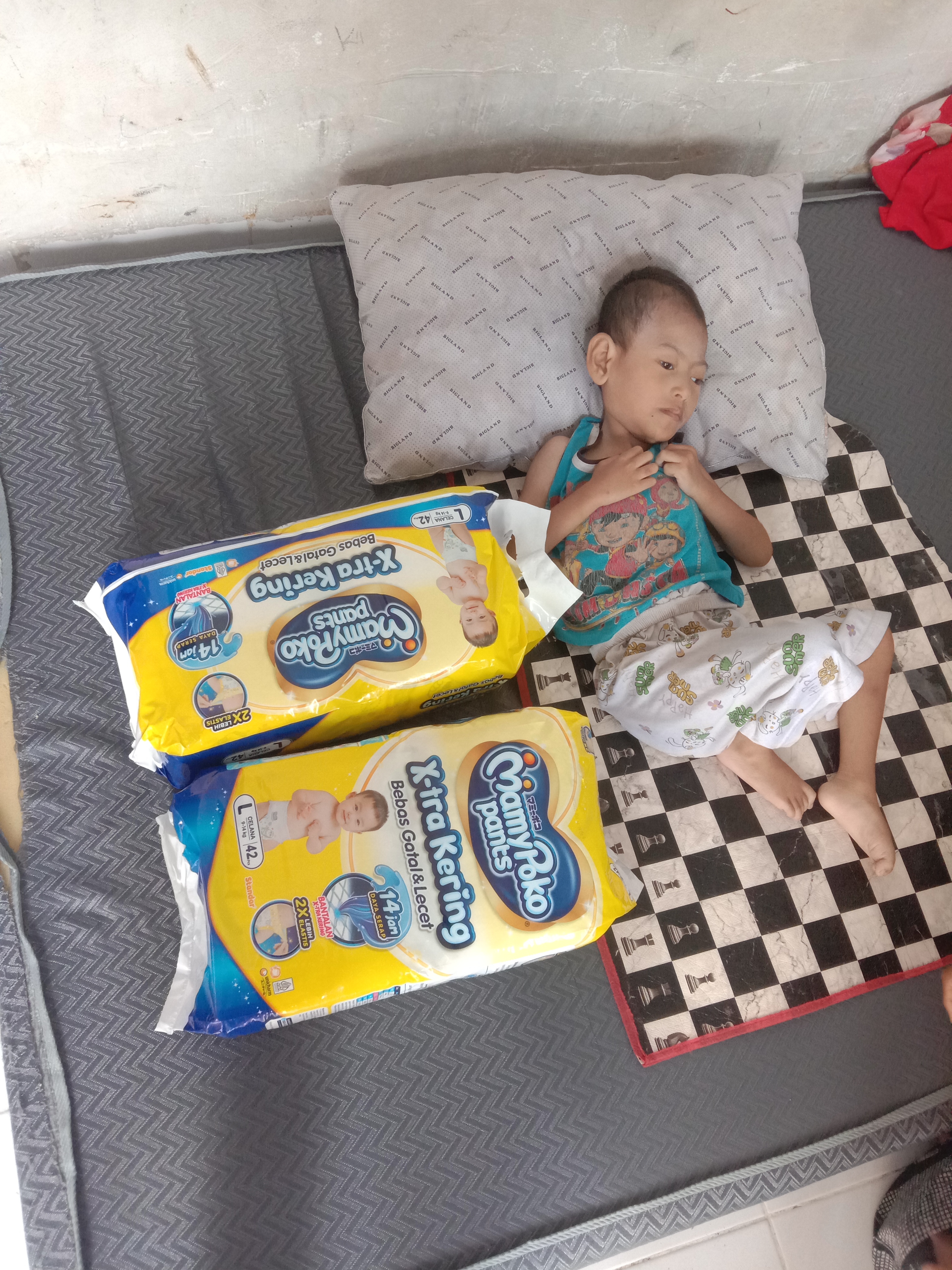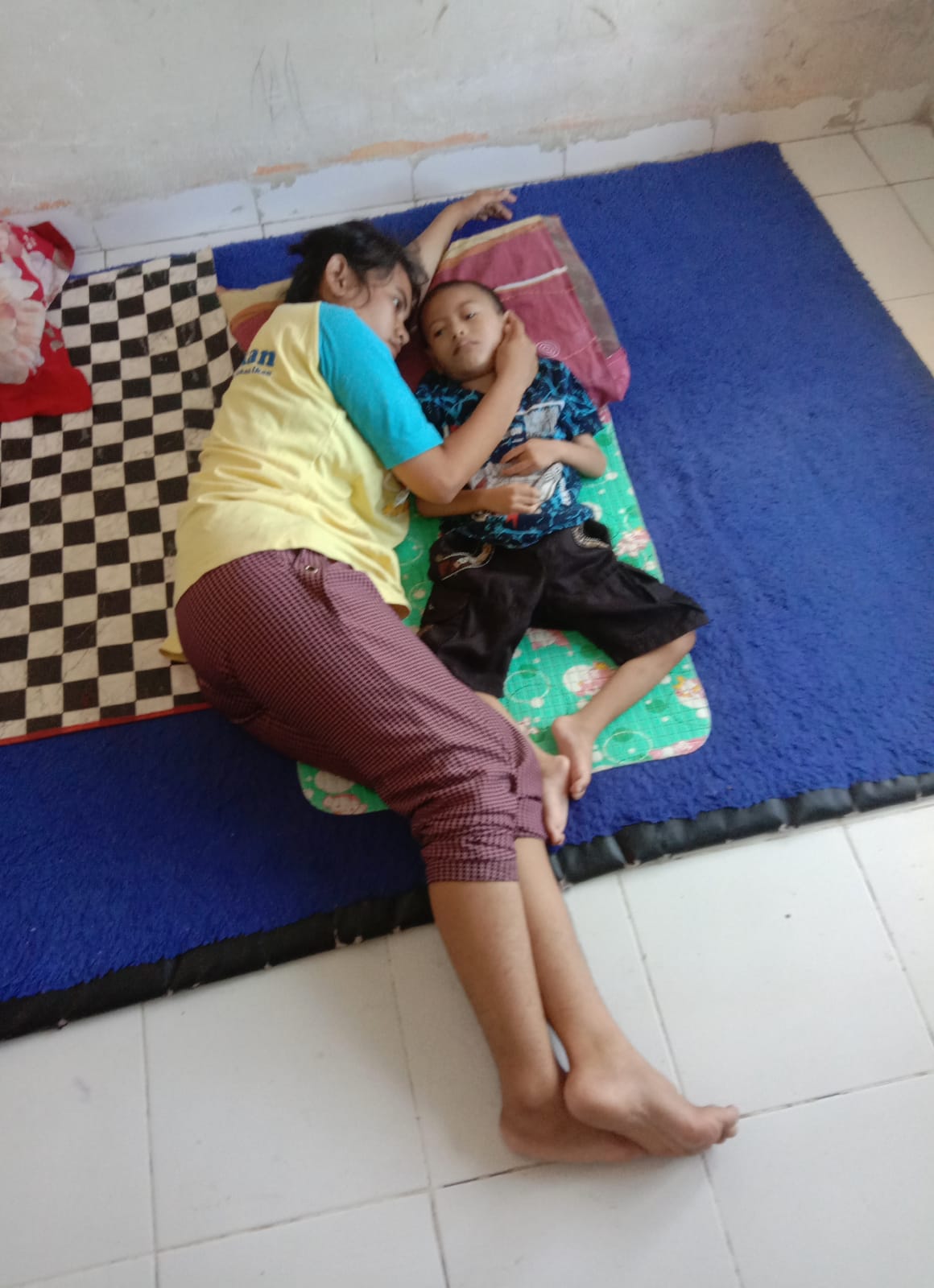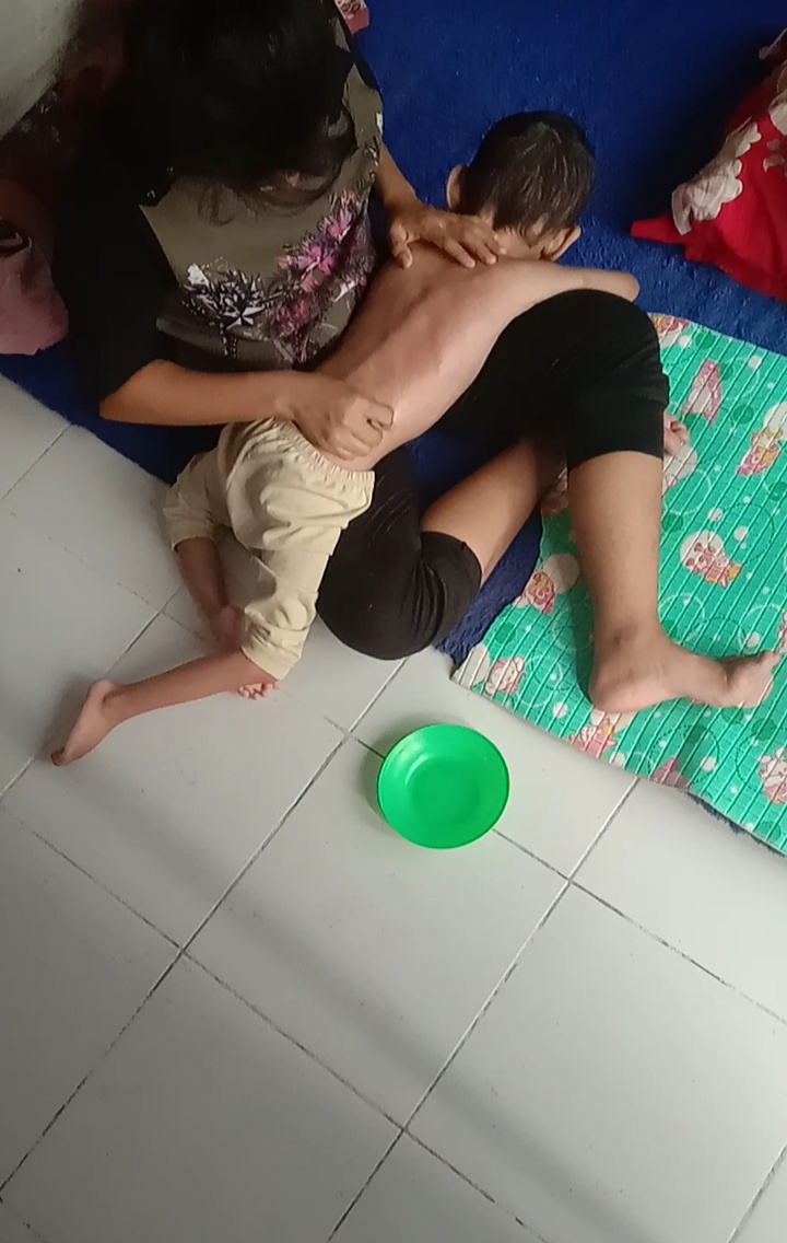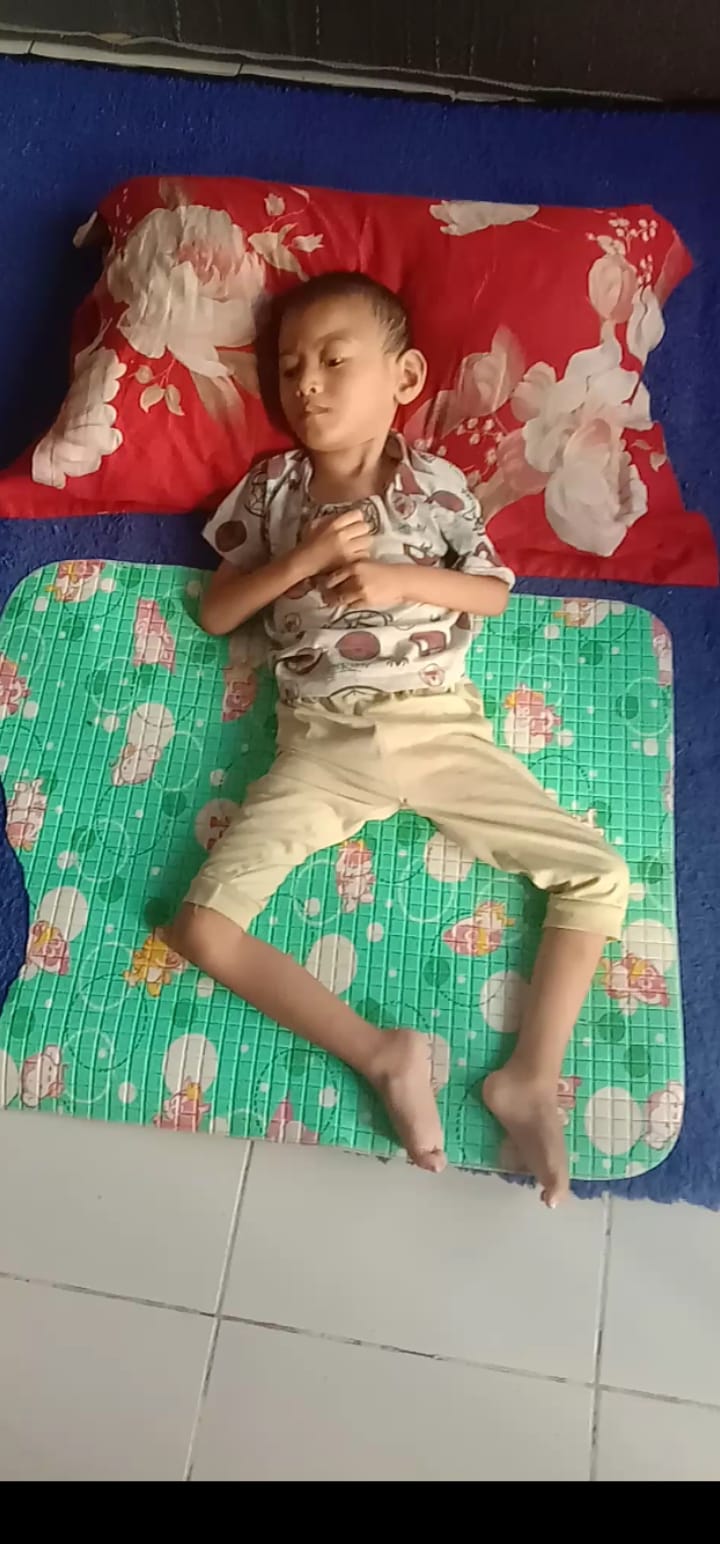 Sehari-hari anakku hanya bisa terbaring di atas karpet tipis dengan sebuah bantal tipis di bawah kepalanya. Tubuhnya semakin kurus bagai tulang dibalut kulit, tangan dan kakinya kaku hingga bengkok, bahkan untuk sekedar duduk pun Ia tidak mampu.