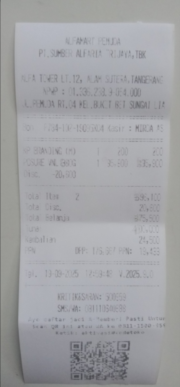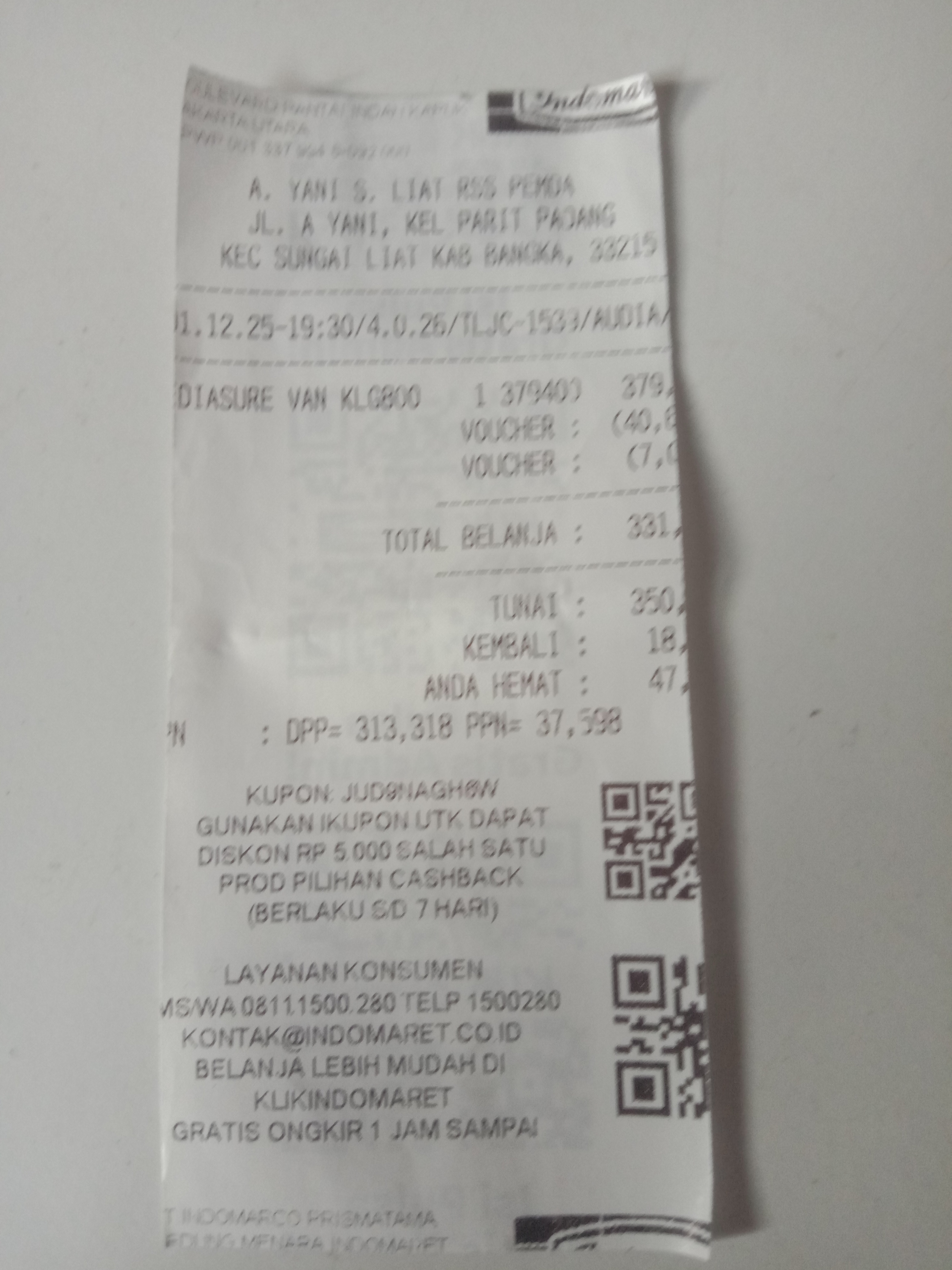Berikut kami lampirkan struk pembelian susu Pediasure untuk M. Hanif di Indomaret.
