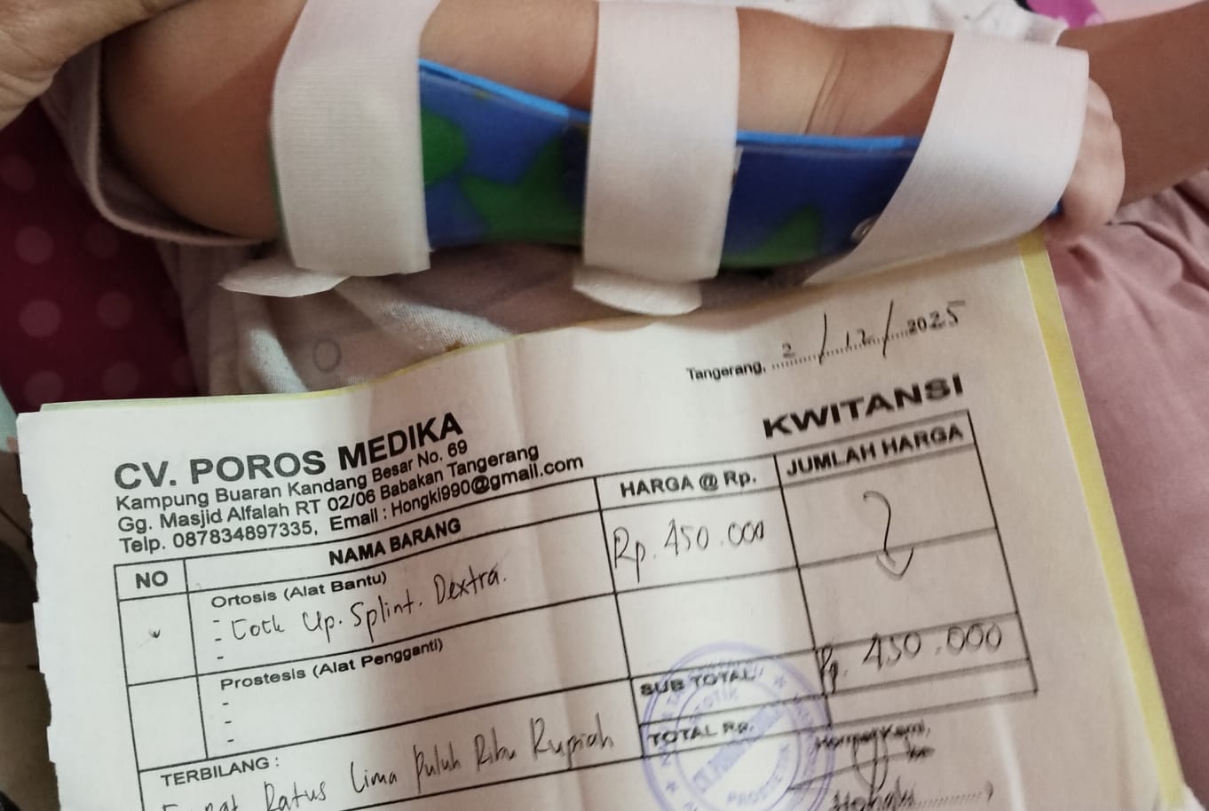 Dana digunakan untuk 1. Reimburse aupuntur 4 kali Rp. 185.000 x 2 = Rp. 370.000 2. Reimburse NGT 2 pc Rp. 45.000x 2 pcs = Rp. 90.000 3. Reimburse Alat bantu cock up splint destra Rp 450.000 4. Reimburse syringe/spet Rp 43.000 5. Reimburse sendok botol Mpasi silikon Rp 43.000 6. Susu SGM Optigrow 400gr Rp90.000 x 10kotak = Rp. 900.0002025-12-05 11:19:17