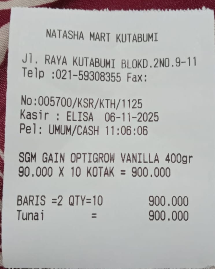 Dana digunakan untuk 1. Reimburse Susu SGM Optigrow 400gr Rp. 90.000 x 10kotak = Rp. 900.000 2. Reimburse Pampers mamypoko isi 42pc Rp. 68.000 x 5 ball = Rp. 340.000 3. Reimburse Akupuntur 4 kali Rp. 185.000 x 4 = Rp. 740.000 4. Reimburse NGT 2 pc Rp. 39.500 x 2 pcs = Rp. 79.0002025-11-10 14:47:35