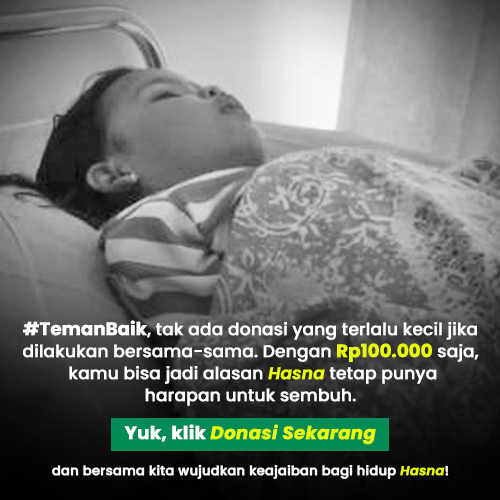 #TemanBaik, tak ada donasi yang terlalu kecil jika dilakukan bersama-sama. Dengan Rp100.000 saja, kita bisa jadi alasan Hasna tetap punya harapan untuk sembuh. Yuk, klik Donasi Sekarang dan bersama kita wujudkan keajaiban bagi hidup Hasna!