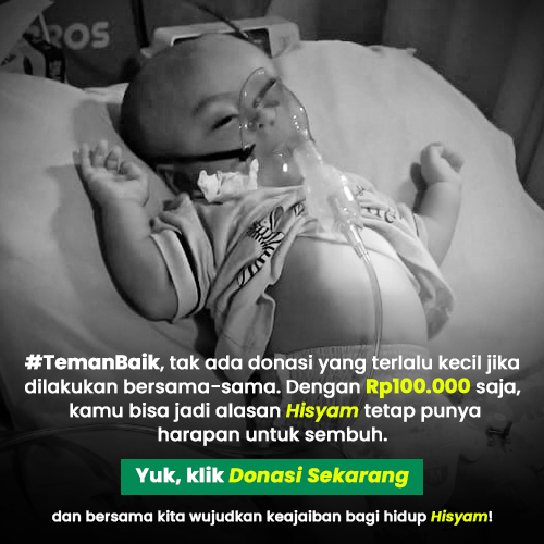 #TemanBaik, tak ada donasi yang terlalu kecil jika dilakukan bersama-sama. Dengan Rp100.000 saja, kita bisa jadi alasan Hisyam tetap punya harapan untuk sembuh. Yuk, klik Donasi Sekarang dan bersama kita wujudkan keajaiban bagi hidup Hisyam!