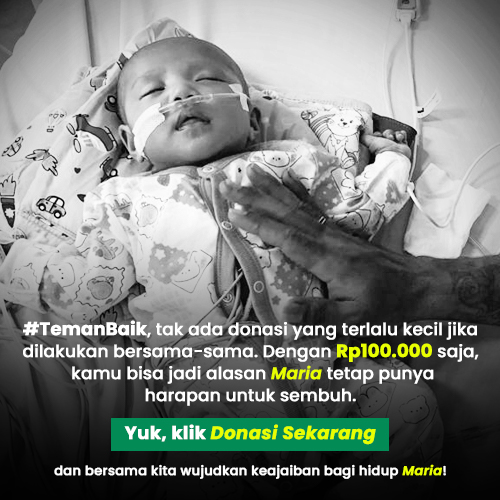 #TemanBaik, tak ada donasi yang terlalu kecil jika dilakukan bersama-sama. Dengan Rp100.000 saja, kita bisa jadi alasan Maria tetap punya harapan untuk sembuh. Yuk, klik Donasi Sekarang dan bersama kita wujudkan keajaiban bagi hidup Maria!