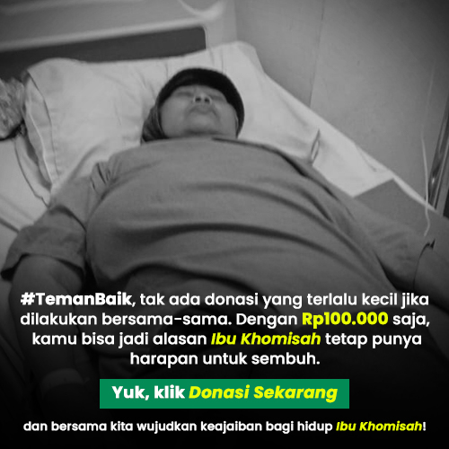 #TemanBaik, tak ada donasi yang terlalu kecil jika dilakukan bersama-sama. Dengan Rp100.000 saja, kita bisa jadi alasan Ibu Khomisah tetap punya harapan untuk sembuh. Yuk, klik Donasi Sekarang dan bersama kita wujudkan keajaiban bagi hidup Ibu Khomisah!