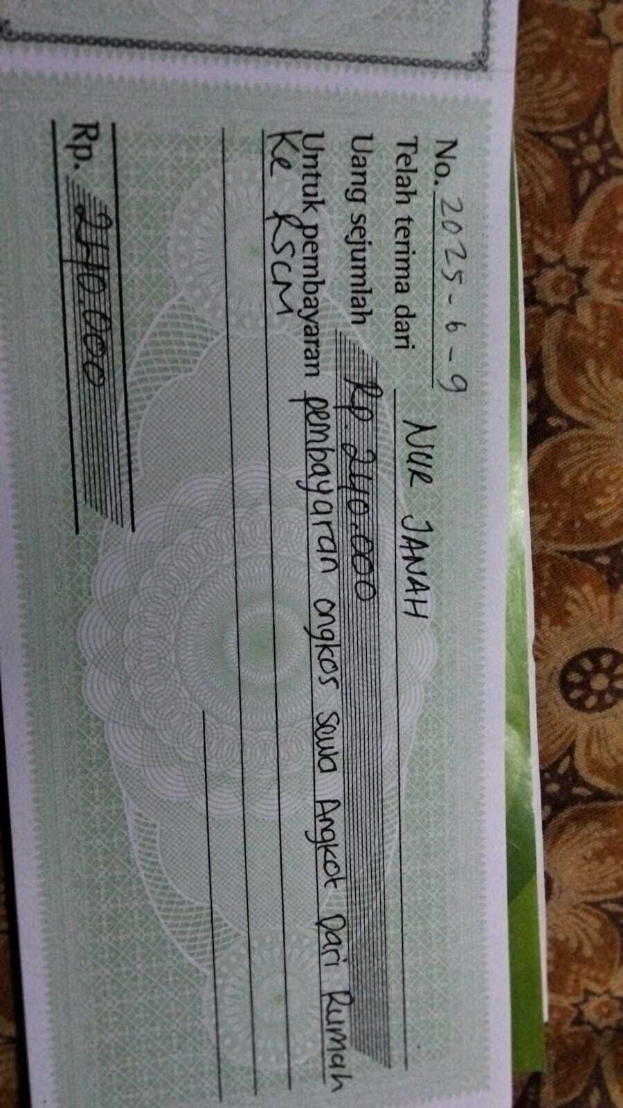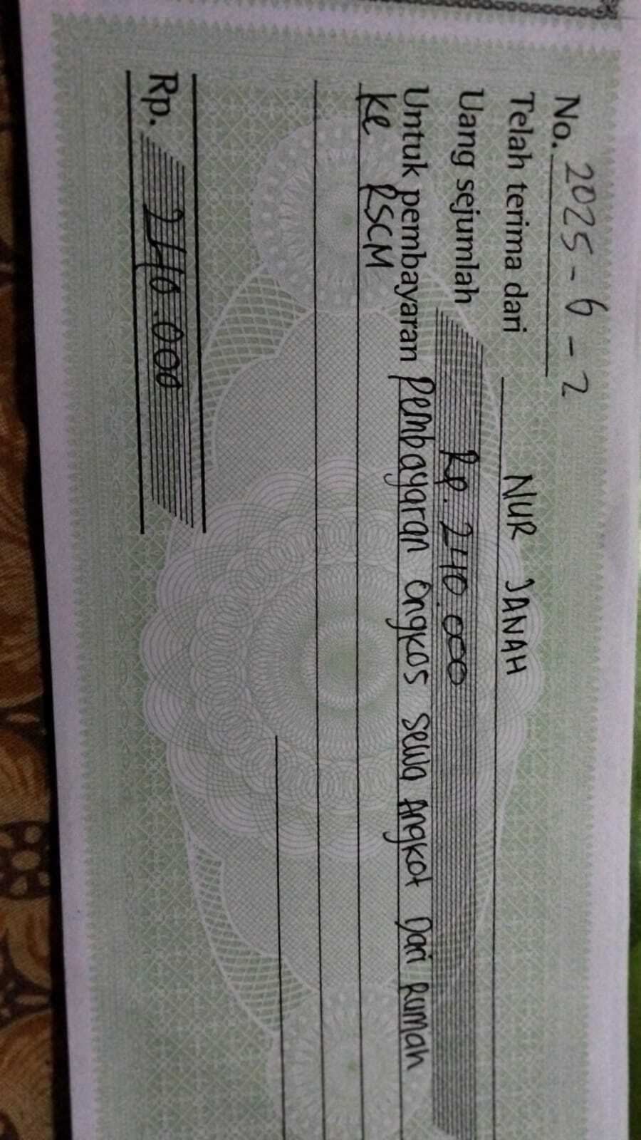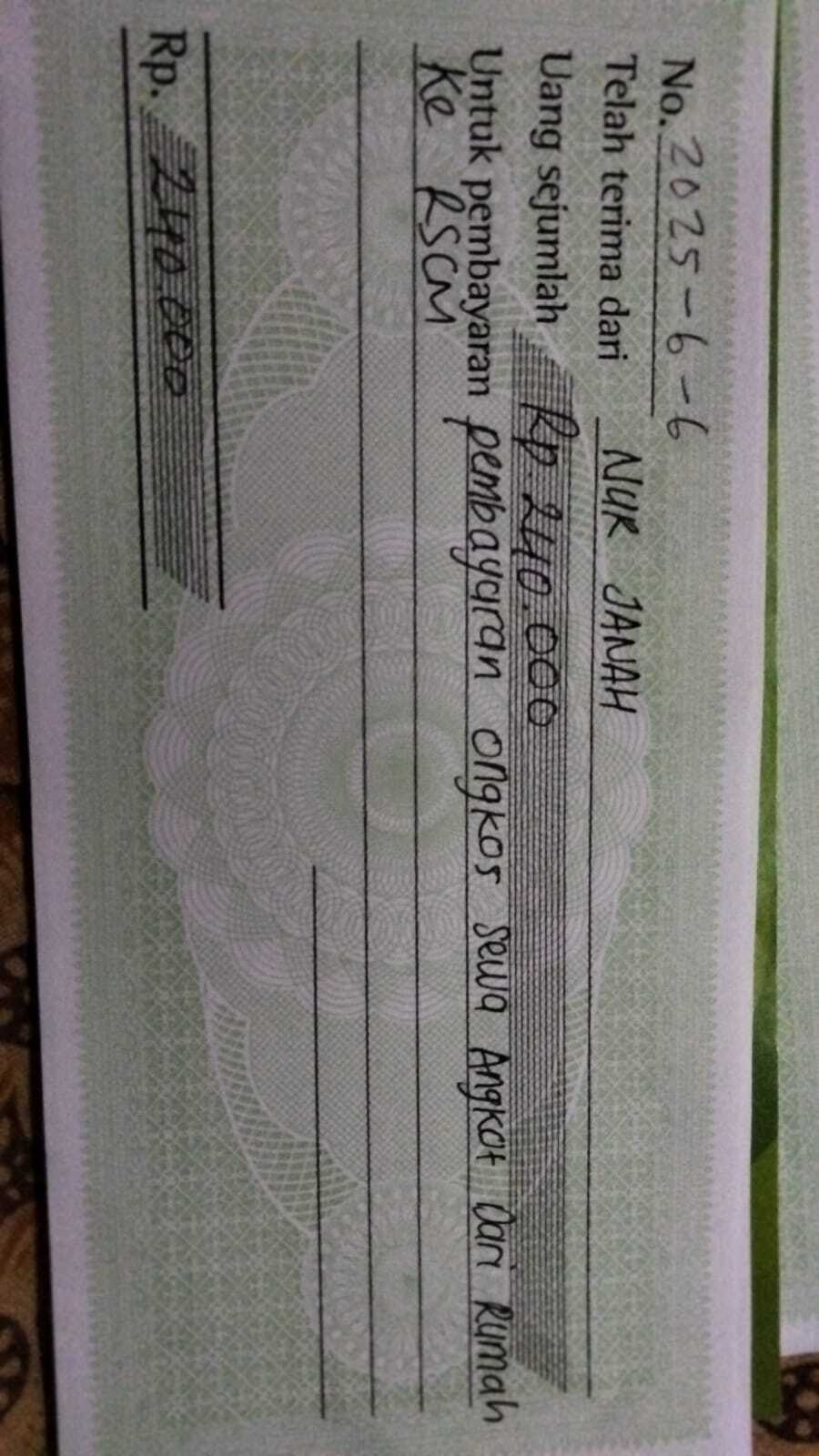 Dana digunakan untuk 1. Transportasi online ke RSCM Rp240.000 x 4 kali = Rp960.000 2. Biaya kursi roda Rp1.000.000 3. Obat pedilax Rp300.000 x 3pcs= Rp900.0002025-06-11 09:34:40