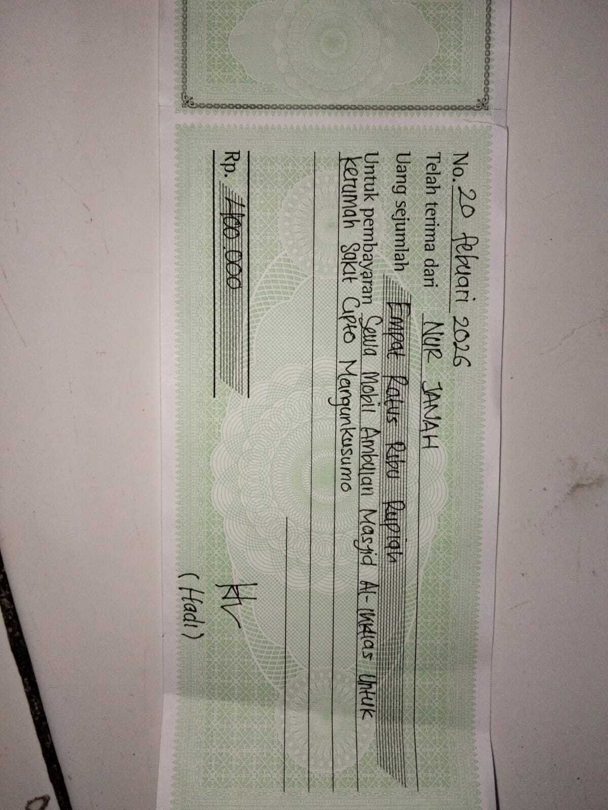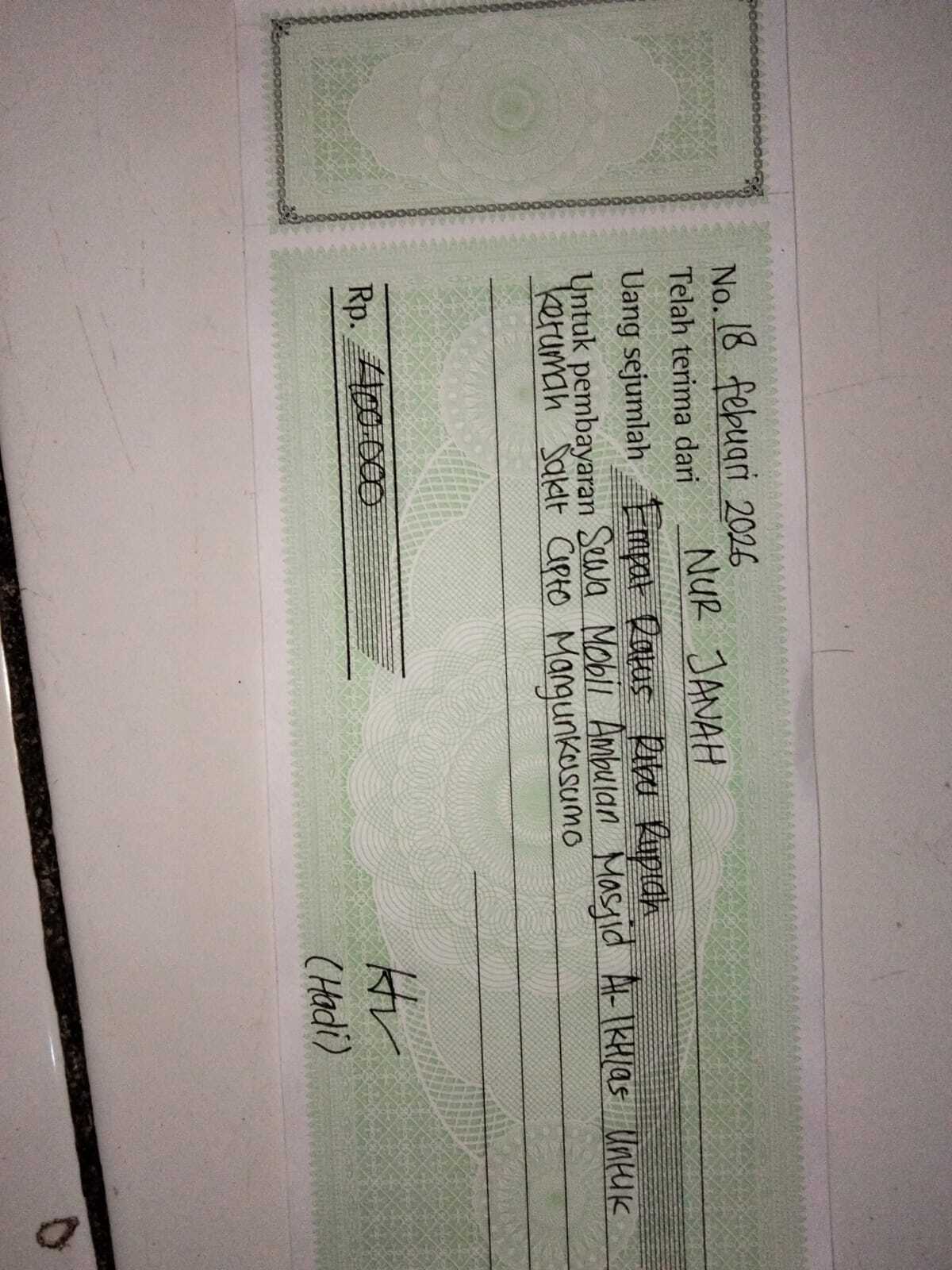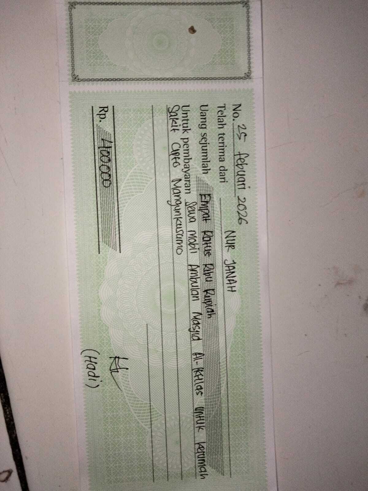 Dana digunakan untuk 1. Pembelian kursi roda celebral palsy Rp4,000,000 2. Sewa mobil ambulan pp Rp400.000 x 8 kali= Rp3.200.002026-03-06 09:49:17