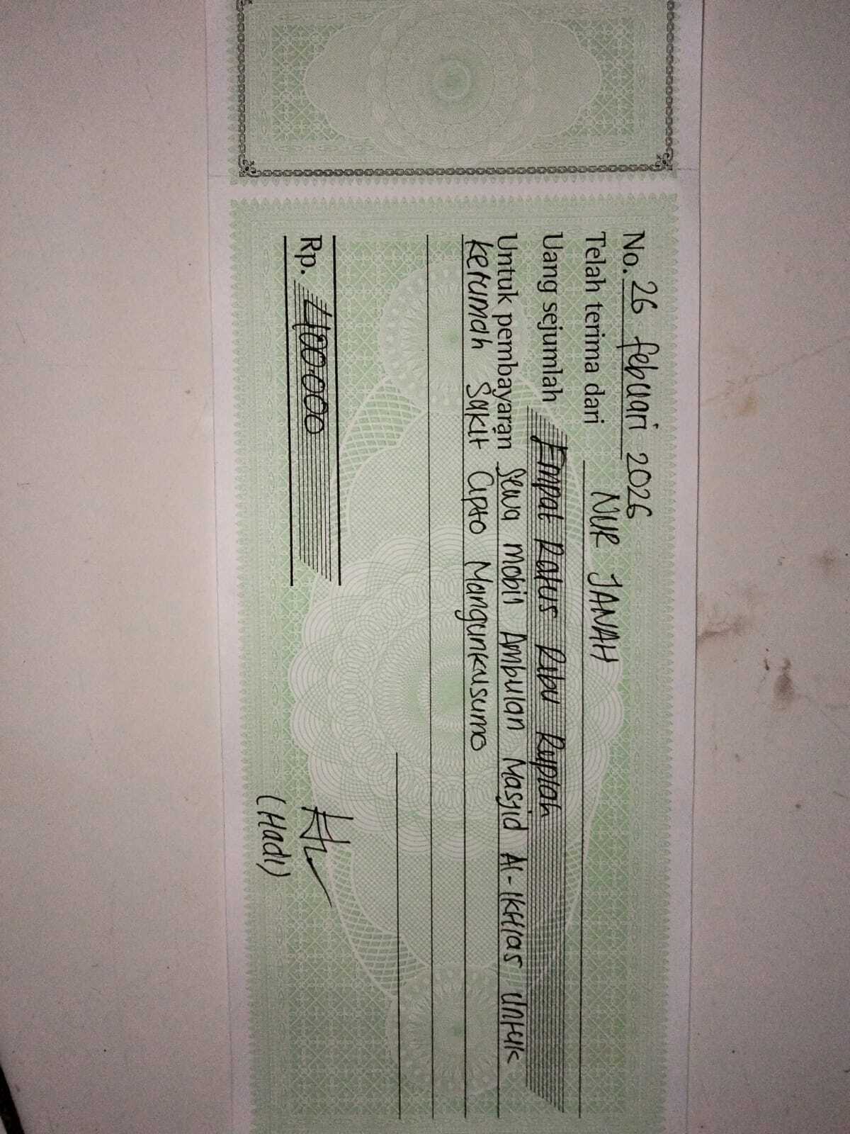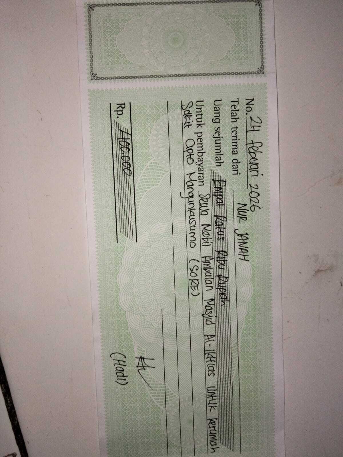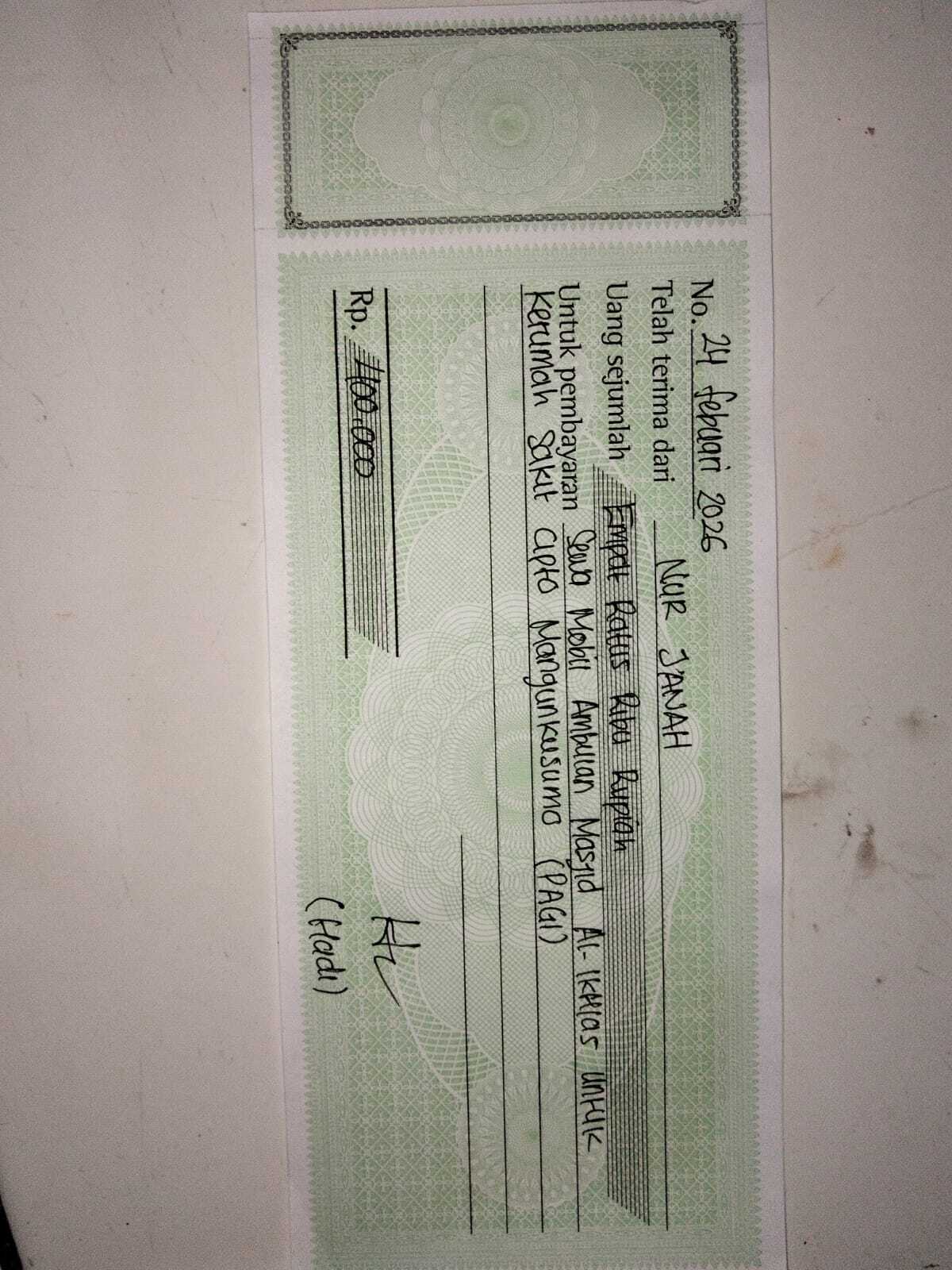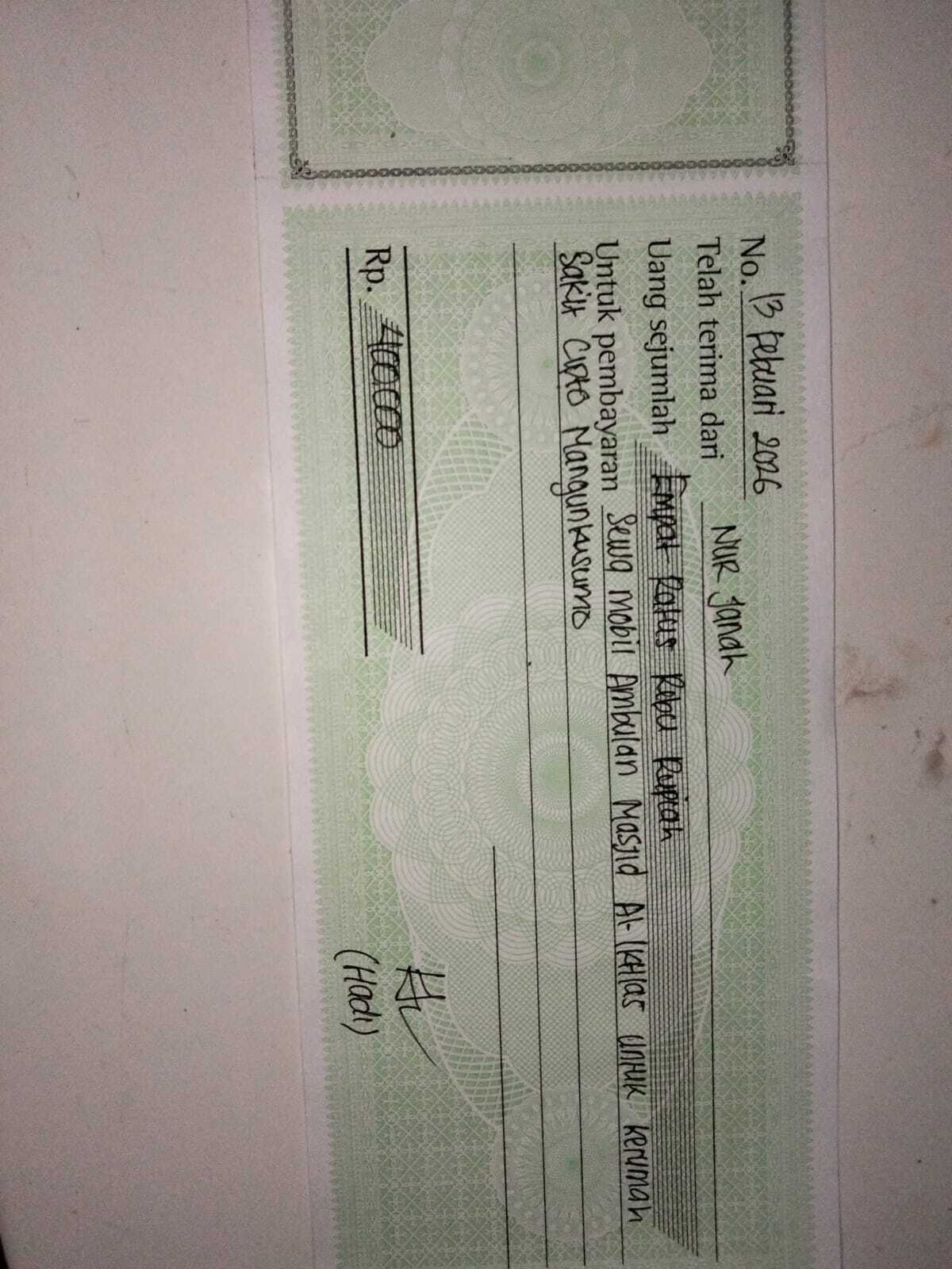 Dana digunakan untuk 1. Pembelian kursi roda celebral palsy Rp4,000,000 2. Sewa mobil ambulan pp Rp400.000 x 8 kali= Rp3.200.002026-03-06 09:49:17