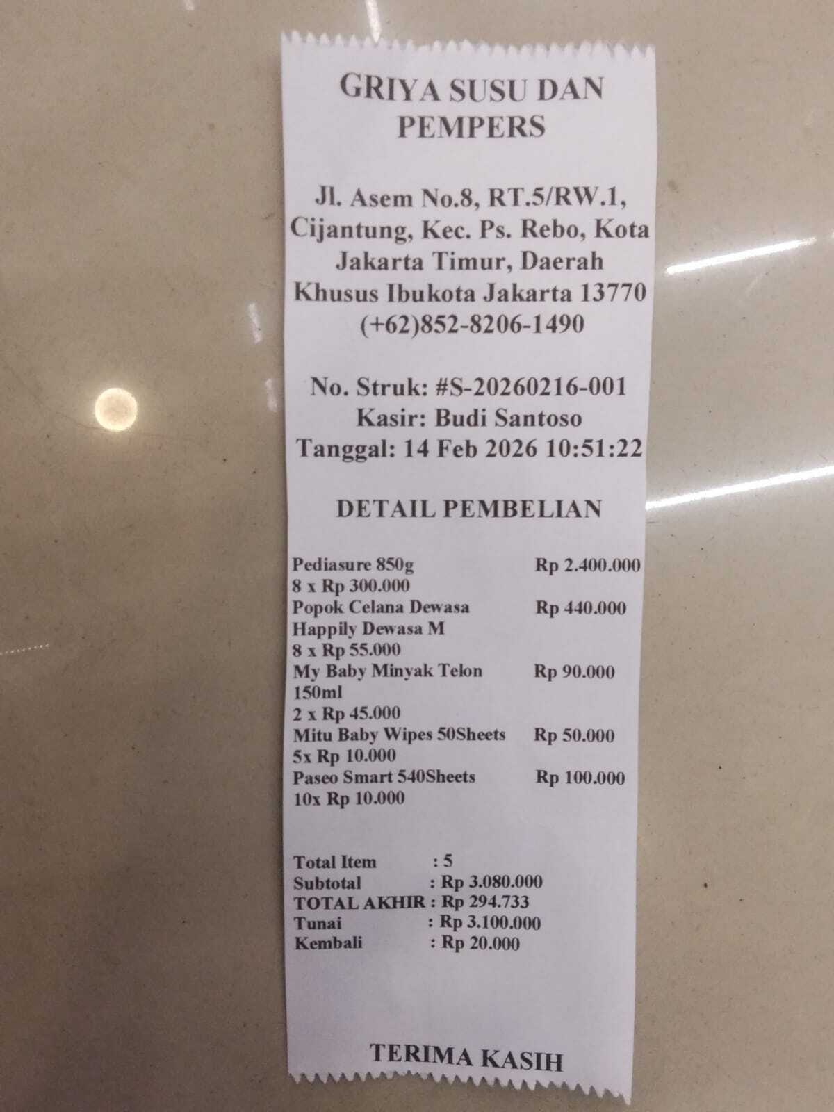 Dana digunakan untuk 1. Sewa mobil ambulan pp Rp400.000 x 8 kali= Rp3.200.000 2. Susu pediasure Rp300.000 x 8 kaleng= Rp2.400.000 3. Pampers Rp55.000 x 8 ball = Rp440.000 4. Minyak telon Rp45.000 x 2 botol = Rp90.000 5. Tisu basah Rp10.000 x 5pcs = Rp50.000 6. Tisu kering Rp10.000 x 10pcs = Rp100.0002026-02-16 09:24:39