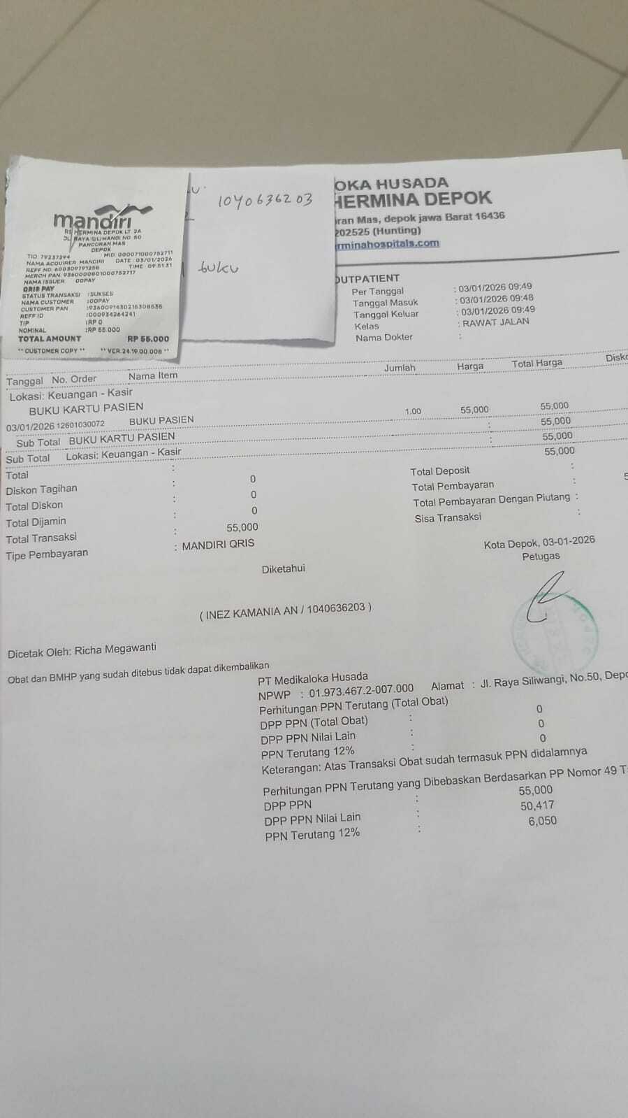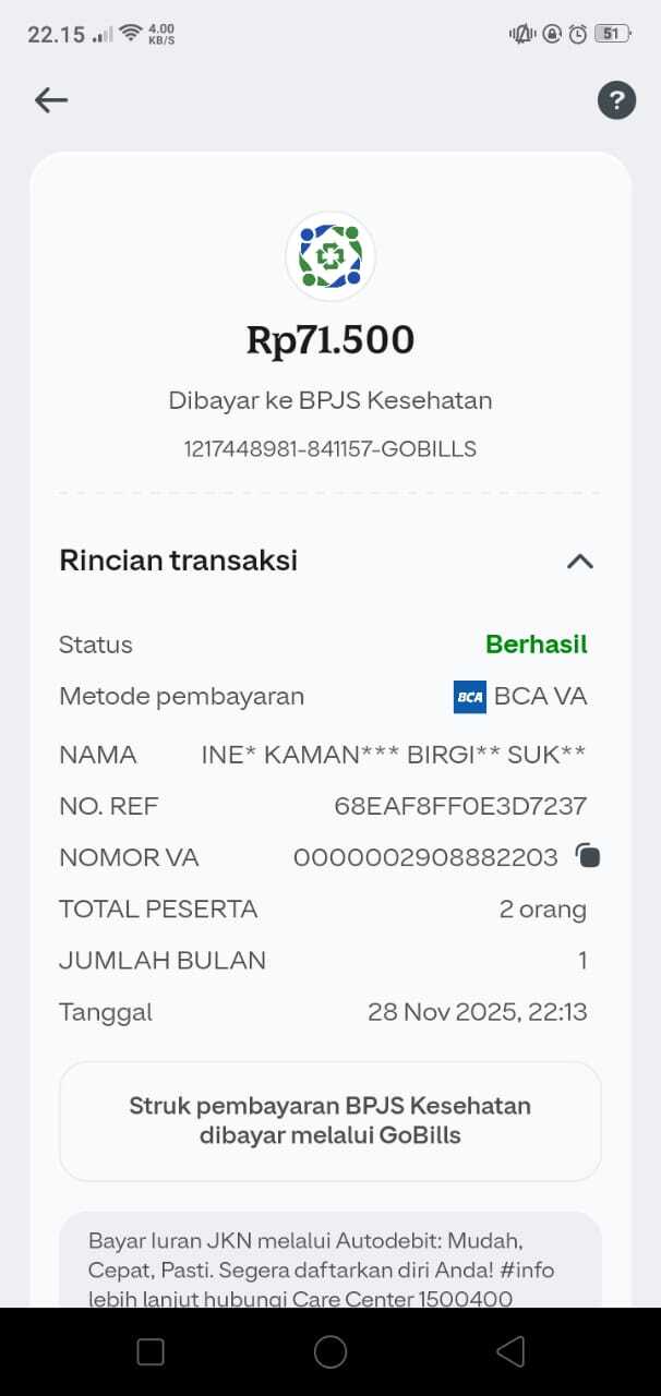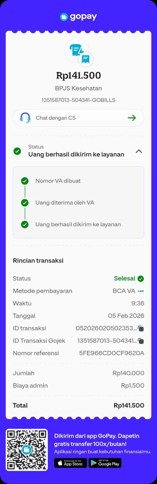 Dana digunakan untuk 1. Susu sgm optigrow 800gr x 2 pack = Rp350.000 2. Pampers 3 pack = Rp 200.000 3. Buah & snack Rp 300.000 4. Pembayaran bpjs Rp75.000 5. Vitamin Rp100.000 6. Transportasi bensin untuk kontrol ke RS HerminaRp 100.000 7. Transportasi bensin untuk kontrol ke RS SENTRA MEDIKA Rp100.000 8. Konsumsi kontrol Rp 100.000 9. Tissue basah & Kering Rp 75.0002025-12-01 09:40:44