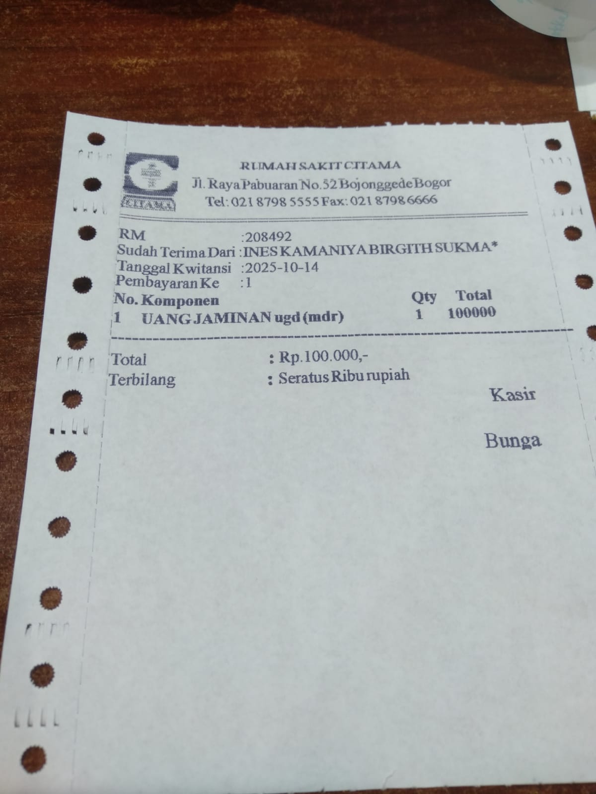 Dana digunakan untuk 1. Reimburse uang jaminan ke RS Rp.100.000 2. Reimburse tindakan pengambil darah (cek lab tyfus) Rp.70.000 3. Pembelian bensin untuk ke RS Rp.50.000 4. Konsumsi rawat inap Rp.277.5002025-10-16 11:17:03