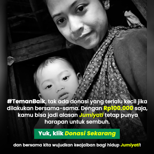 #TemanBaik, tak ada donasi yang terlalu kecil jika dilakukan bersama-sama. Dengan Rp100.000 saja, kita bisa jadi alasan Jumiyati tetap punya harapan untuk sembuh. Yuk, klik Donasi Sekarang dan bersama kita wujudkan keajaiban bagi hidup Jumiyati!