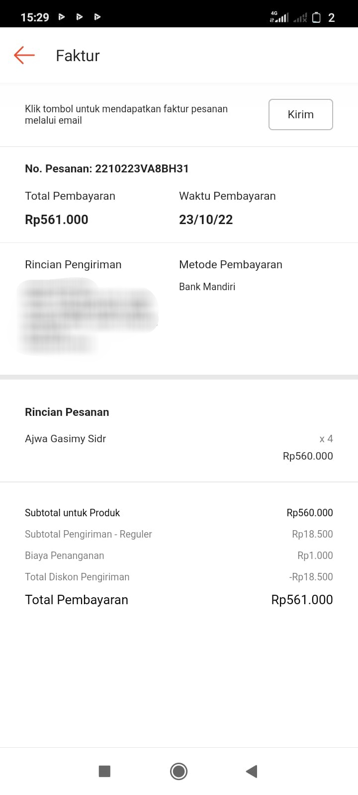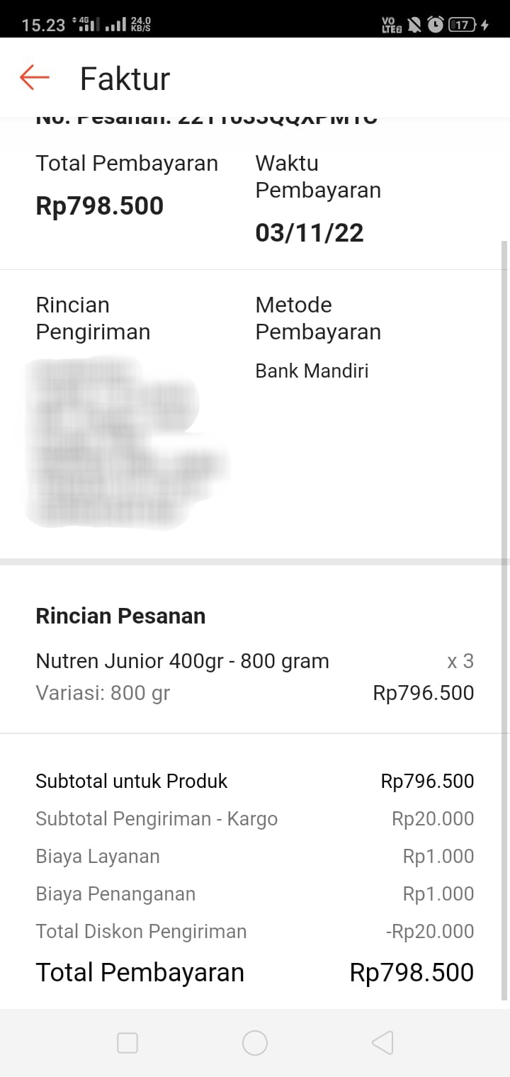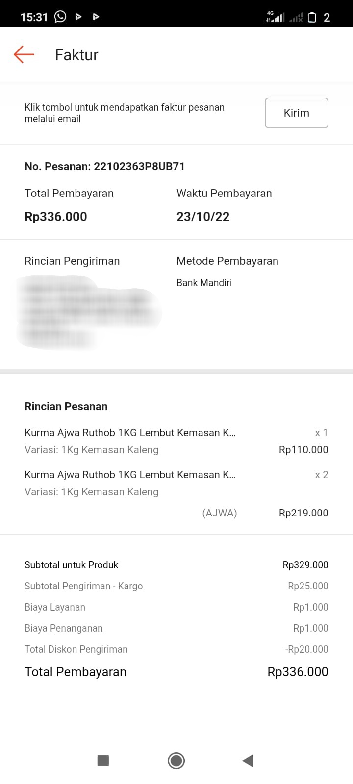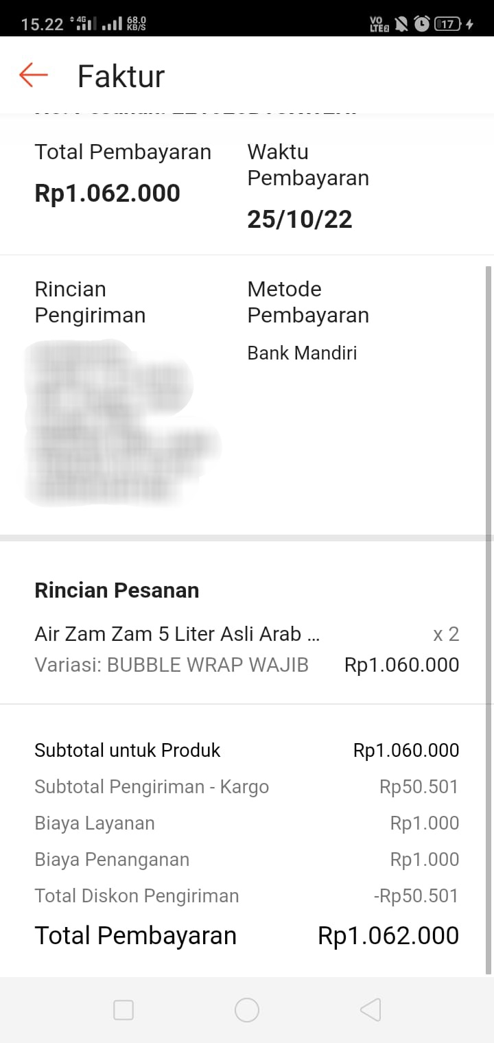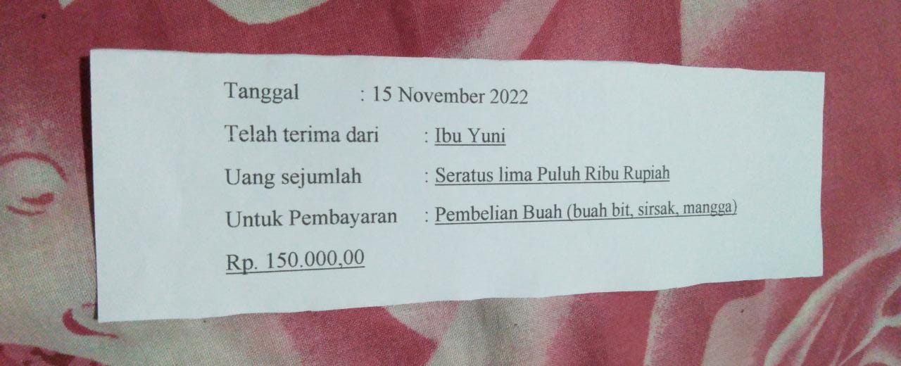 Dana digunakan untuk: 1. Paket suplemen terapi kanker (kmuricata+mazon b) = Rp1.370.000 2. Air zam-zam @550.000 x 2 = Rp1.100.000 3. Kurma ajwa @75.000 x 4 = Rp300.000 4. Madu ajwa gasymi 175 gram @140.000 x 4 = Rp560.000 5. Susu nutren jr @257.000 x 3 = Rp771.000 6. Buah @30.000 x 30 = Rp900.000.2022-10-04 18:17:24
