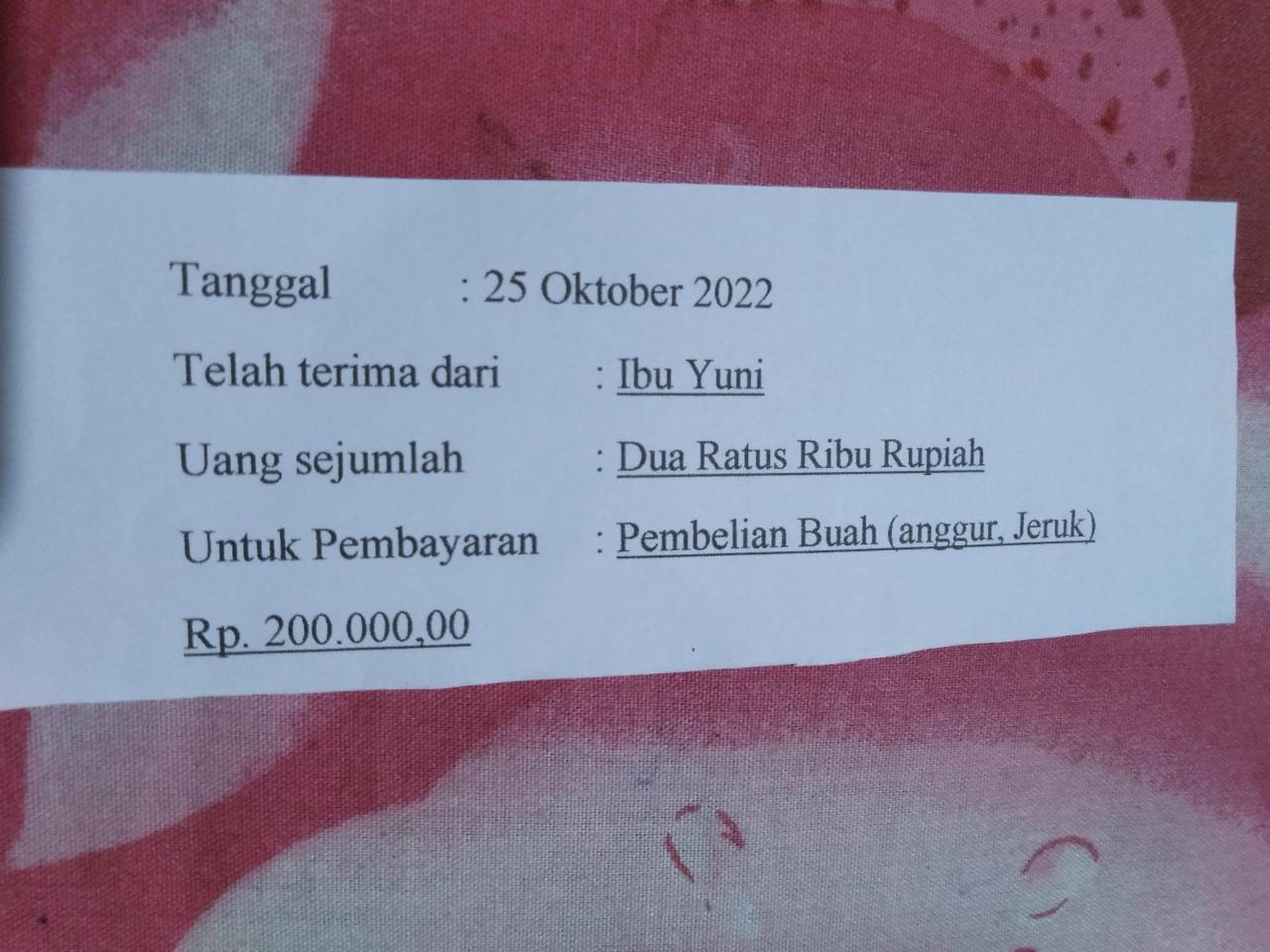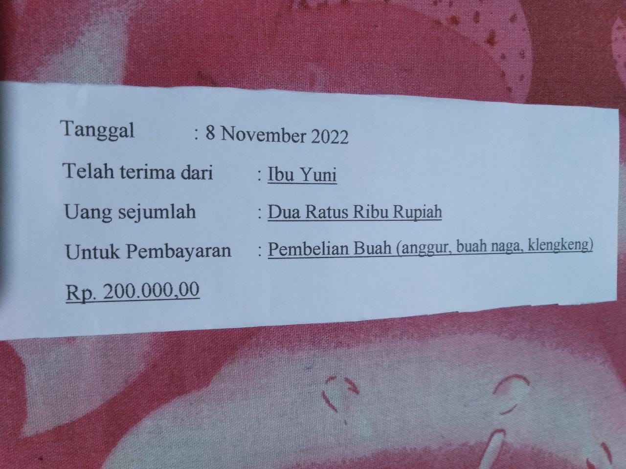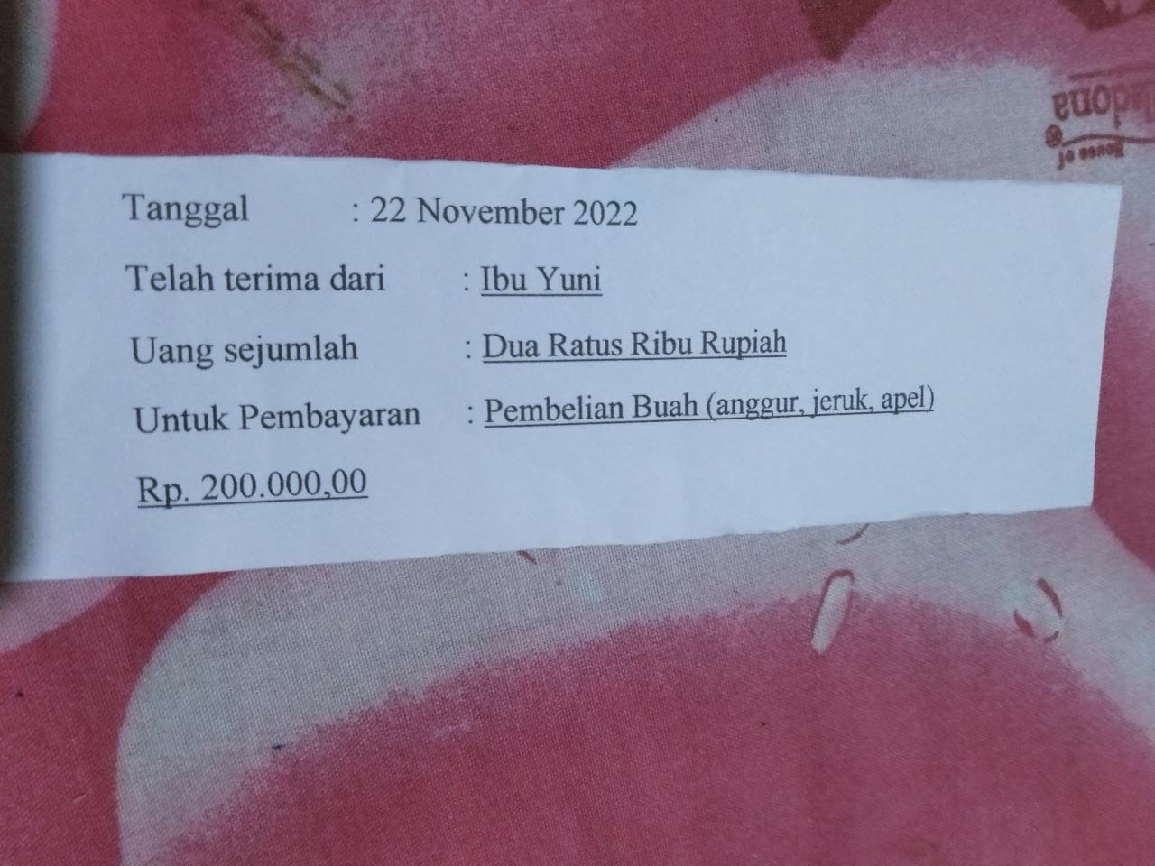 Dana digunakan untuk 1. Alat Juicer Philips Rp725.000 2. Alat timbangan badan Rp100.000 3. Alat Oximeter anak Rp140.000 4. Alat Difuser aromaterapi Rp620.000 5. Alat termometer tembak Rp100.000 6. Air Zam-zam 5 liter 550.000 x 2= Rp1.100.000 7. Susu Nutren Junior 282.000 x 6= Rp1.692.000 8. Madu Al Shifa 1 kg 169.000 x 3= Rp507.000.2023-02-09 17:16:31