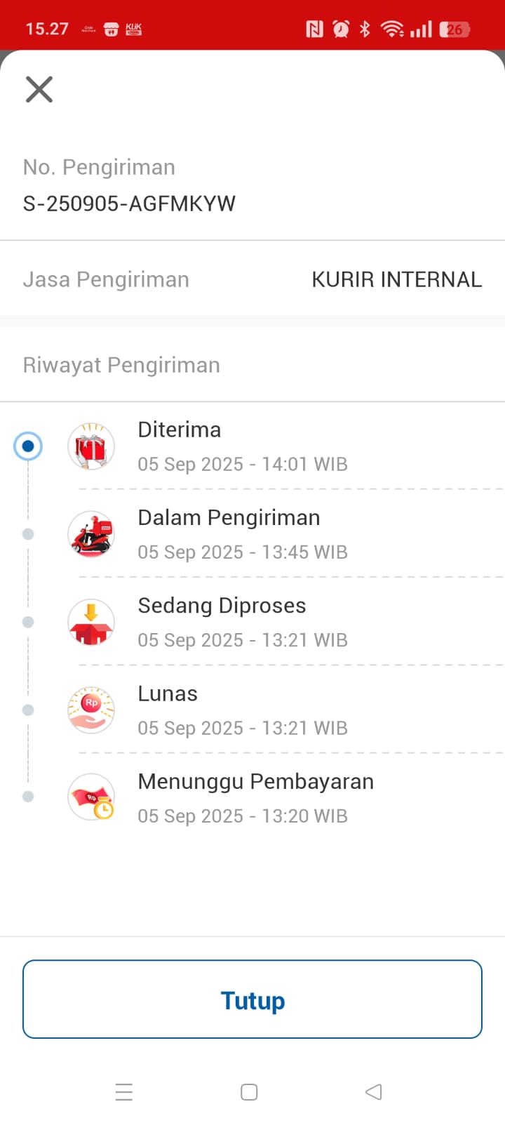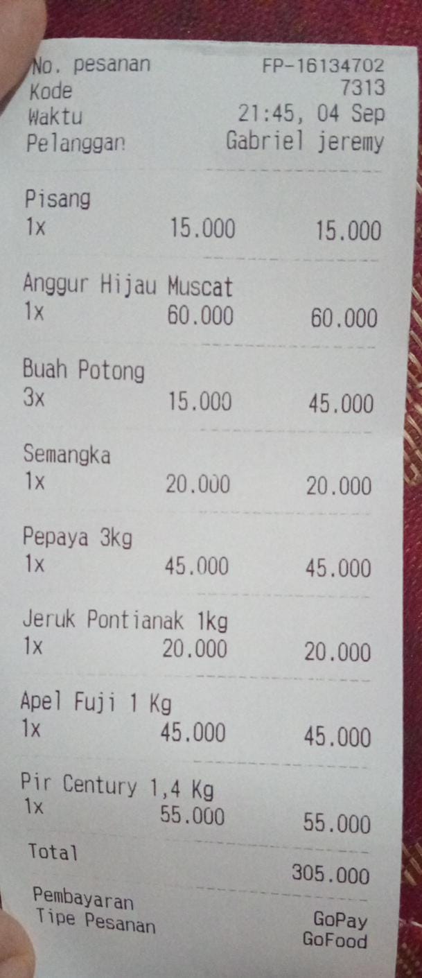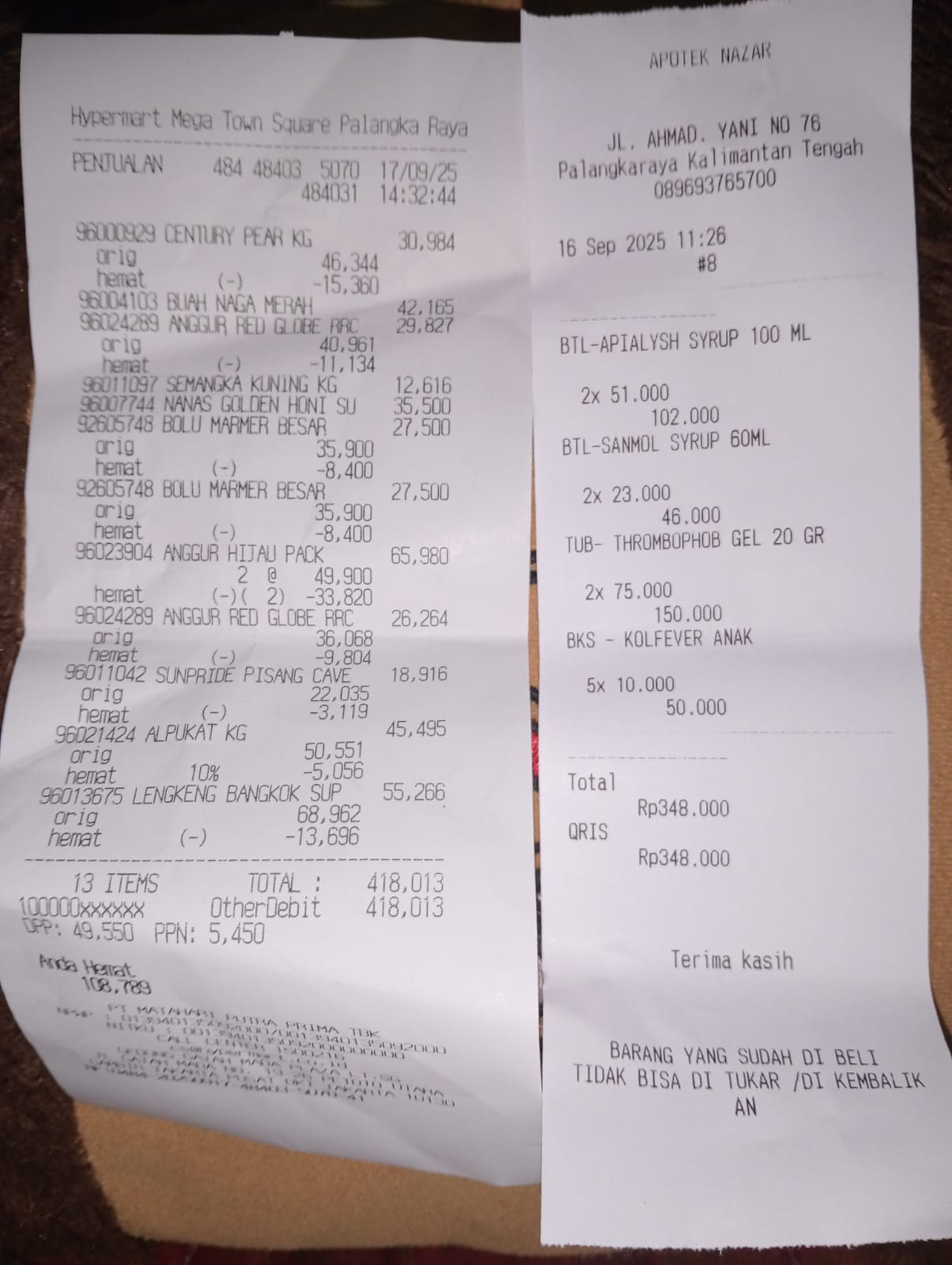 Dana digunakan untuk 1. Buah Rp300.000 2. THROMBOPHOB Gel Rp75.000x 2 =Rp 150.000 3. Kolfiver Rp10.000 x 5=. Rp50.000 4. Sanmol sirup Rp25.000 x2= Rp50.000 5. Apialysh sirup Rp51.000 x 2= Rp102.0002025-09-17 13:50:03