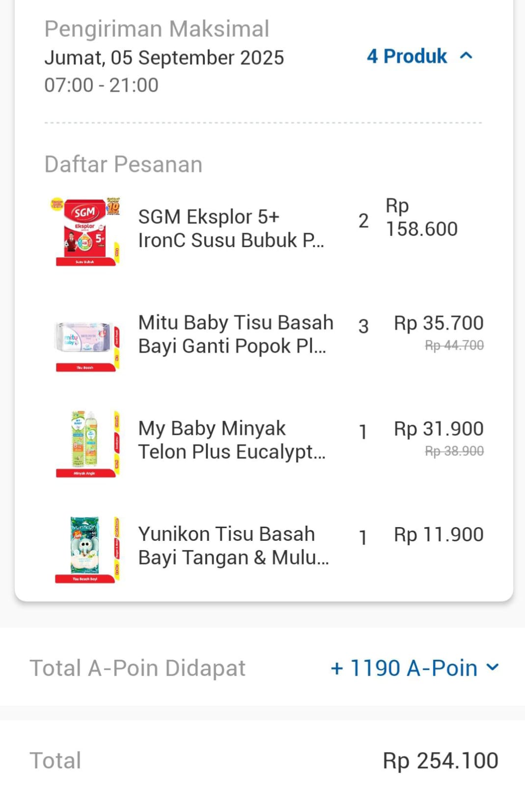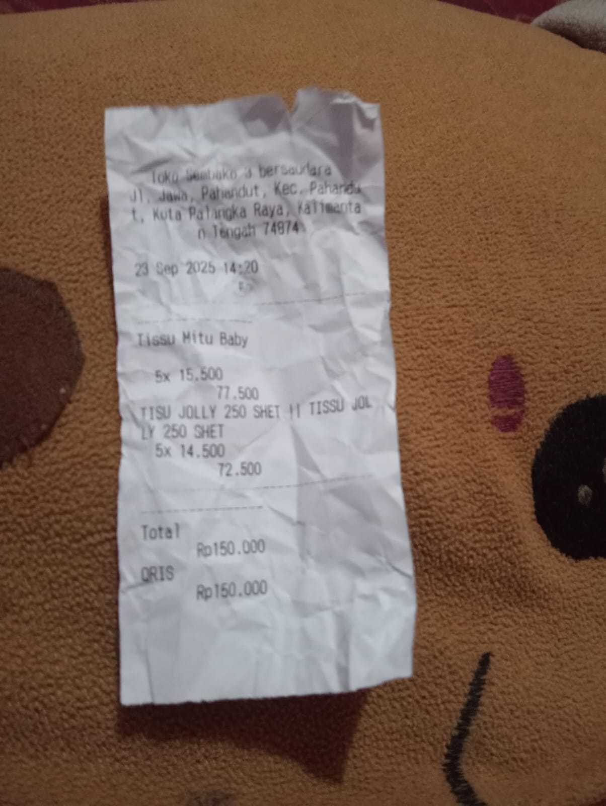 Dana digunakan untuk 1. Minyak telon Rp40.000 2. Tisu basah Rp15.000 x 3 = Rp45.000 3. Susu SGM 5+ Rp80.000X 2 dus= Rp160.000 4. Buah buahan Rp300.0002025-07-28 11:55:06
