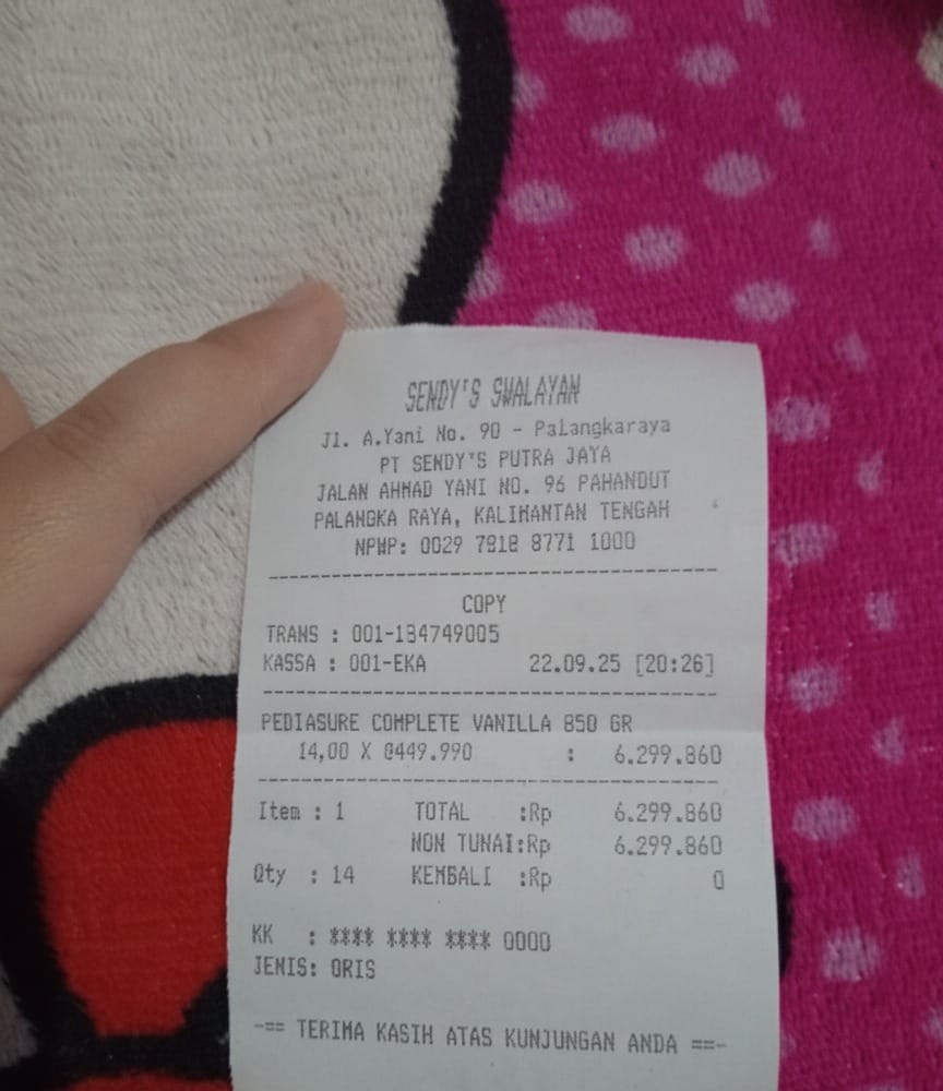Dana digunakan untuk Susu pediaComplete Rp450.000 X 10 kaleng = Rp4.500.0002025-10-24 16:47:28