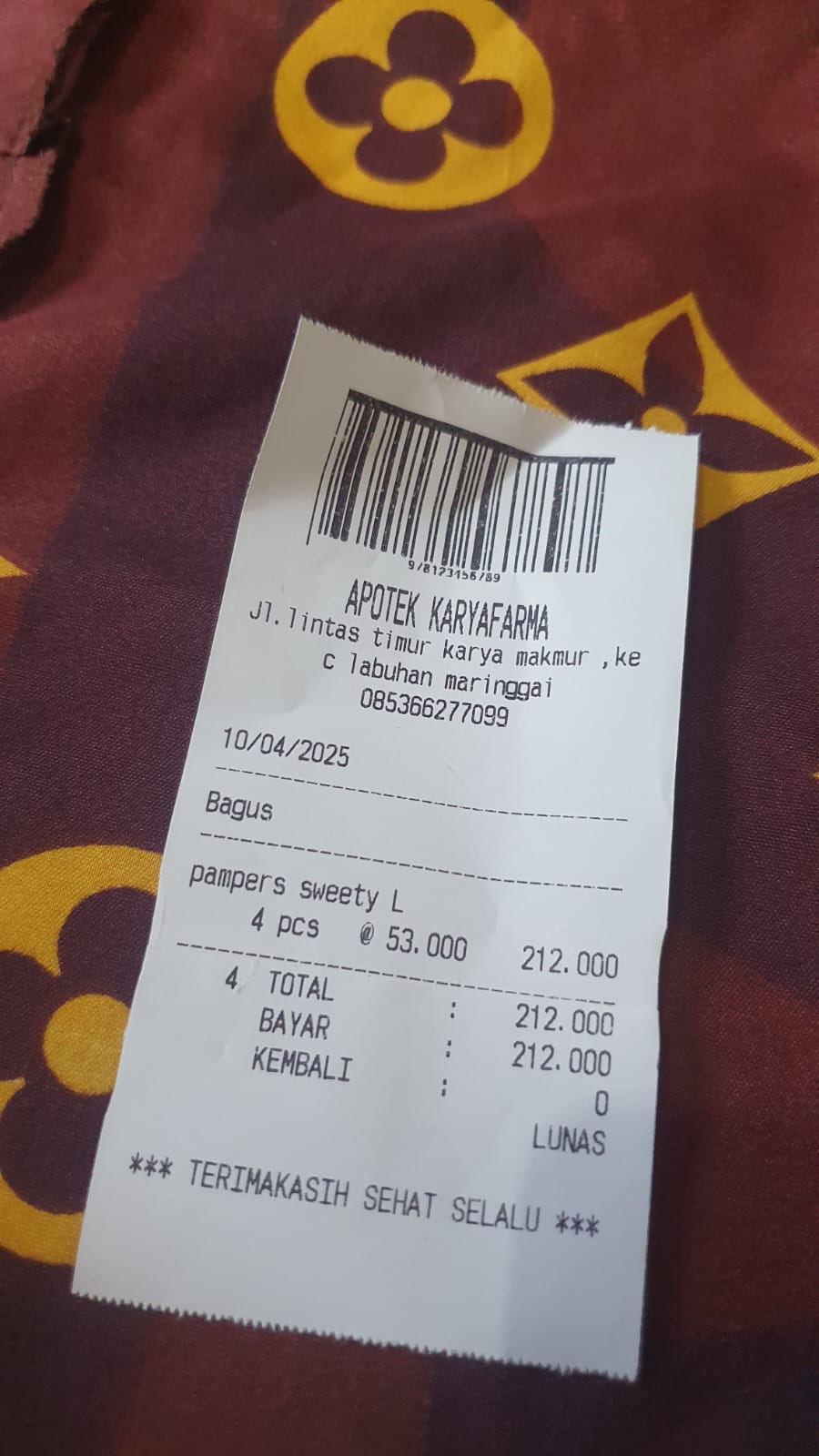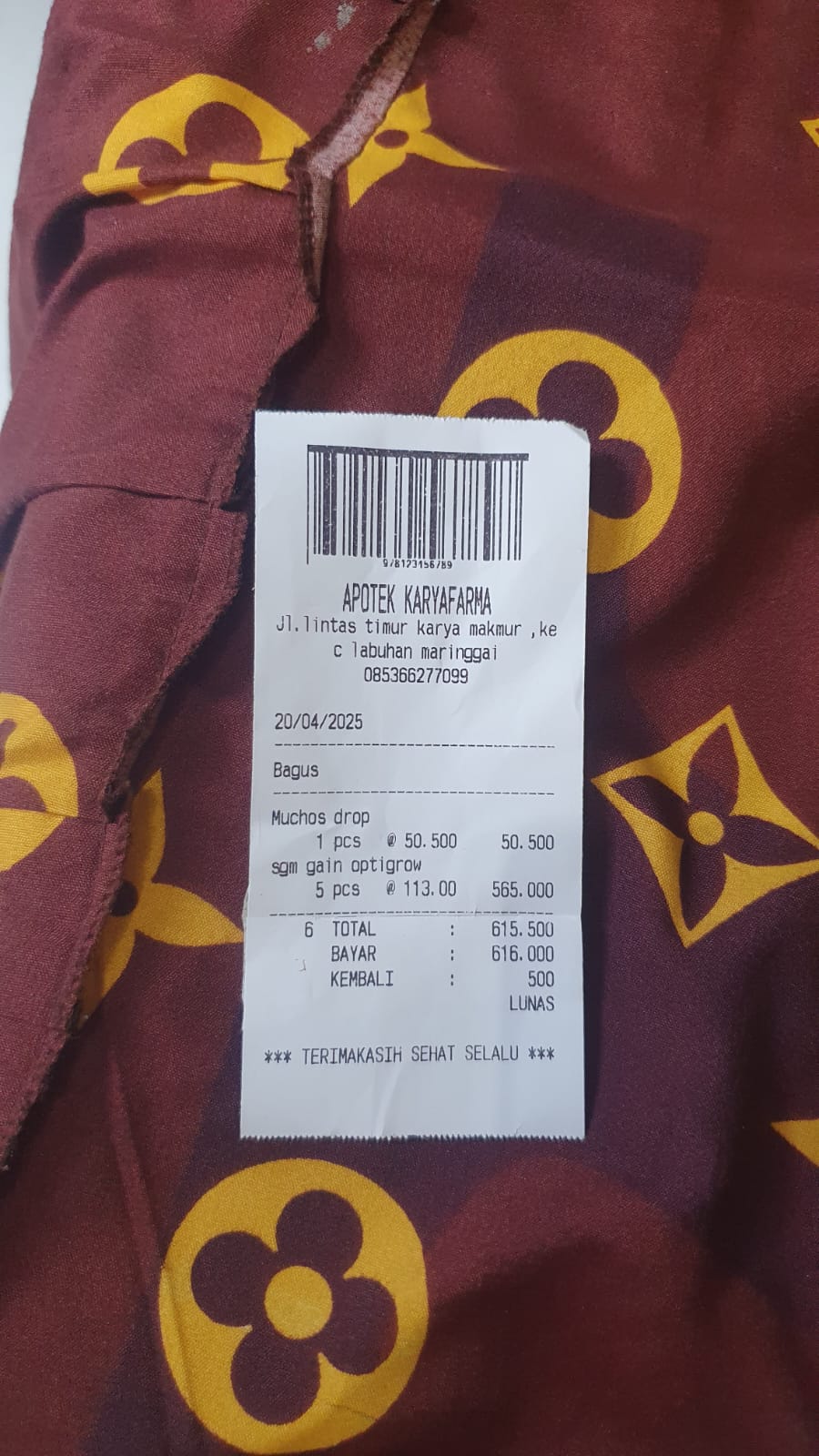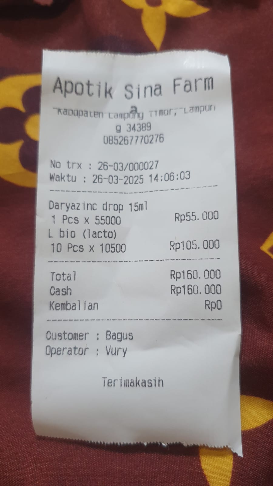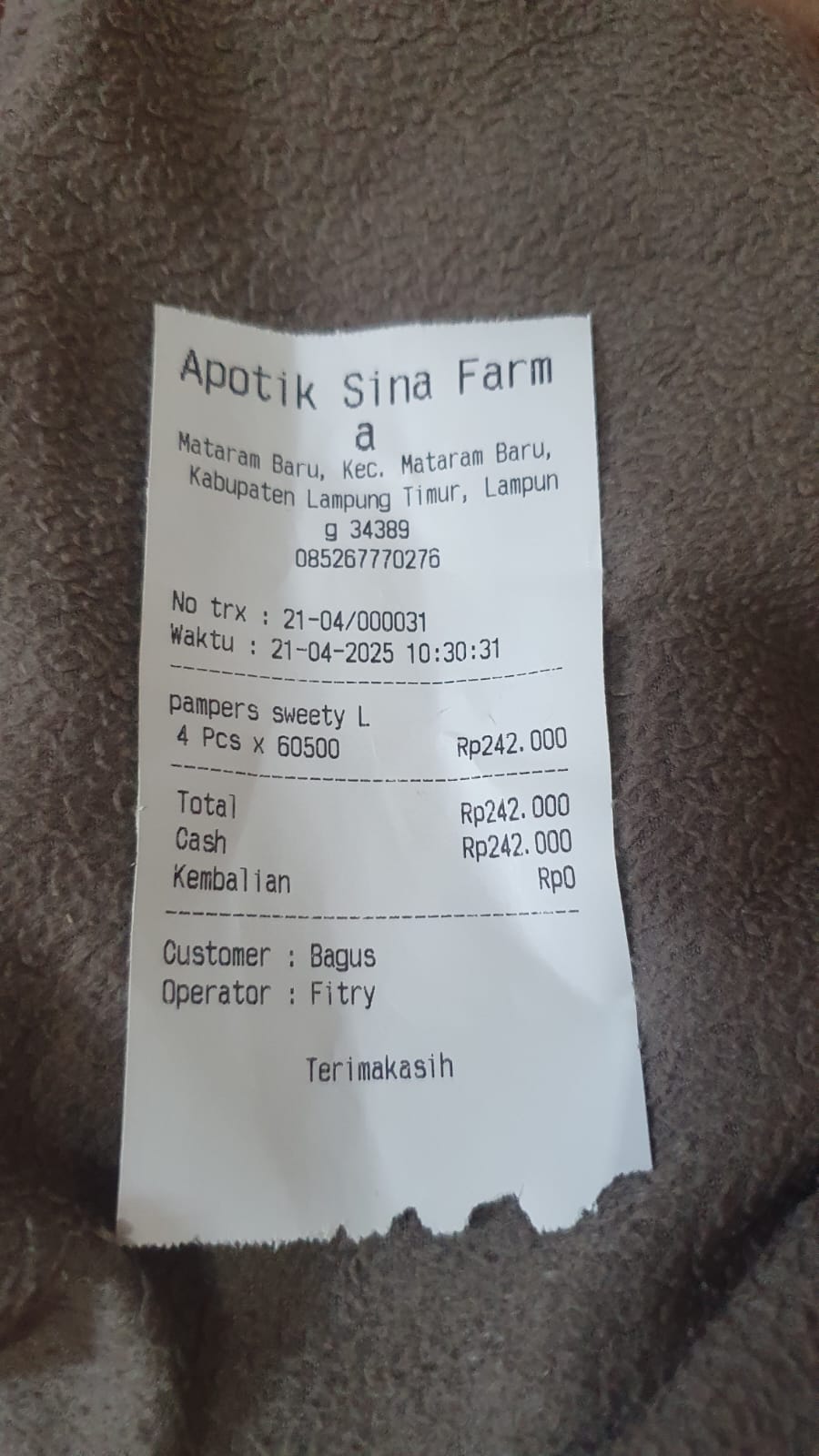 Dana digunakan untuk reimburse 1. Obat diare daryazinc Rp 55.000 2. Vitamin L bio lacto b 10 pcs Rp Rp105.000 3. Susu SGM optigrow ungu Rp112.500 x 5 pcs = Rp 562.500 4. Pampers sweety L Rp60.400 x 4pcs = Rp242.000 5. Susu SGM optigrow ungu Rp113.000 x 5 pcs = Rp565.000 6. Pampers sweety L Rp53.000 x 4 pcs = Rp 212.000 7. Susu SGM optigrow ungu 5 pcs Rp 562.500 8. Muchos drop (obat batuk) 1 pcs Rp 50.500 9. SGM gain optigrow ungu 5 pcs Rp 565.000 10. Pampers sweety L 4 pcs Rp 242.0002025-04-28 14:21:05