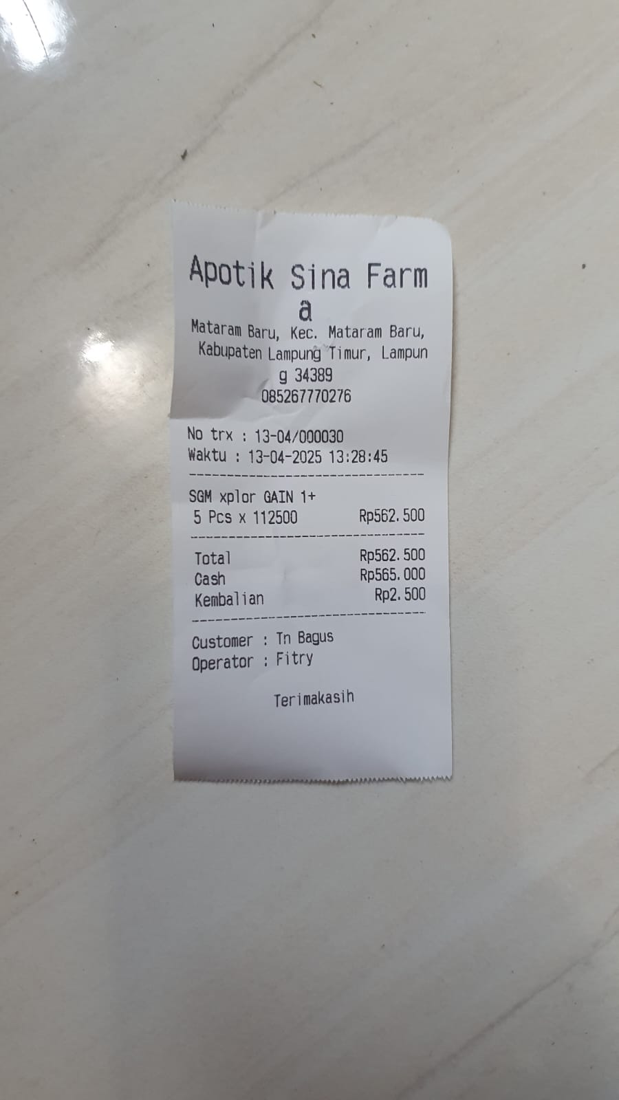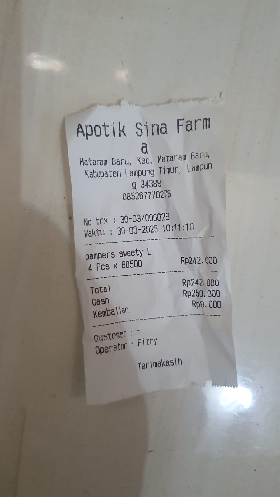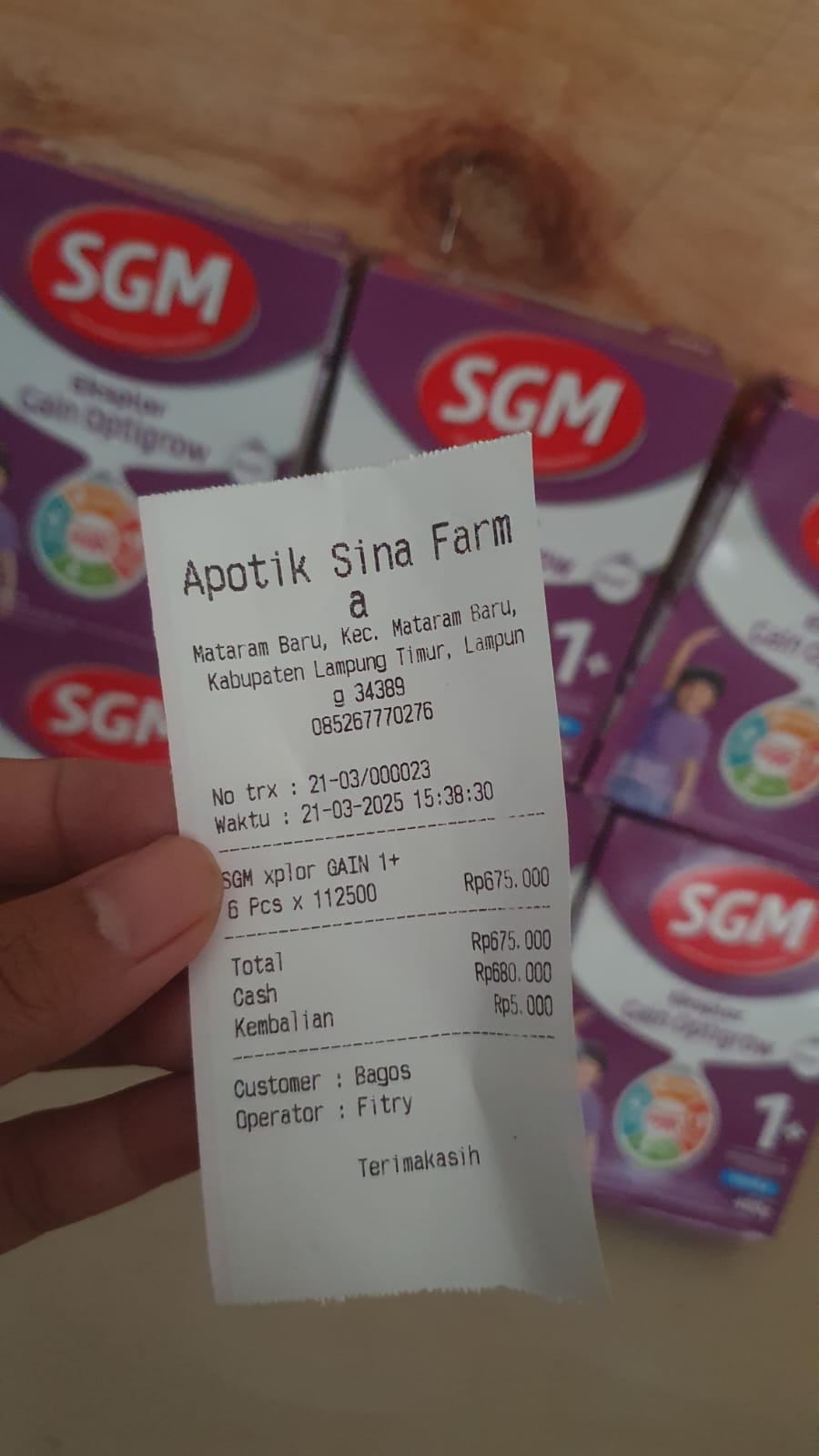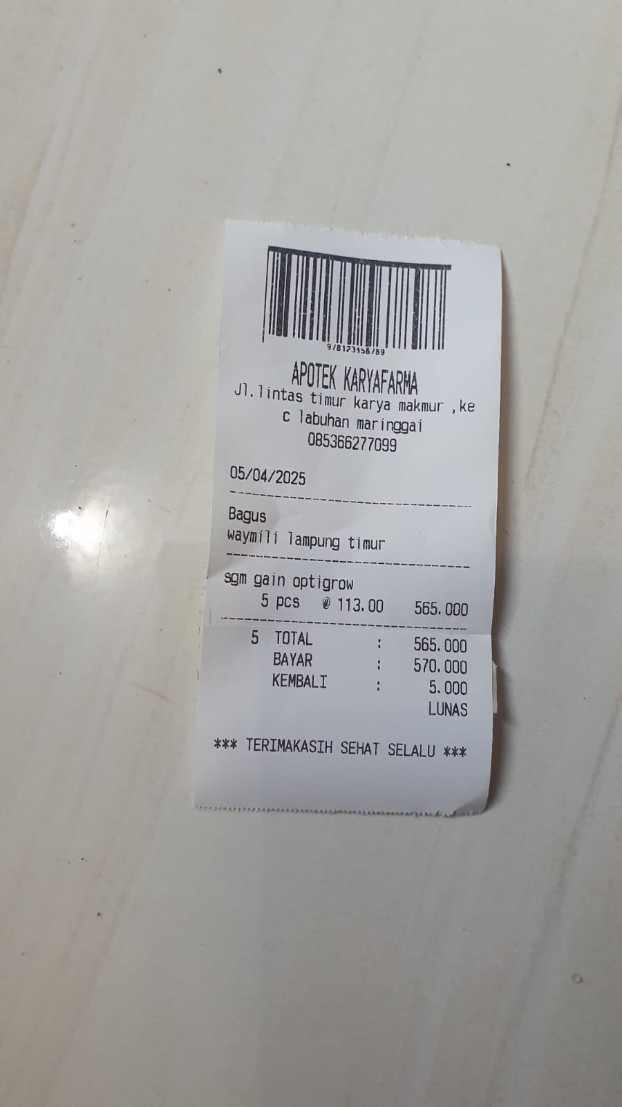 Dana digunakan untuk reimburse 1. Obat diare daryazinc Rp 55.000 2. Vitamin L bio lacto b 10 pcs Rp Rp105.000 3. Susu SGM optigrow ungu Rp112.500 x 5 pcs = Rp 562.500 4. Pampers sweety L Rp60.400 x 4pcs = Rp242.000 5. Susu SGM optigrow ungu Rp113.000 x 5 pcs = Rp565.000 6. Pampers sweety L Rp53.000 x 4 pcs = Rp 212.000 7. Susu SGM optigrow ungu 5 pcs Rp 562.500 8. Muchos drop (obat batuk) 1 pcs Rp 50.500 9. SGM gain optigrow ungu 5 pcs Rp 565.000 10. Pampers sweety L 4 pcs Rp 242.0002025-04-28 14:21:05