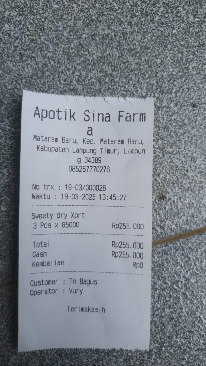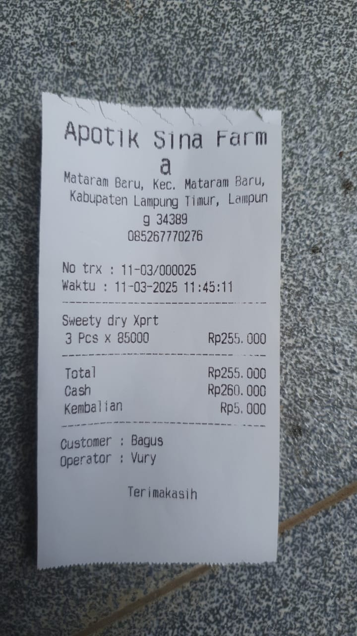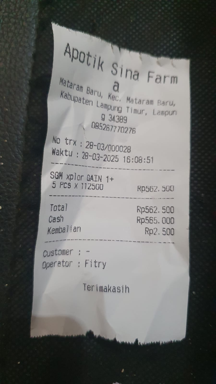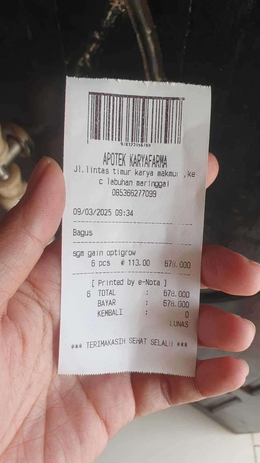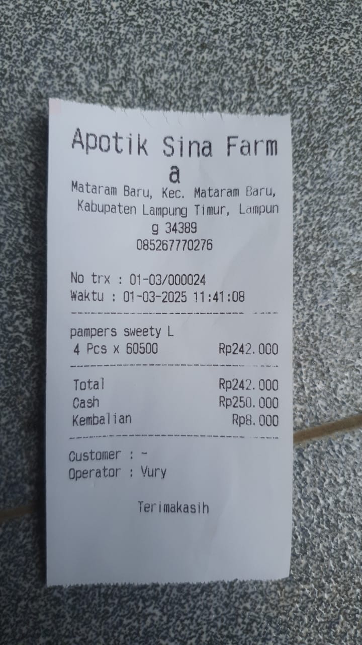 Dana digunakan untuk reimburse 1. Obat diare daryazinc Rp 55.000 2. Vitamin L bio lacto b 10 pcs Rp Rp105.000 3. Susu SGM optigrow ungu Rp112.500 x 5 pcs = Rp 562.500 4. Pampers sweety L Rp60.400 x 4pcs = Rp242.000 5. Susu SGM optigrow ungu Rp113.000 x 5 pcs = Rp565.000 6. Pampers sweety L Rp53.000 x 4 pcs = Rp 212.000 7. Susu SGM optigrow ungu 5 pcs Rp 562.500 8. Muchos drop (obat batuk) 1 pcs Rp 50.500 9. SGM gain optigrow ungu 5 pcs Rp 565.000 10. Pampers sweety L 4 pcs Rp 242.0002025-04-28 14:21:05
