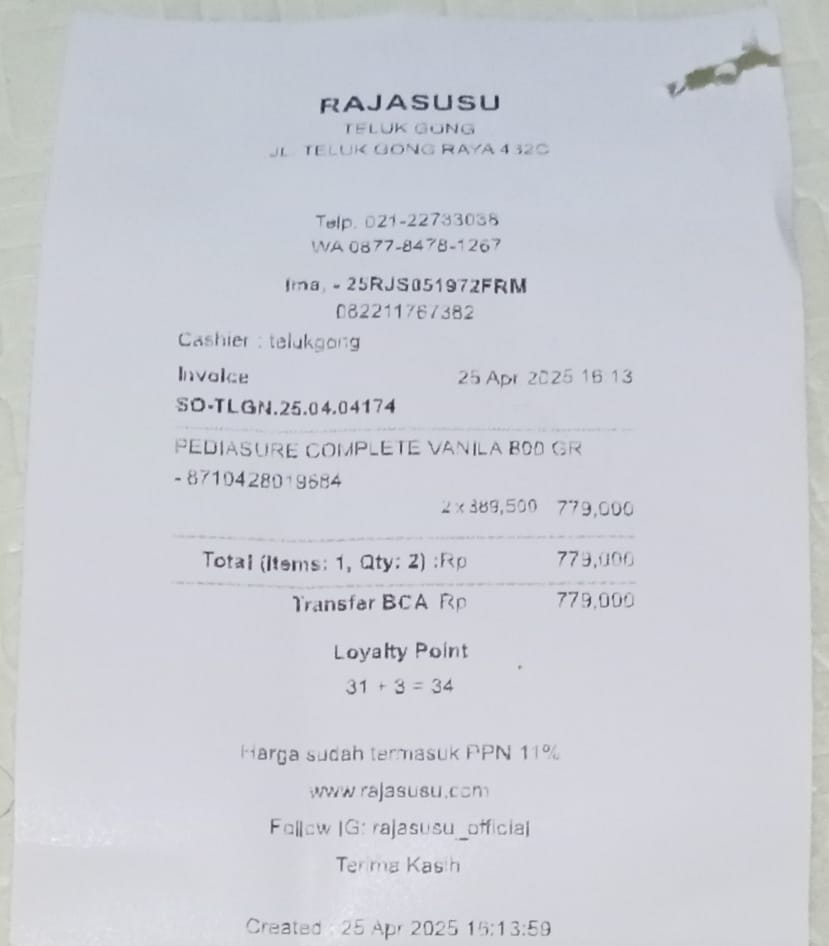 1. Susu Ketocal Rp412.00 x 9kaleng + ongkir = Rp 3.732.000