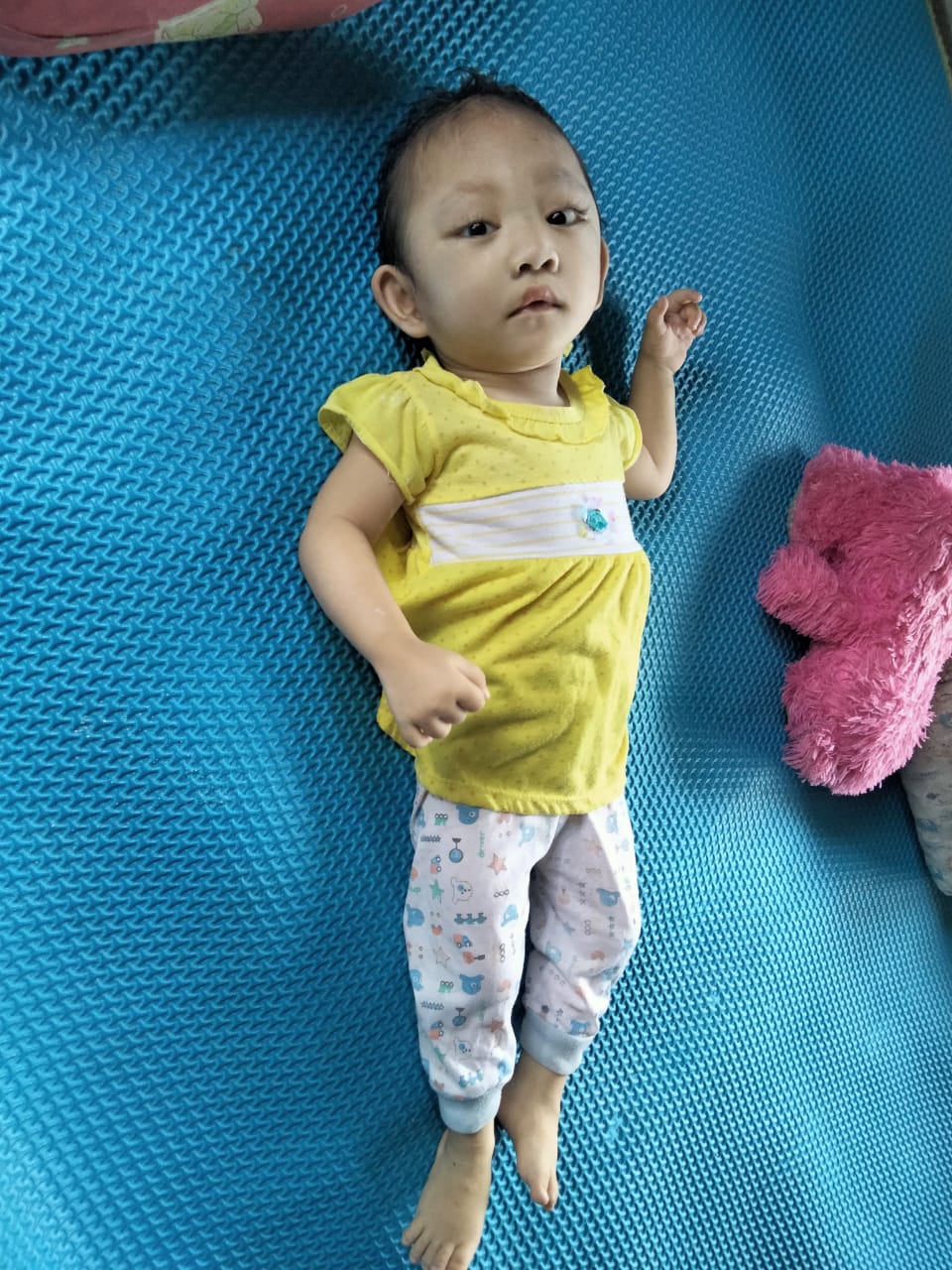 Kadang sedih melihat anakku hanya bisa terbaring kasur. Jangankan untuk berdiri dan bermain dengan teman-temannya, duduk saja anakku belum bisa.