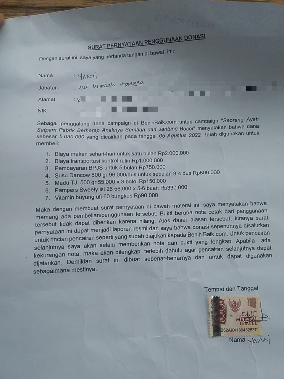 Dana dari TemanBaik digunakan dengan baik untuk membeli kebutuhan seperti popok, susu, madu, biaya makan, transportasi, pembayaran BPJS dan lain-lain.