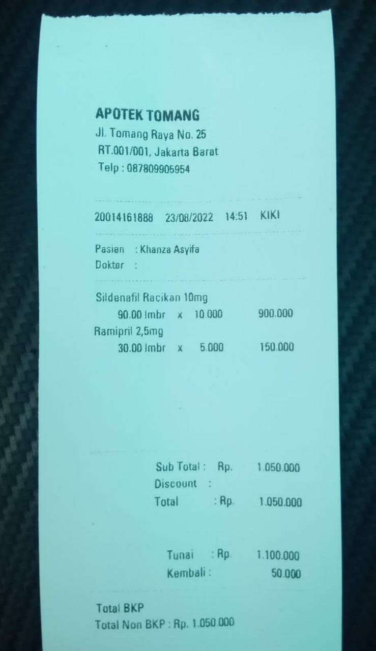 Rp 1.550.000 untuk membeli obat (sildenafil 900.000 ramifril 150.000 dan vitamin 500.000 sesuai resep dokter) Rp 2.000.000 untuk *biaya kost selama 1 bulan (ada nota, untuk pembayaran bulan ke-2) Susu2022-06-29 07:49:46