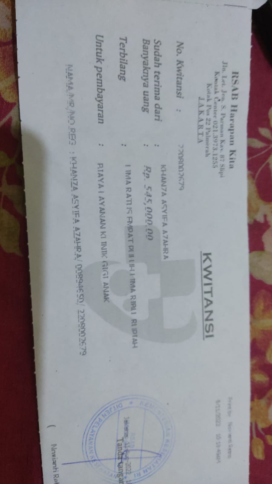 Biaya Rumah sakit Khanza yang dirujuk ke RSAB Harapan Kita karena demam DBD.2022-04-07 16:59:43